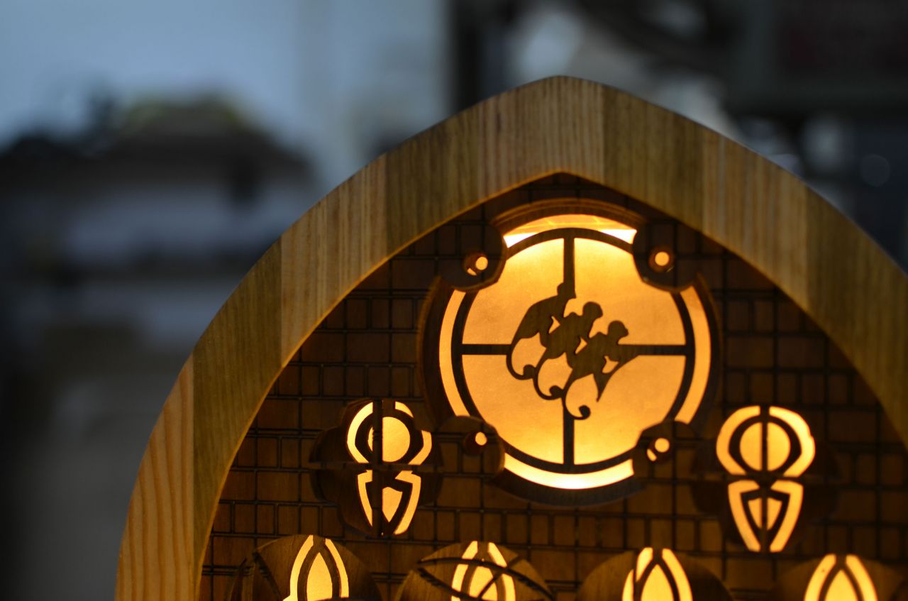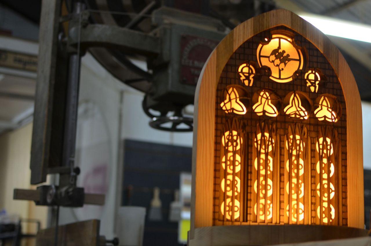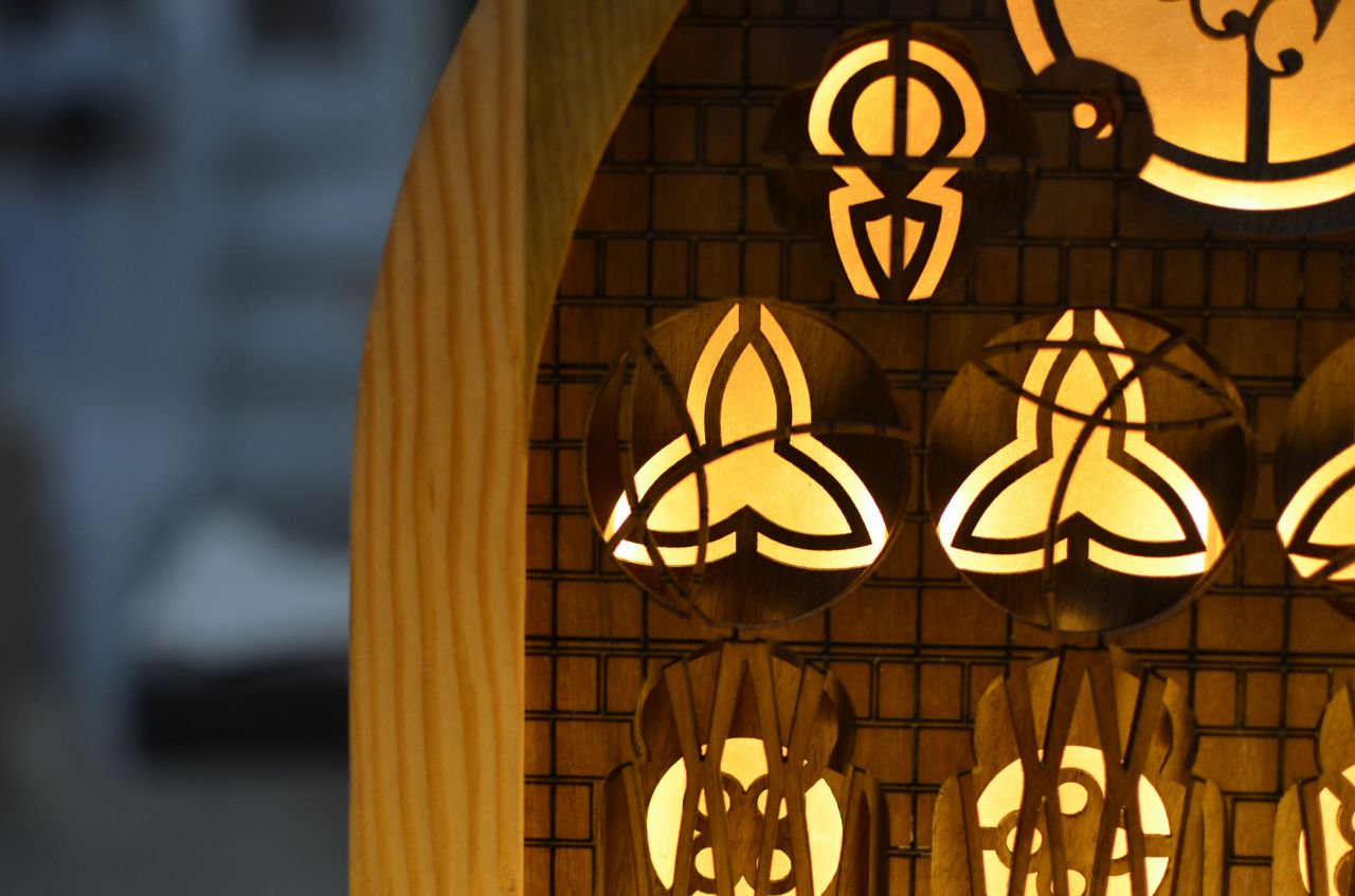 The design of the stand was drawn from the Elgin Cathedral located near the company distilleries in Scotland. The materials used are two different types of plywood mixed together with solid wood (oak, despotaki, smoked oak, American oak and teak).The stand consists of four pieces of plywood, each of which carries different laser engravings and cuts (layering technique that gives the feeling of three-dimensional). The frame of the construction was produced by following classic carpentry techniques. In addition, hidden lighting has been installed to actualize the sense of a stained glass window.