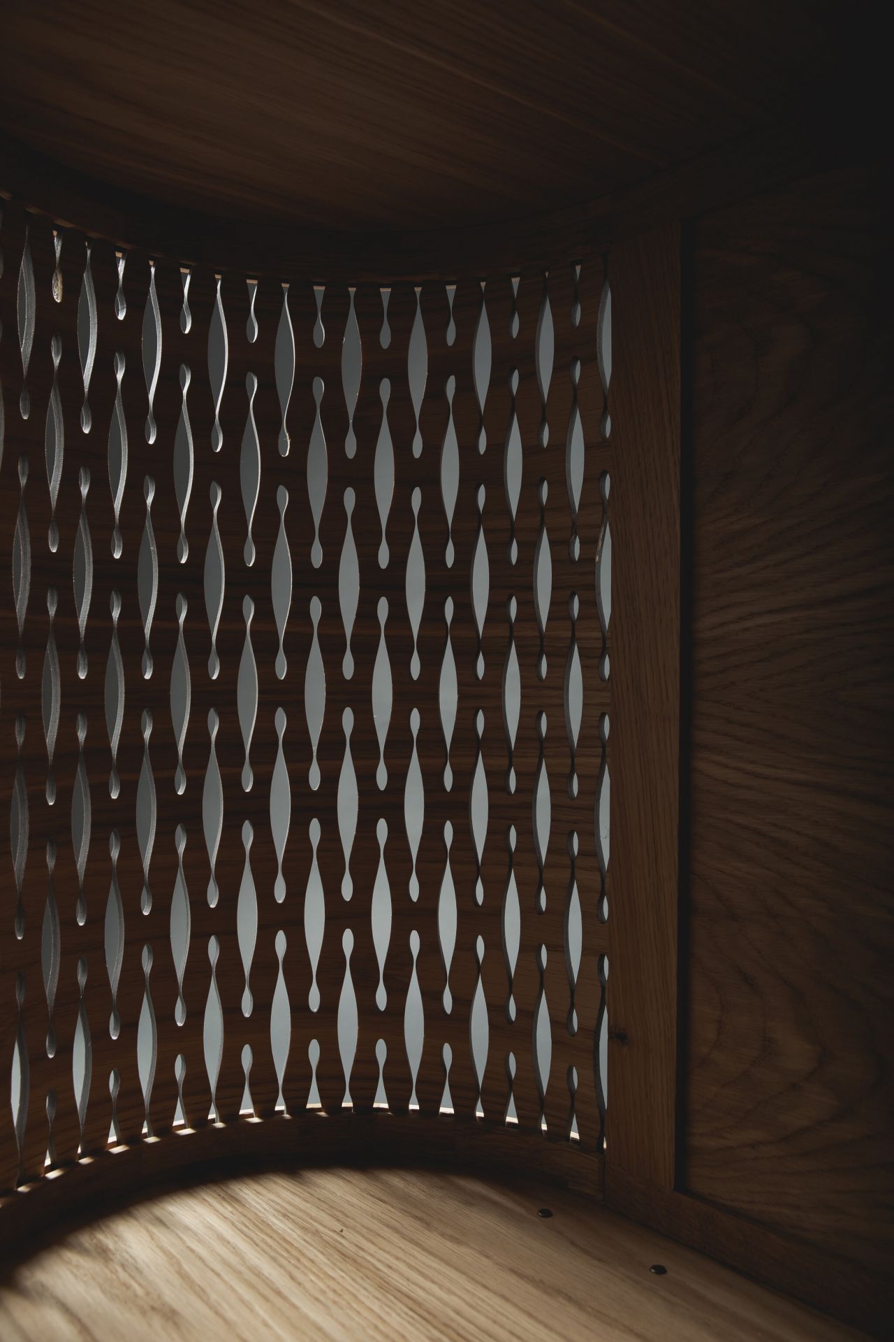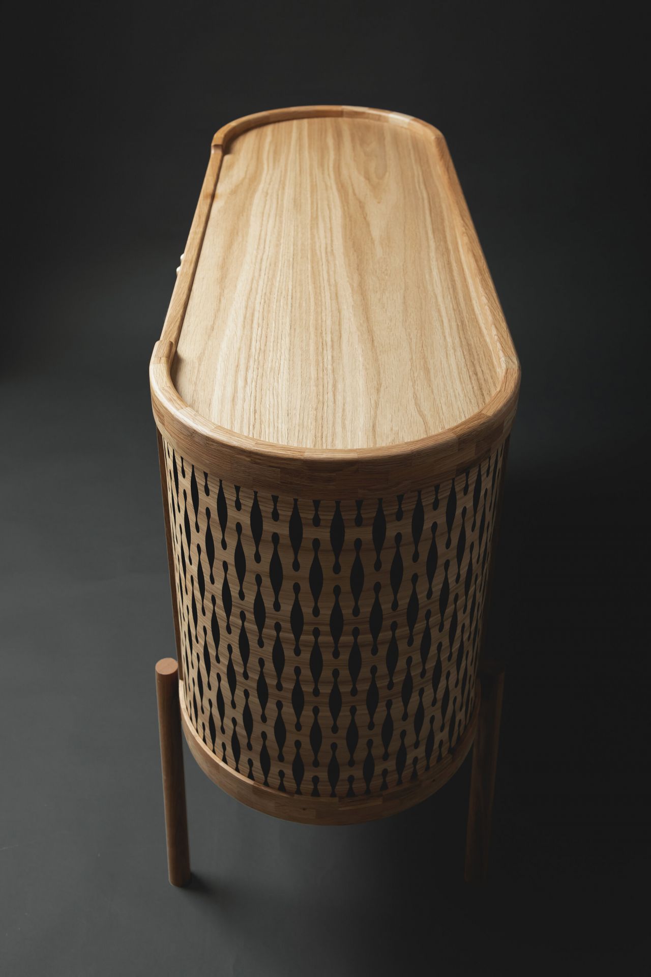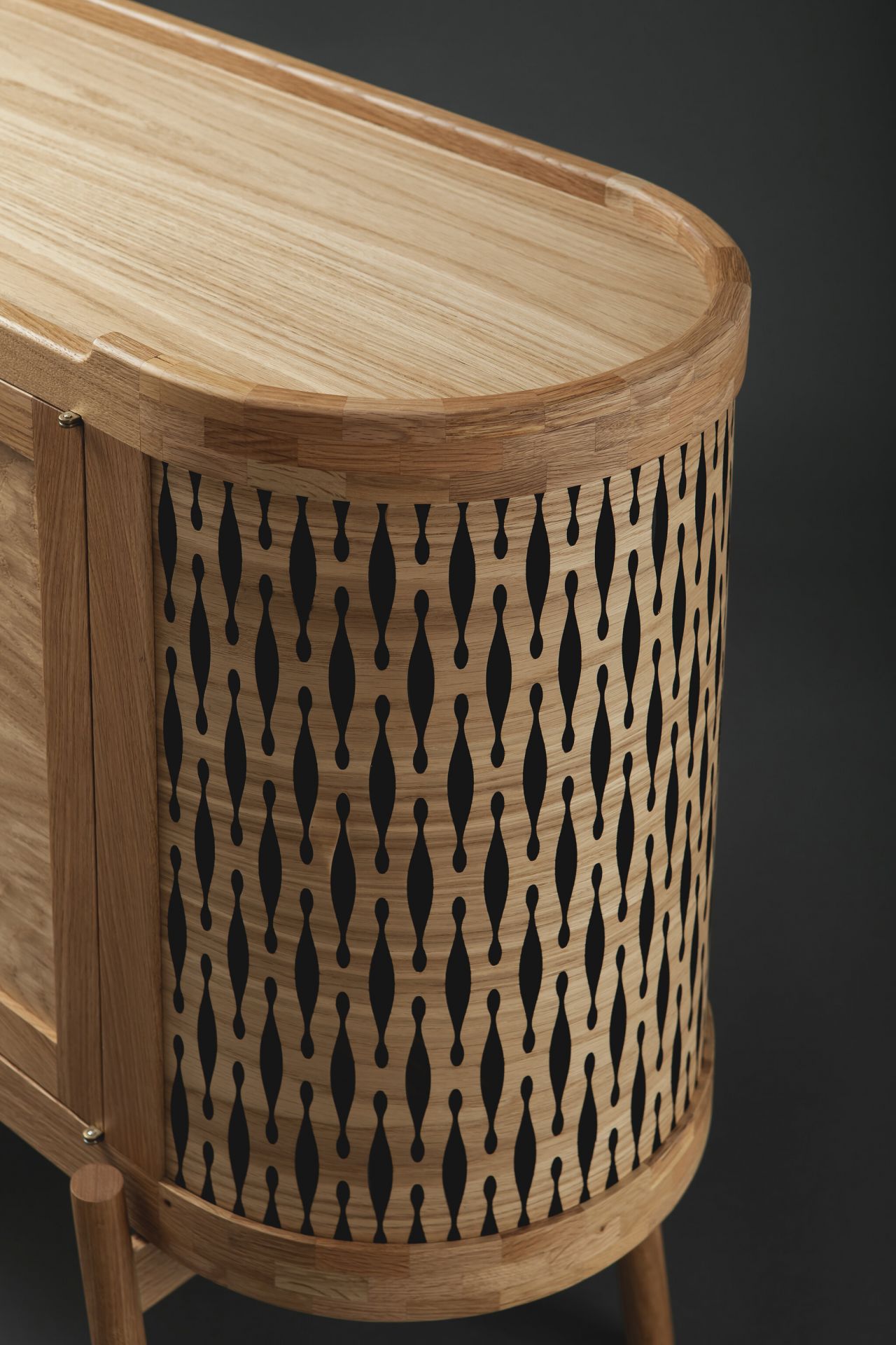 Bar cabinet designed and constructed out of solid oak wood and plywood with oak veneer. The project design combines different trends, such as Japanese, Art Deco, Minimal and Mid Centrury Modern, always following the aesthetics of our Studio. As for the construction, the furniture has on its sides, a geometric perforated pattern which is adapted to the design to serve the curved form of the furniture. The semicircular parts of the solid frame were made by using the segmented wood technique, which is borrowed from the turning process. The high aesthetic effect purely refers to one of our initial projects and in particular one of ORPHANS'1618 shoulder bags.