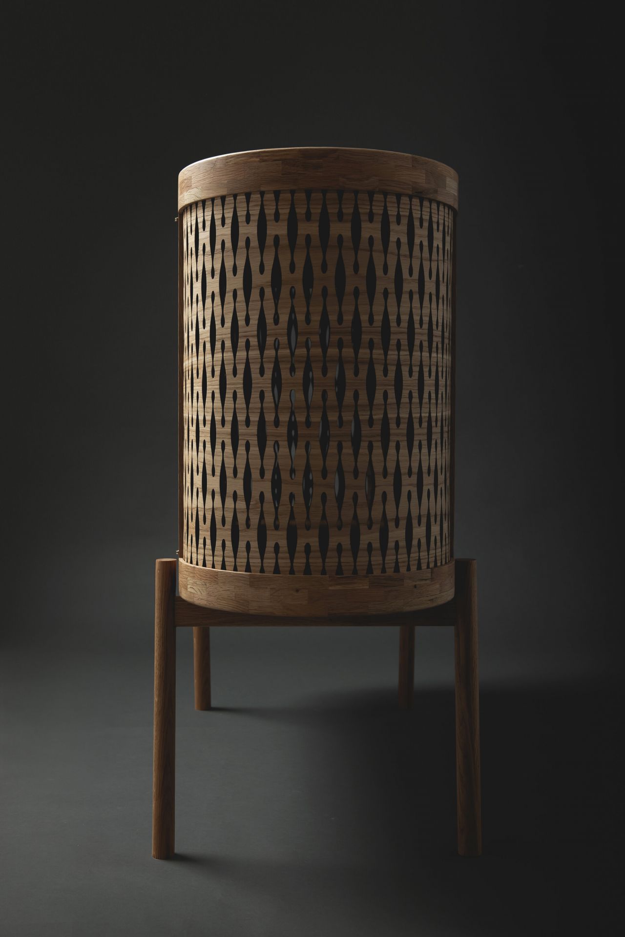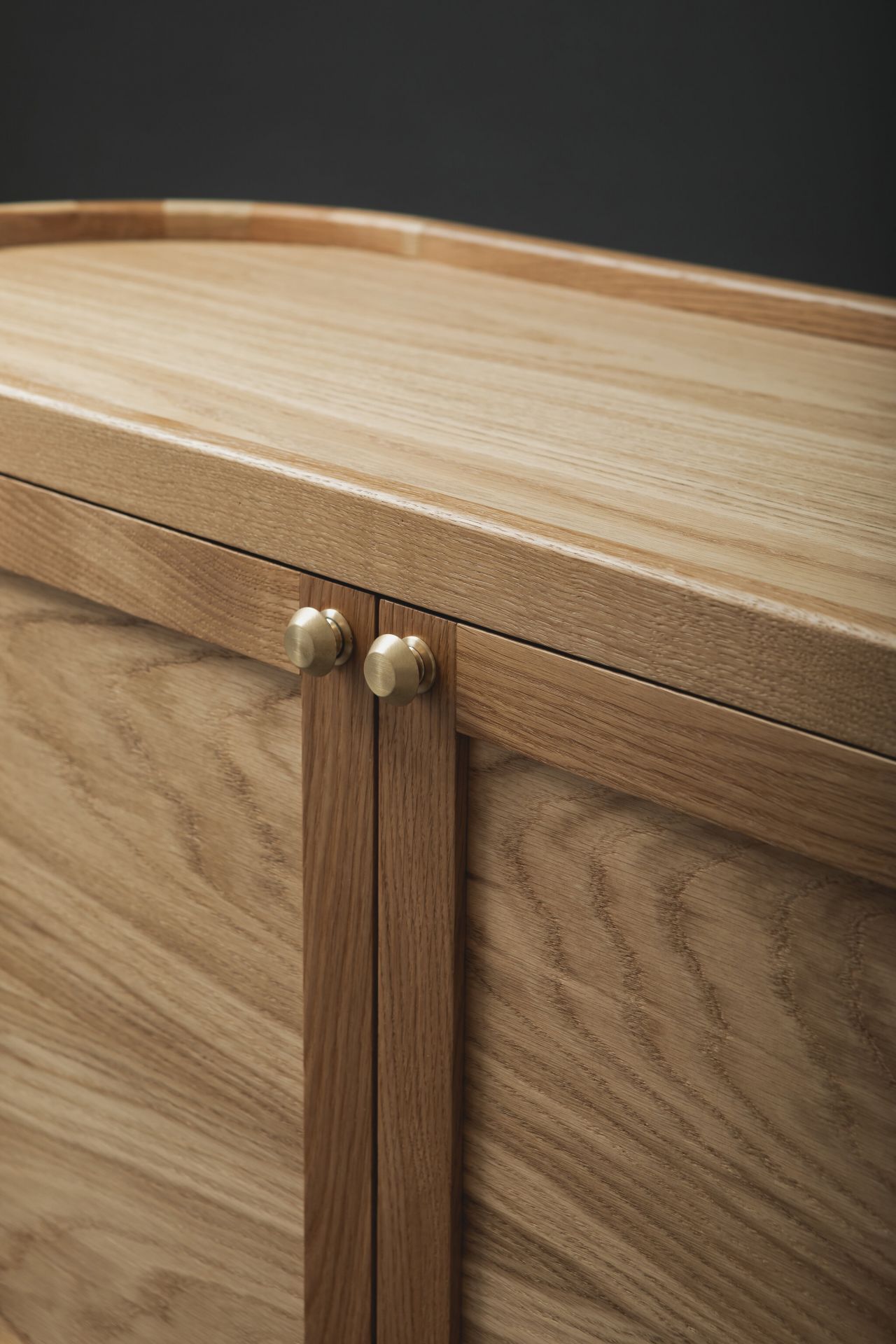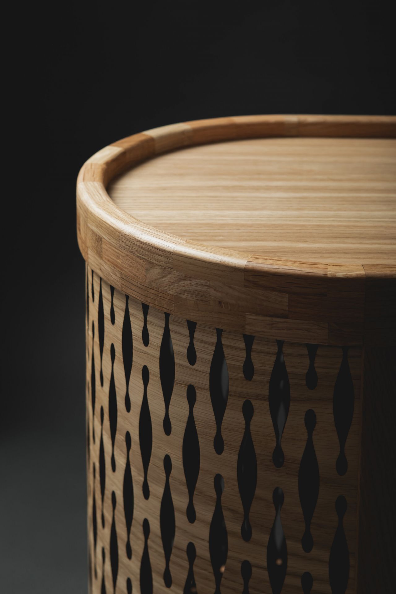 Bar cabinet designed and constructed out of solid oak wood and plywood with oak veneer. The project design combines different trends, such as Japanese, Art Deco, Minimal and Mid Centrury Modern, always following the aesthetics of our Studio. As for the construction, the furniture has on its sides, a geometric perforated pattern which is adapted to the design to serve the curved form of the furniture. The semicircular parts of the solid frame were made by using the segmented wood technique, which is borrowed from the turning process. The high aesthetic effect purely refers to one of our initial projects and in particular one of ORPHANS'1618 shoulder bags.