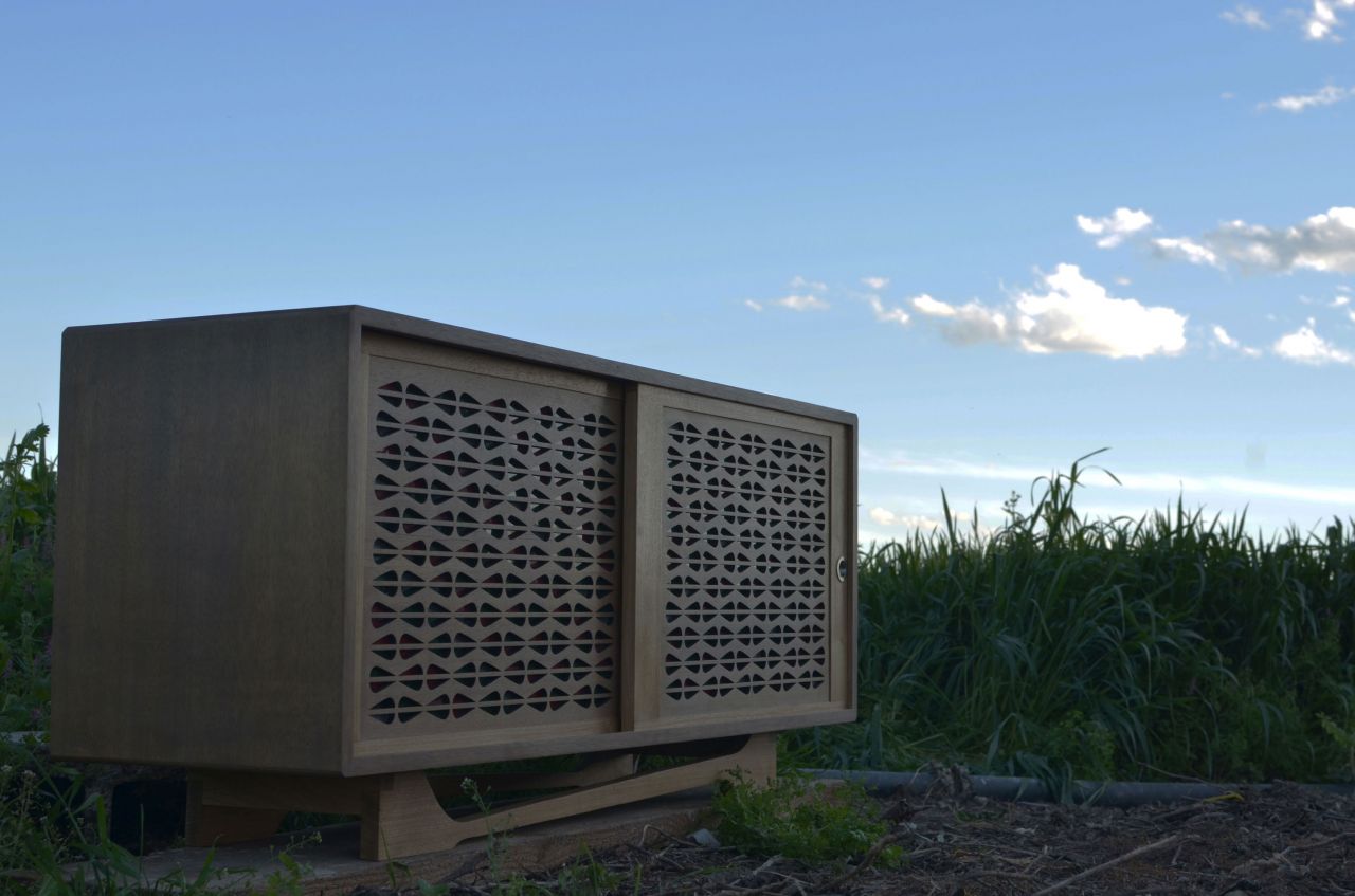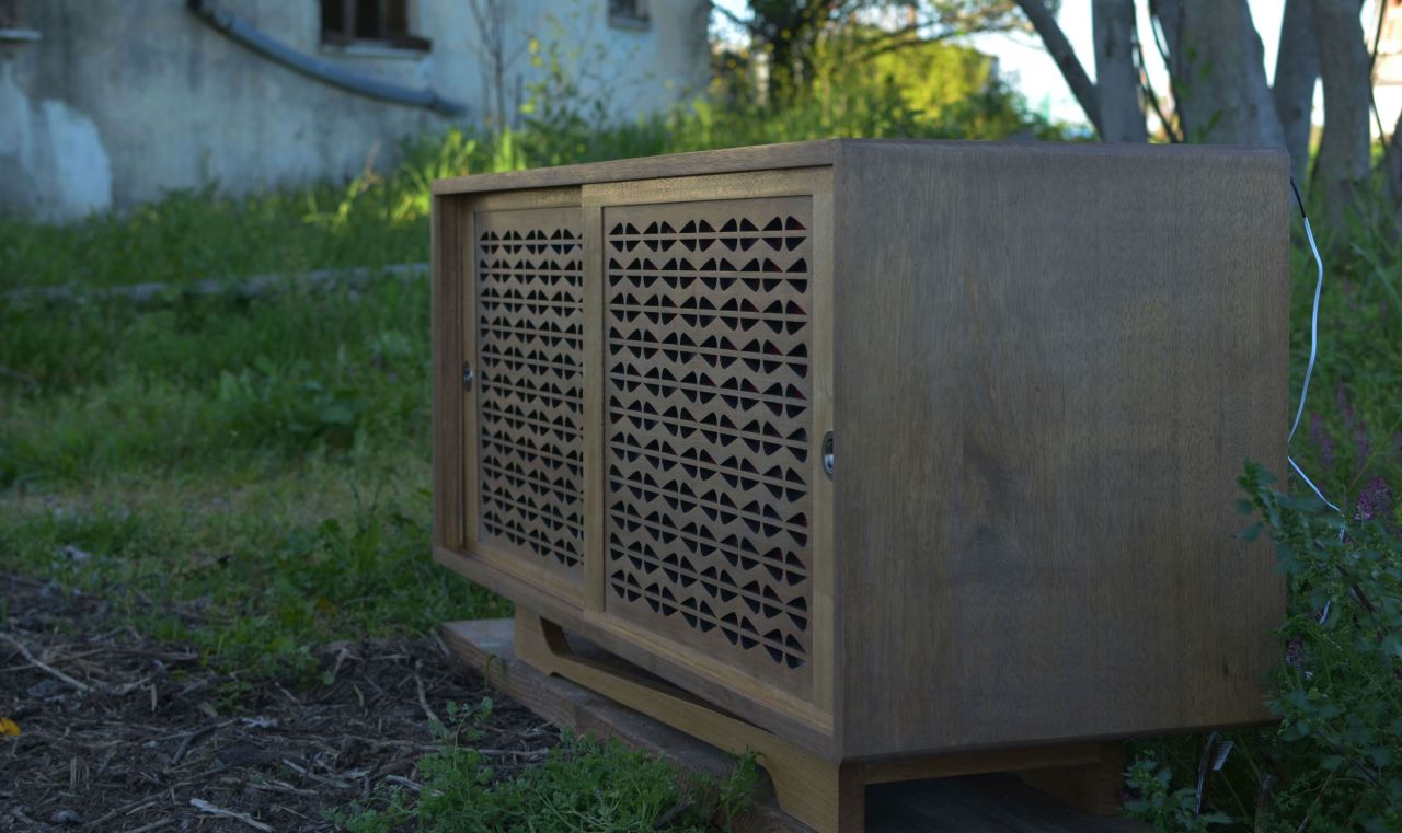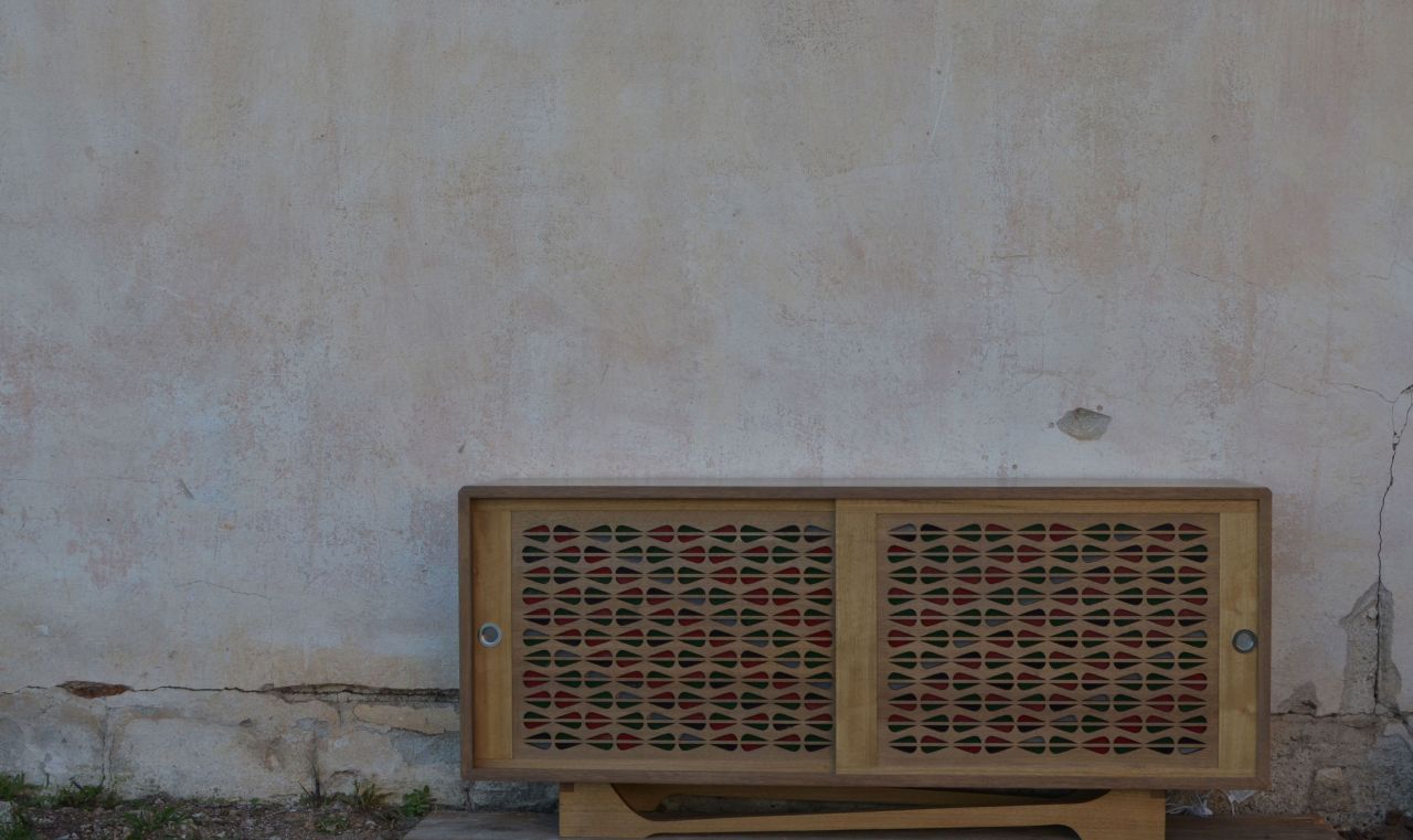 Design and construction of certain period piece of furniture in a modernised version, however. The whole project refers to Mid Century Modern movement muching some Art Deco elements. The structure of the construction follows simple lines, which contrast with the changing geometric pattern that adorns the doors and its ornated legs. The buffet as a whole is made of solid Iroko wood. Within the pattern on its doors, hidden grooves have been created in order to insert plexiglass pieces of the same shape. We have used different colours of plexiglas, red green and black to create contrast. Another peculiarity of the furniture is that it is internally illuminated by an RGB LED strip, where the multicolour of the strip combined with the different plexiglas colours give a stunning visual effect. The construction has been finished with silicone matte wax, which makes it waterproof protecting the wood and at the same time adding a natural effect giving the impression of being wet.