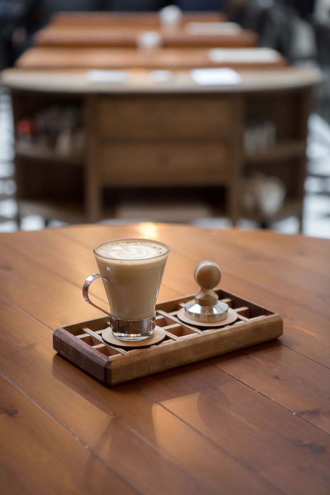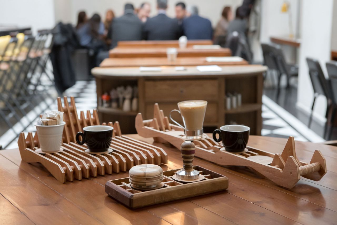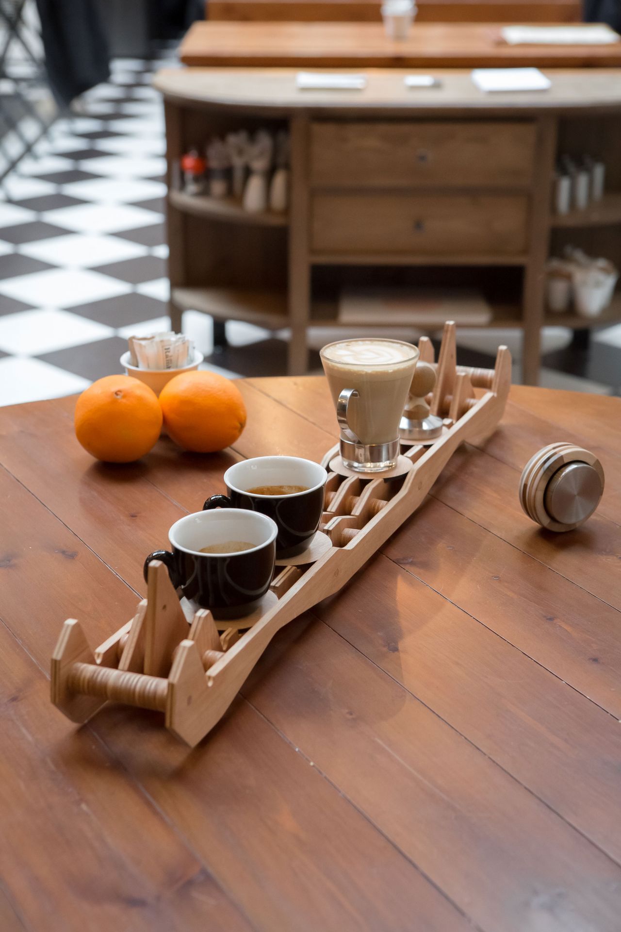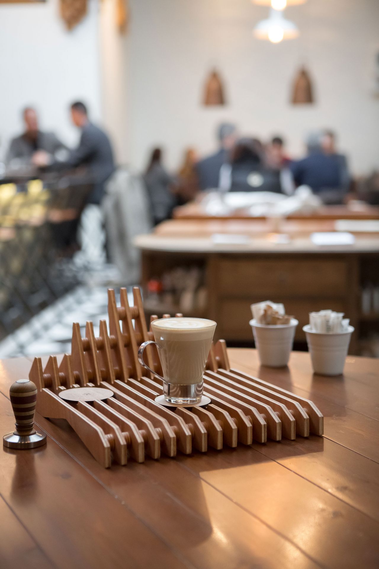 Design and manufacture of presentation equipment for the barista competition of SCA GREECE in HO.RE.CA 2017. Our client commissioned us to design and manufacture coffee presentation trays for their participation in the competition. Regarding the design, there were specific traits as for the dimensions and the layout in which the beverages or tools should be placed on the trays. The equipment consisted of a large serving tray, a smaller tray for the placement of coffee-making tools and four stands for the presentation of the beverage. The serving tray and the stands are made of geometrically cut plywood layers, which have been laser-cut. The individual layers of each structure are of different dimensions and geometrical shapes in order to create levels and have been joined with dowels to create a perforated pattern. By this technique, we intended to add a futuristic dimension to the constructions. On the trays, pre-designated cases have been created for the drinks and water served in the competition, while on the stands there is also enough space to place prints with the information that the contestant wants to present. The tray for the tamper and distributor, is made of solid timber of exotic origin. We have kept the perforated philosophy, creating a frame of wooden strips where there is room to place the two tools. The whole project was hosted and photographed at Las Ramblas cafe in Larissa.