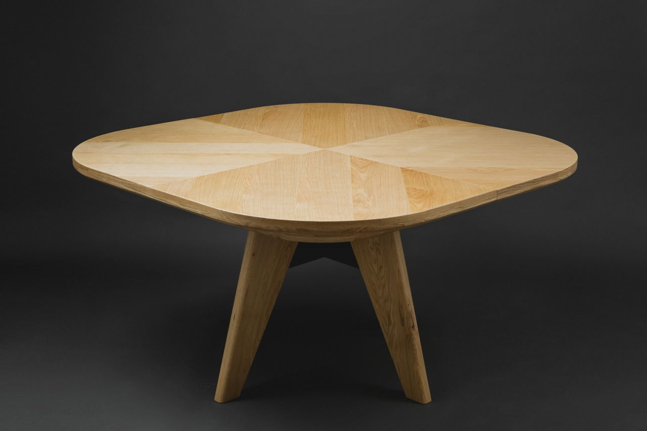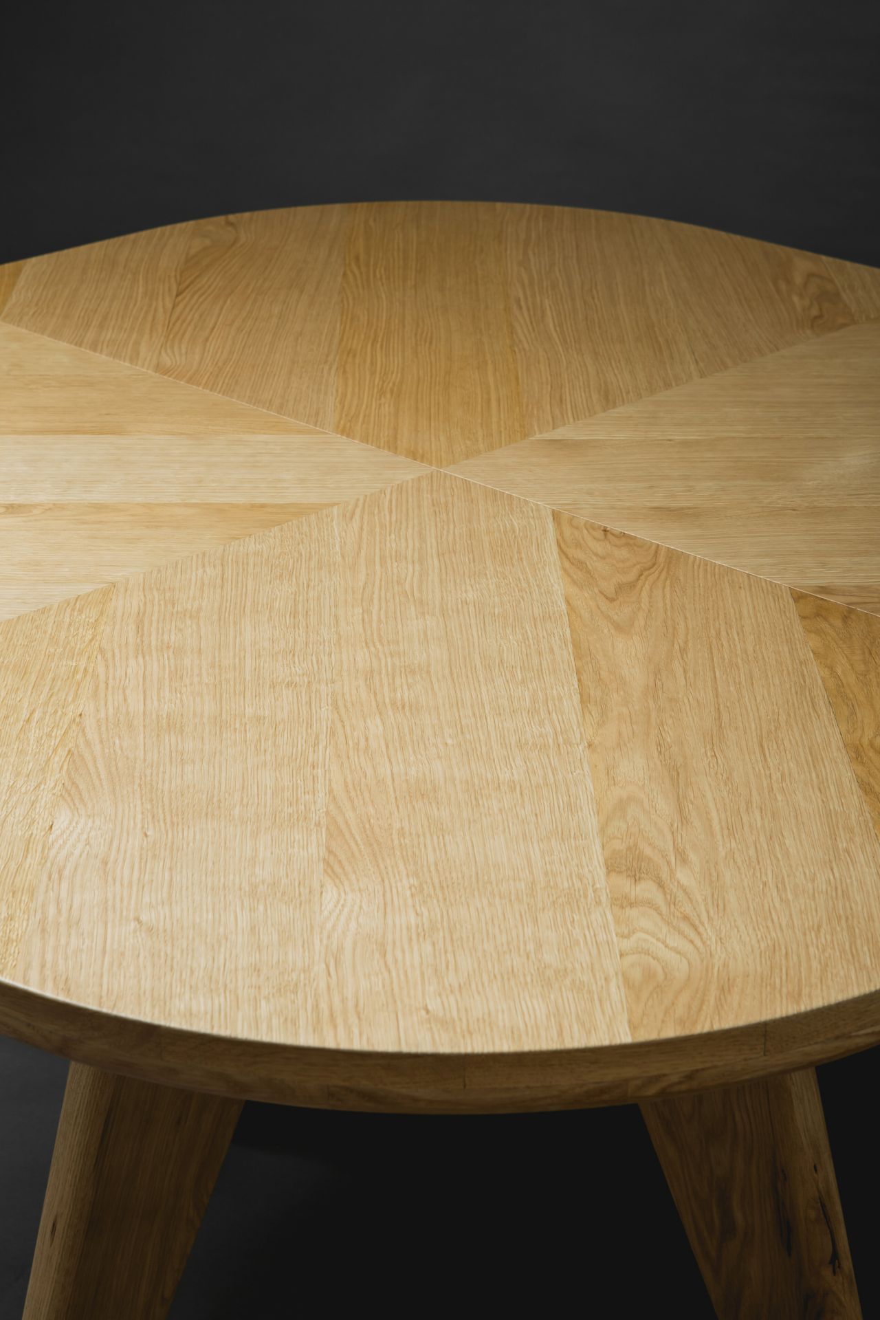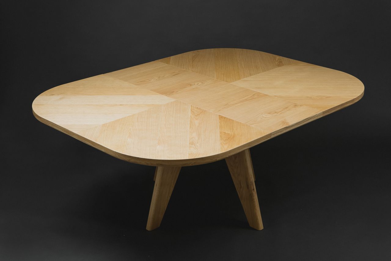 Κατασκευή ανοιγόμενης τραπεζαρίας βάση σχέδιου που μας παρείχε ο πελάτης. Η επιλογή της δρυός σε δύο μορφές (μασίφ και καπλαμάς) συνέβαλαν στο άρτιο τελικό αποτέλεσμα. Το καπάκι της τραπεζαρίας κοσμείται από μοντέρνα μαρκετερί από καπλαμά premium ποιότητας και πάχους 1mm. Τα σόκορα του τραπεζιού έχουν "πλεχτεί" με τεχνική brick bond, η οποία προσφέρει ένα περίτεχνο εικαστικό αποτέλεσμα. Τα δύο ανοιγόμενα φύλλα του τραπεζιού στηρίζονται σε τέσσερις μηχανισμούς βαρέως τύπου καθώς και ειδικών κλείστρων που εξασφαλίζουν την απροβλημάτιστη χρήση του προιόντος με ή χωρίς την επέκταση. Η επέκταση επιτρέπει να προσαρμόζεται το μέγεθος της τραπεζαρίας ανάλογα με τον αριθμό των καλεσμένων. Έτσι, η διάμετρος  της ροτόντας είναι 140 εκατοστά και το ύψος  της 75 εκατοστά ώστε να φιλοξενεί έξι άτομα, ενώ με την προσθήκη της επέκτασης φιλοξενεί οκτώ και διαμορφώνεται σε 140*190 εκατοστά. Τα πόδια της κατασκευής ακολουθούν απόλυτη γεωμετρική φόρμα και δένουν με ειδικά μελετημένο σύνδεσμο από ξύλο ακακίας. Η κατασκευή έχει φινιριστεί με ακρυλικά Matte λούστρα (non yellowing).