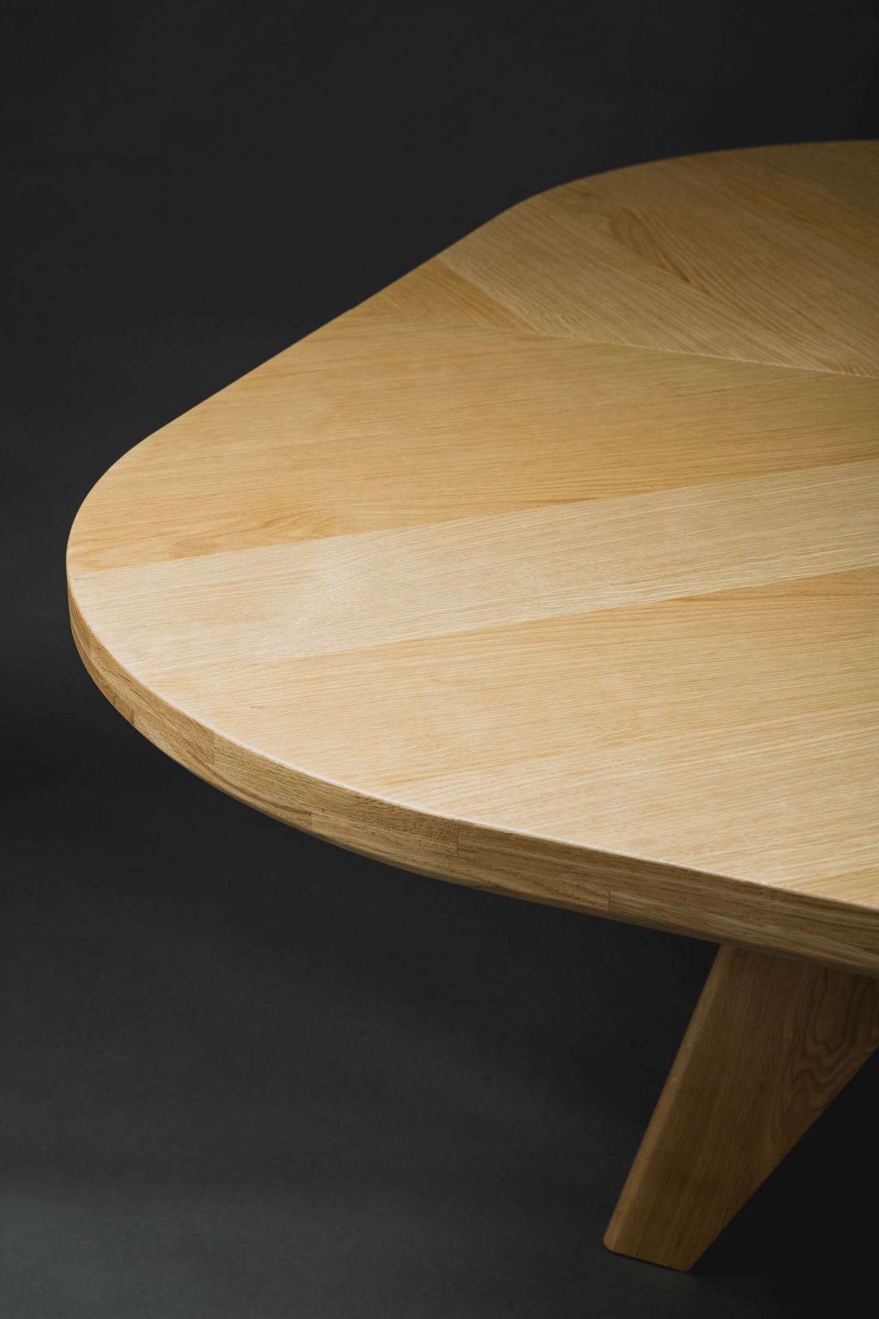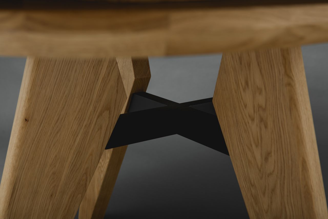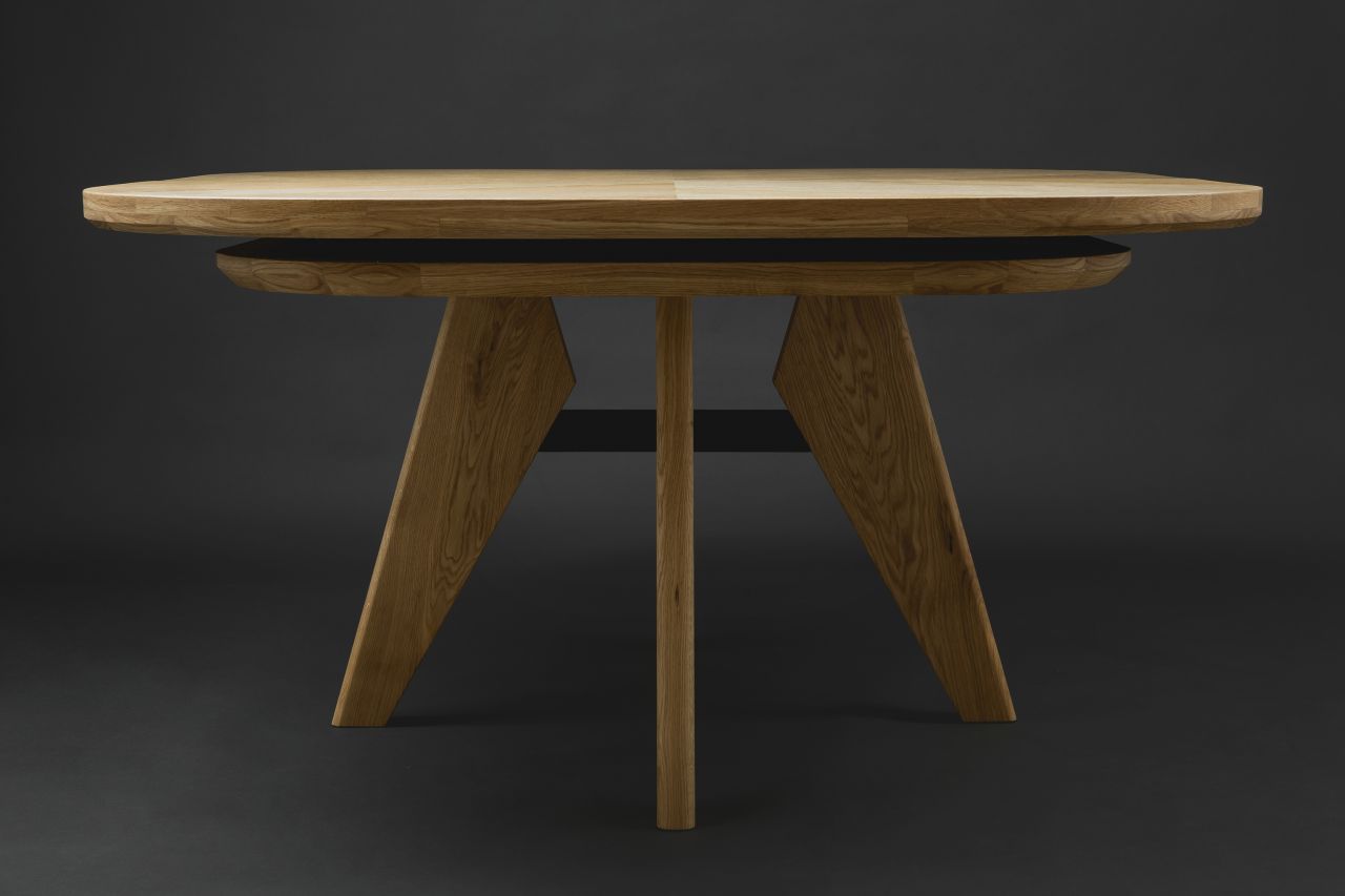 Κατασκευή ανοιγόμενης τραπεζαρίας βάση σχέδιου που μας παρείχε ο πελάτης. Η επιλογή της δρυός σε δύο μορφές (μασίφ και καπλαμάς) συνέβαλαν στο άρτιο τελικό αποτέλεσμα. Το καπάκι της τραπεζαρίας κοσμείται από μοντέρνα μαρκετερί από καπλαμά premium ποιότητας και πάχους 1mm. Τα σόκορα του τραπεζιού έχουν "πλεχτεί" με τεχνική brick bond, η οποία προσφέρει ένα περίτεχνο εικαστικό αποτέλεσμα. Τα δύο ανοιγόμενα φύλλα του τραπεζιού στηρίζονται σε τέσσερις μηχανισμούς βαρέως τύπου καθώς και ειδικών κλείστρων που εξασφαλίζουν την απροβλημάτιστη χρήση του προιόντος με ή χωρίς την επέκταση. Η επέκταση επιτρέπει να προσαρμόζεται το μέγεθος της τραπεζαρίας ανάλογα με τον αριθμό των καλεσμένων. Έτσι, η διάμετρος  της ροτόντας είναι 140 εκατοστά και το ύψος  της 75 εκατοστά ώστε να φιλοξενεί έξι άτομα, ενώ με την προσθήκη της επέκτασης φιλοξενεί οκτώ και διαμορφώνεται σε 140*190 εκατοστά. Τα πόδια της κατασκευής ακολουθούν απόλυτη γεωμετρική φόρμα και δένουν με ειδικά μελετημένο σύνδεσμο από ξύλο ακακίας. Η κατασκευή έχει φινιριστεί με ακρυλικά Matte λούστρα (non yellowing).