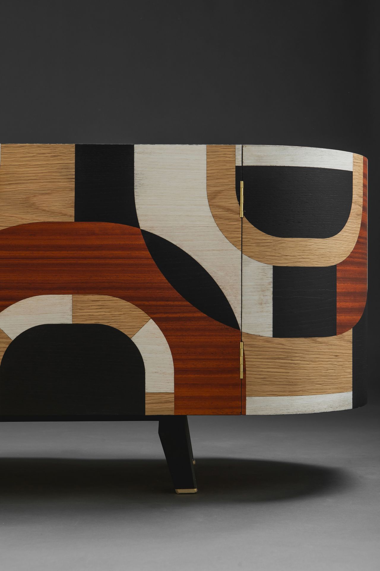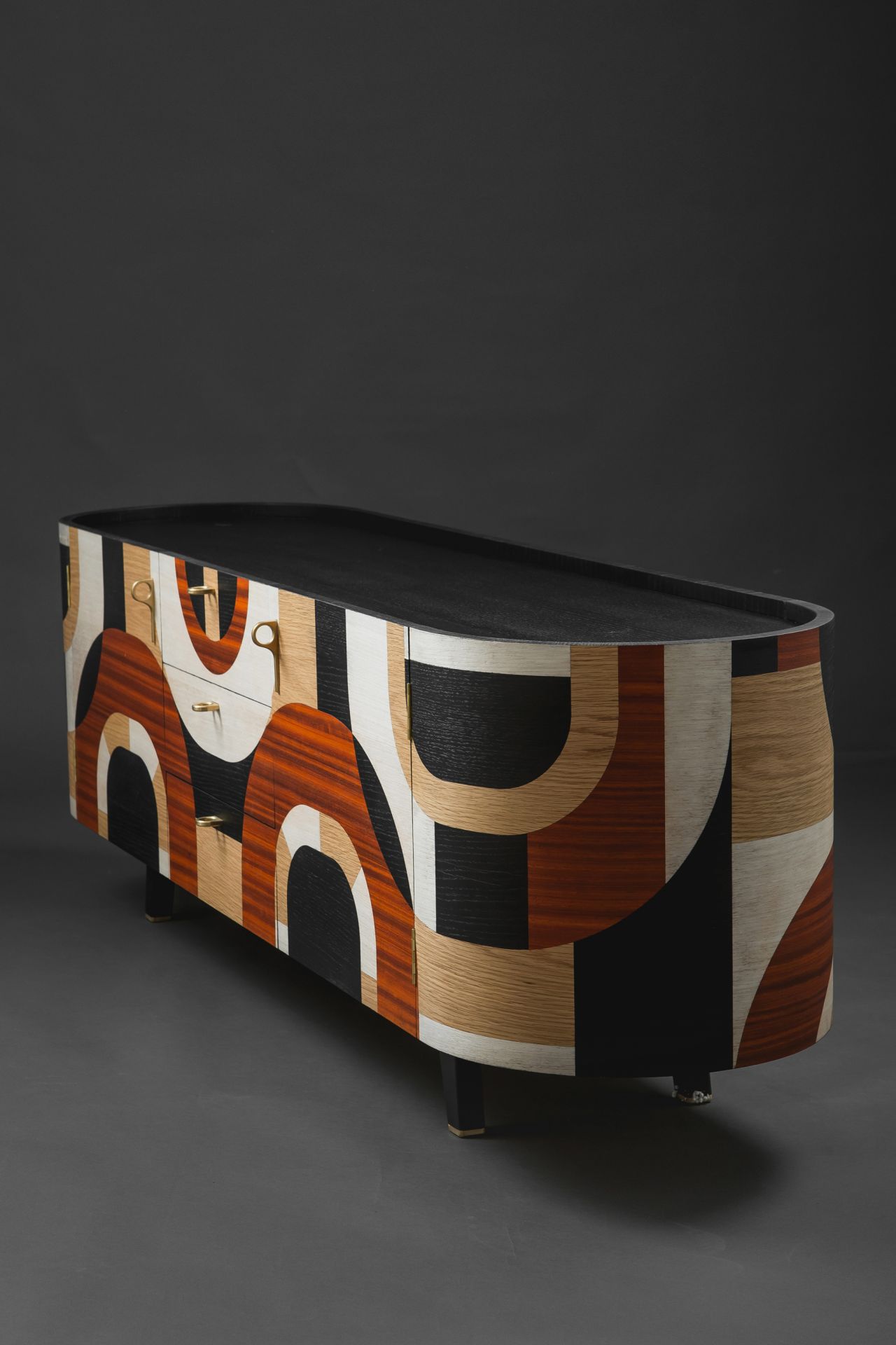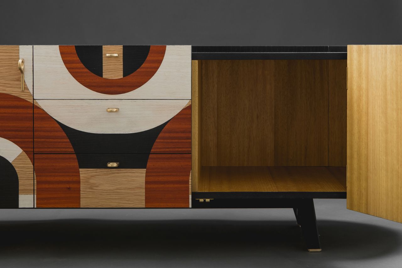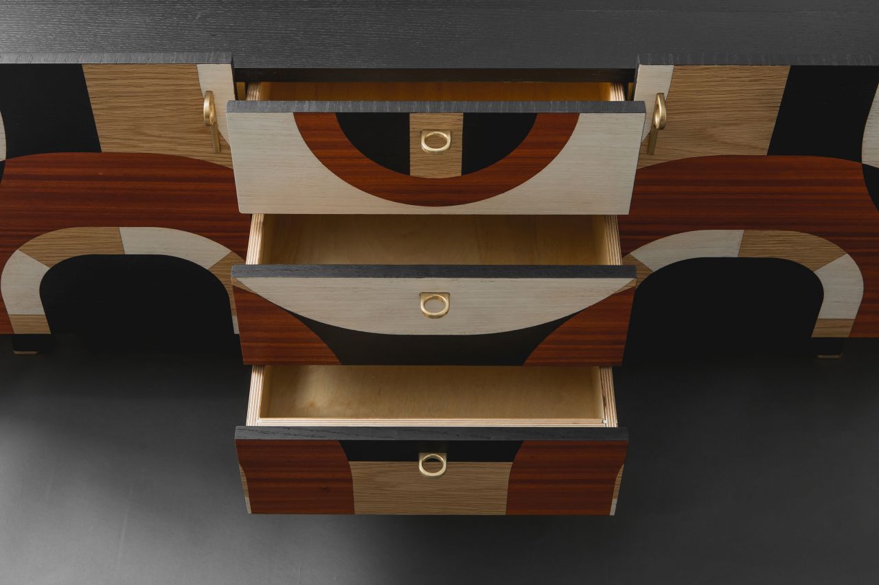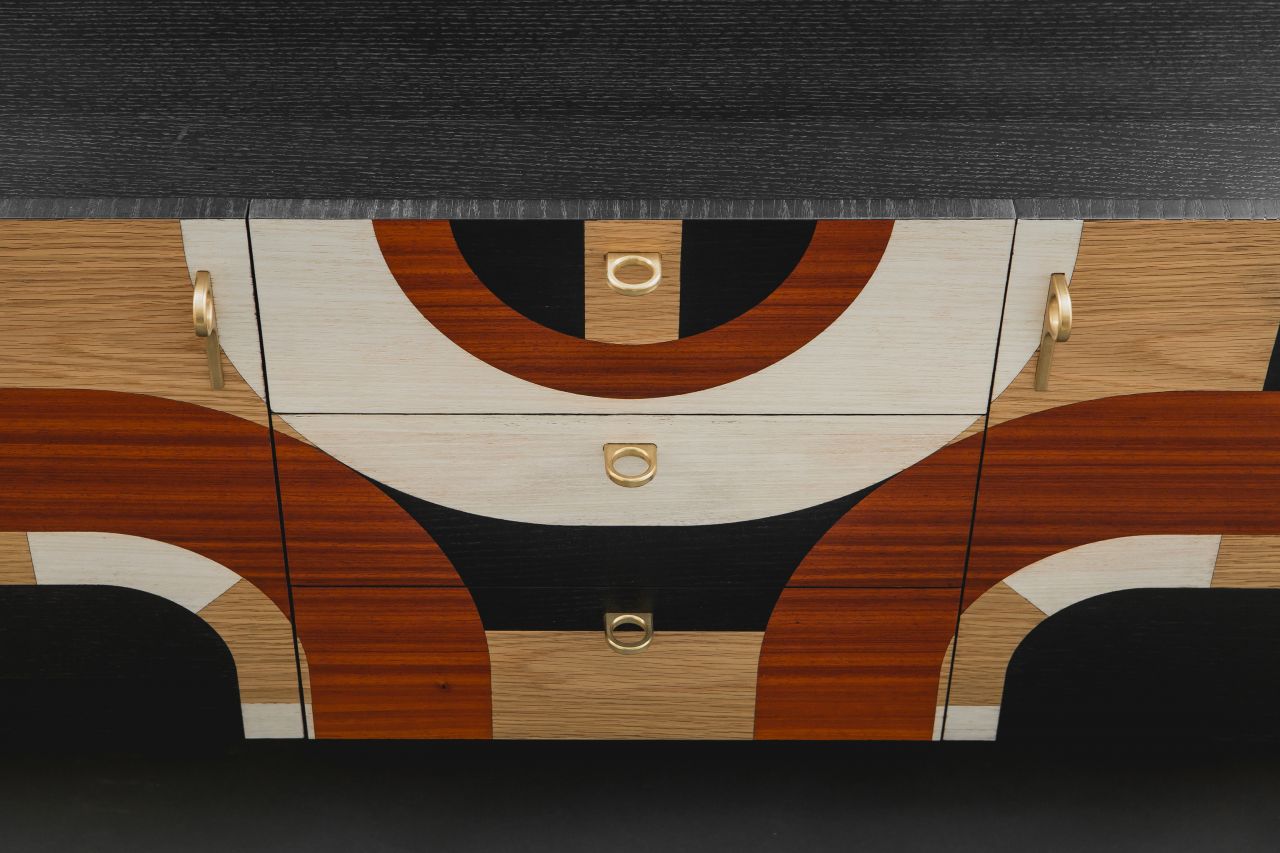 The design and construction of this sideboard decorated with geometric marquetry was inspired by the Art Deco movement. This piece of furniture is oval shaped while its sides come into a semicircular form. The marquetry design runs all over it perimetrically in a non stop pattern, building up laser cut geometrical patterns out of several kinds of plywood, so that contrast is created, based on pattern composition and colours. Plywood used:paduk, oak, eucalyptus, and black imbued oak. Its interior is iroko veneer lined. Its peripheral items, that is, door-knobs, hinges, as well as details applied on its legs are designed & handcrafted in bronze, as they have been specifically designed serving its aesthetics. The legs have been built out of solid oak, which was primarily imbued in black following a clear geometrical form. Its dimensions are:180cm x 45cm x 60cm (LxWxH). The whole sideboard has been painted in matte acrylics (non yellowing).