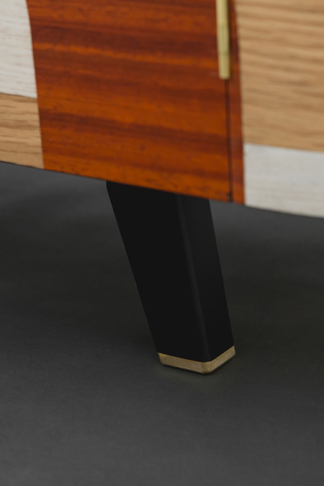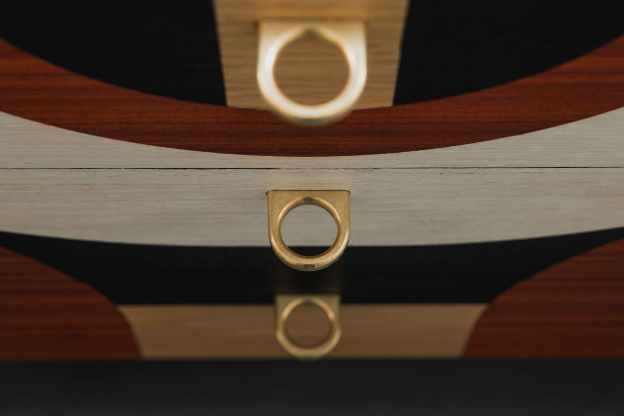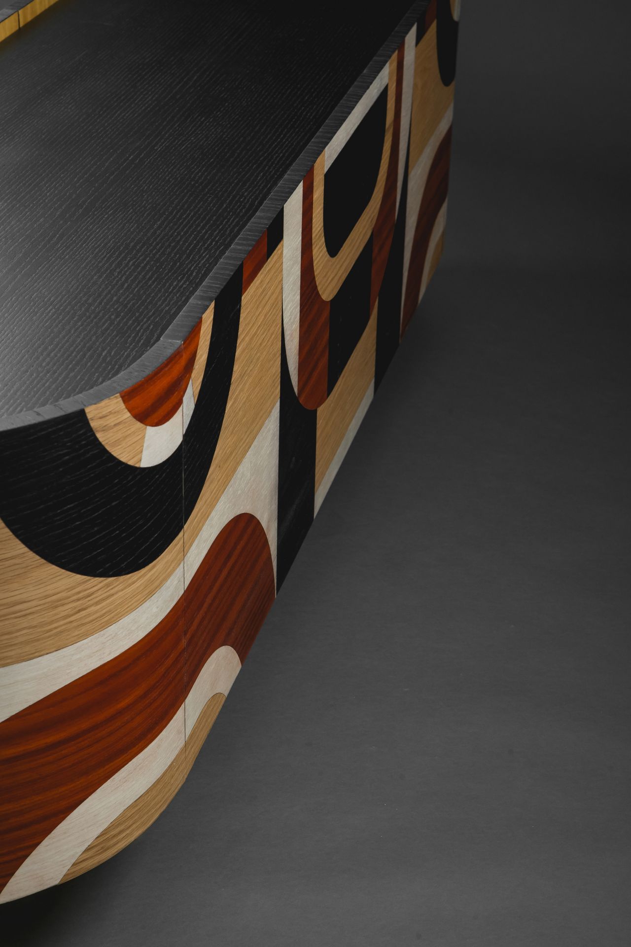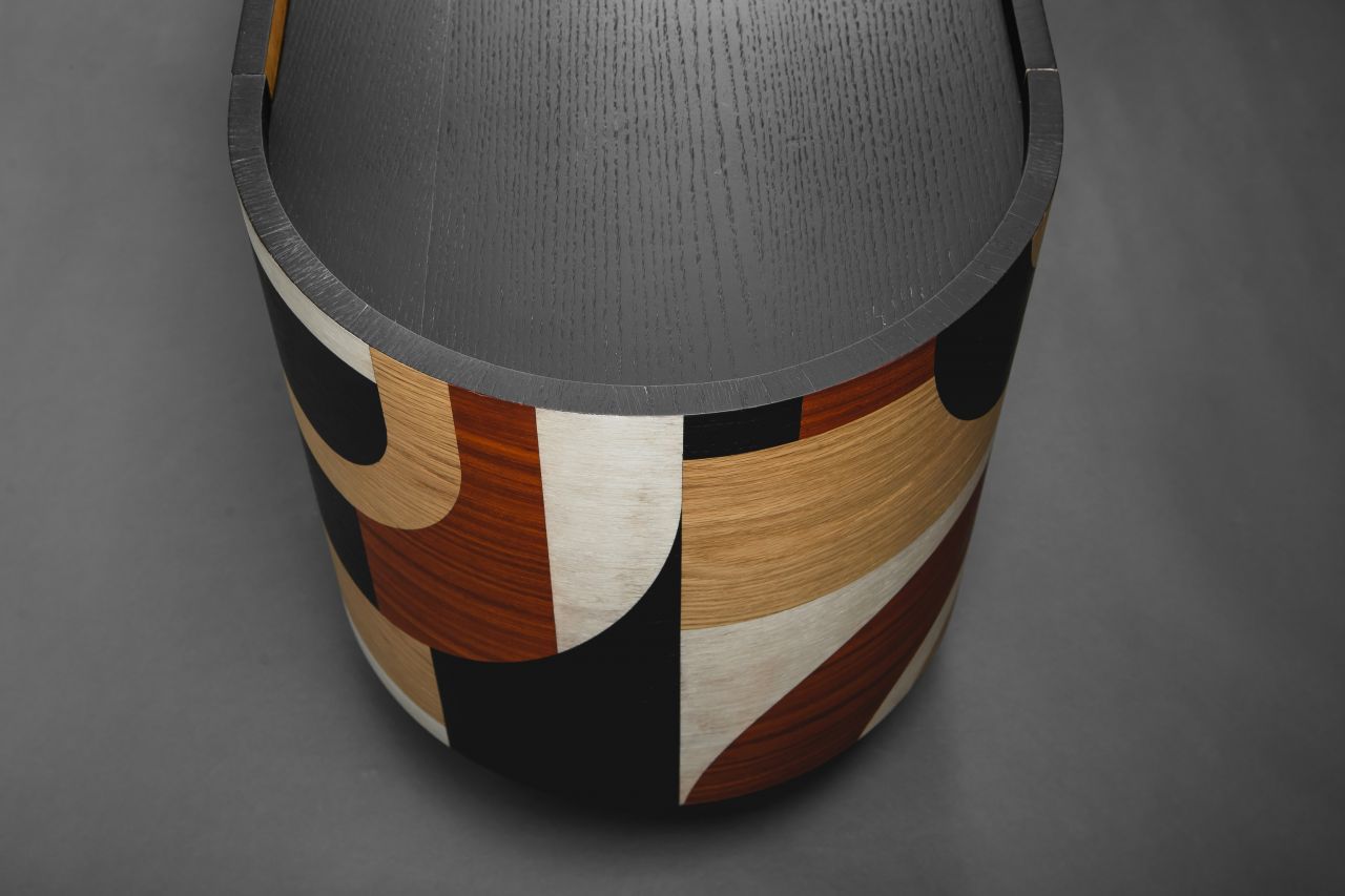 The design and construction of this sideboard decorated with geometric marquetry was inspired by the Art Deco movement. This piece of furniture is oval shaped while its sides come into a semicircular form. The marquetry design runs all over it perimetrically in a non stop pattern, building up laser cut geometrical patterns out of several kinds of plywood, so that contrast is created, based on pattern composition and colours. Plywood used:paduk, oak, eucalyptus, and black imbued oak. Its interior is iroko veneer lined. Its peripheral items, that is, door-knobs, hinges, as well as details applied on its legs are designed & handcrafted in bronze, as they have been specifically designed serving its aesthetics. The legs have been built out of solid oak, which was primarily imbued in black following a clear geometrical form. Its dimensions are:180cm x 45cm x 60cm (LxWxH). The whole sideboard has been painted in matte acrylics (non yellowing).