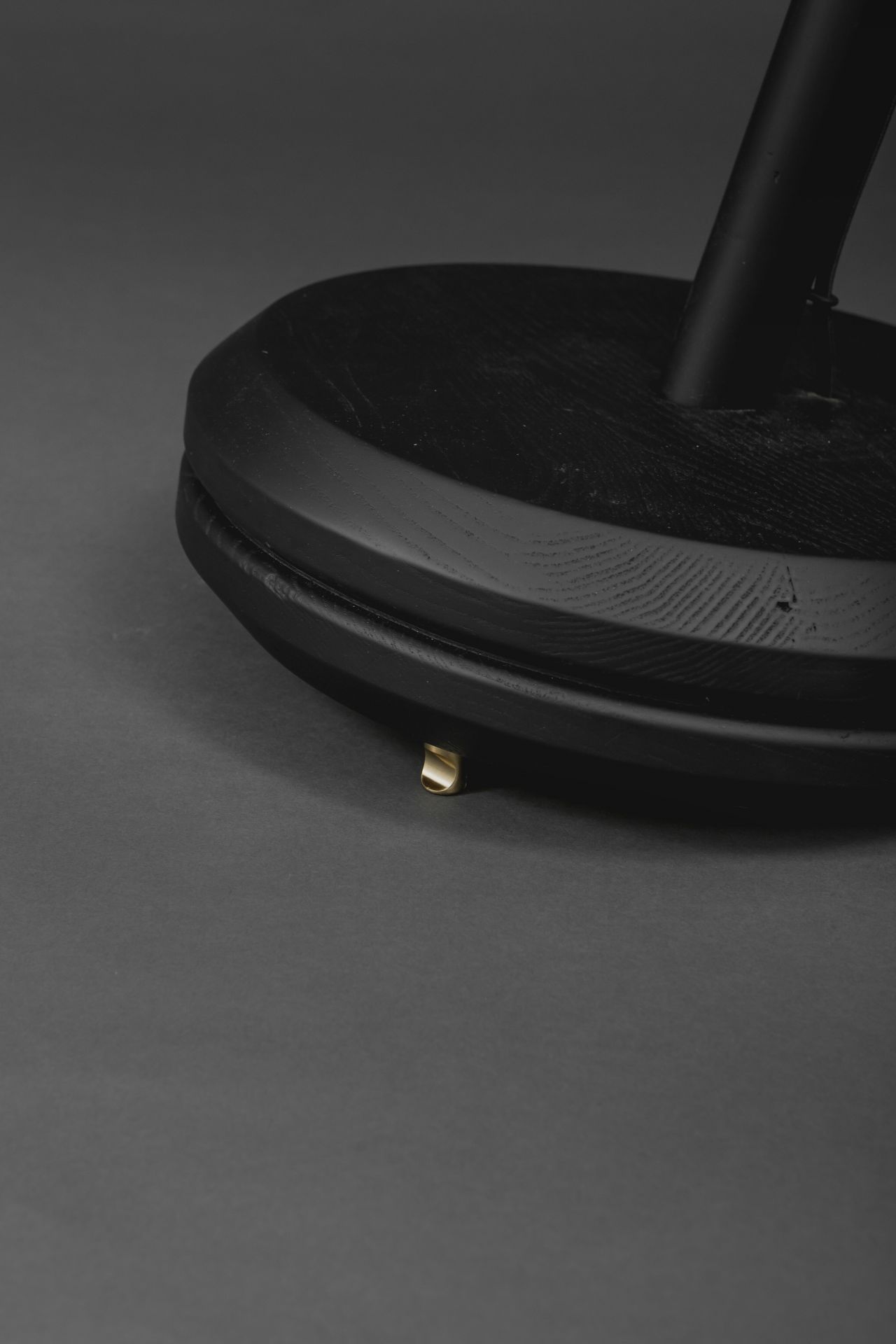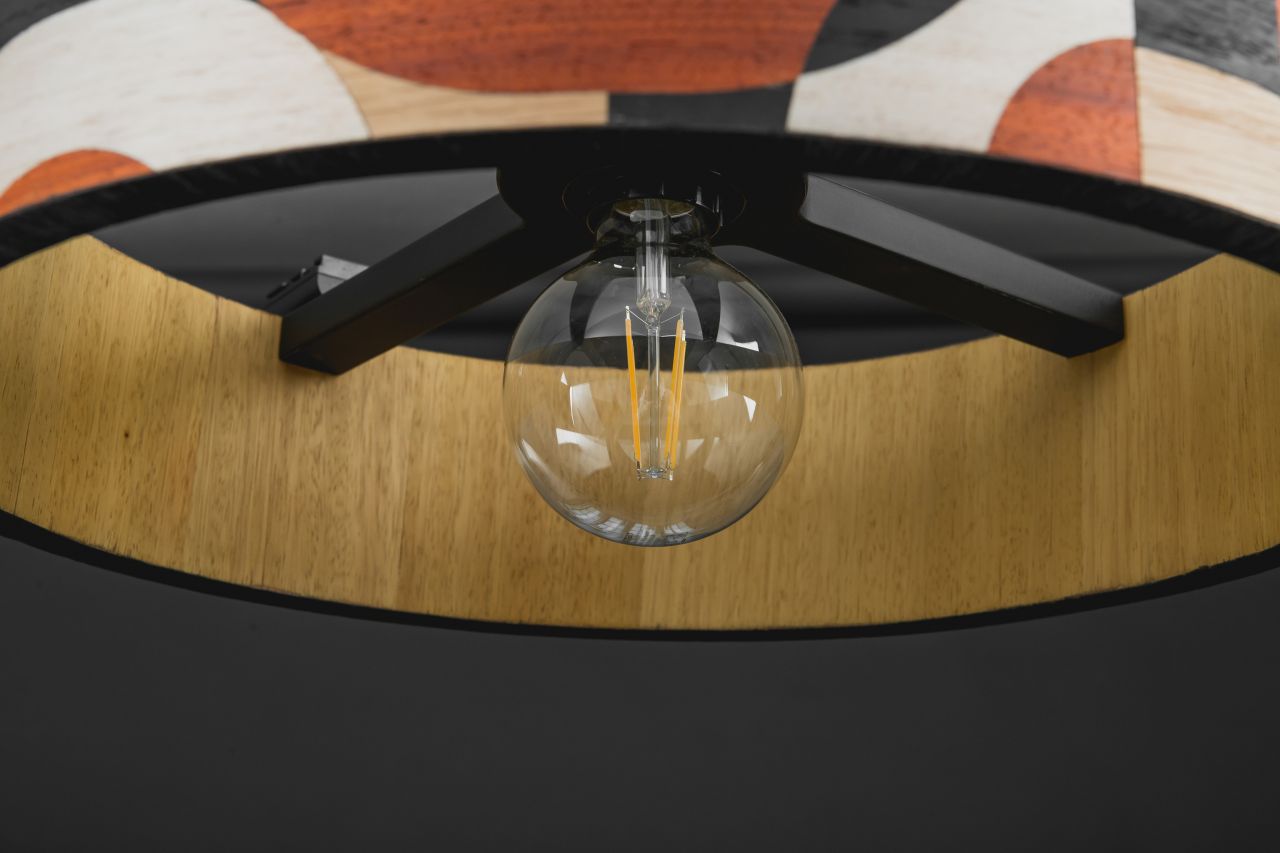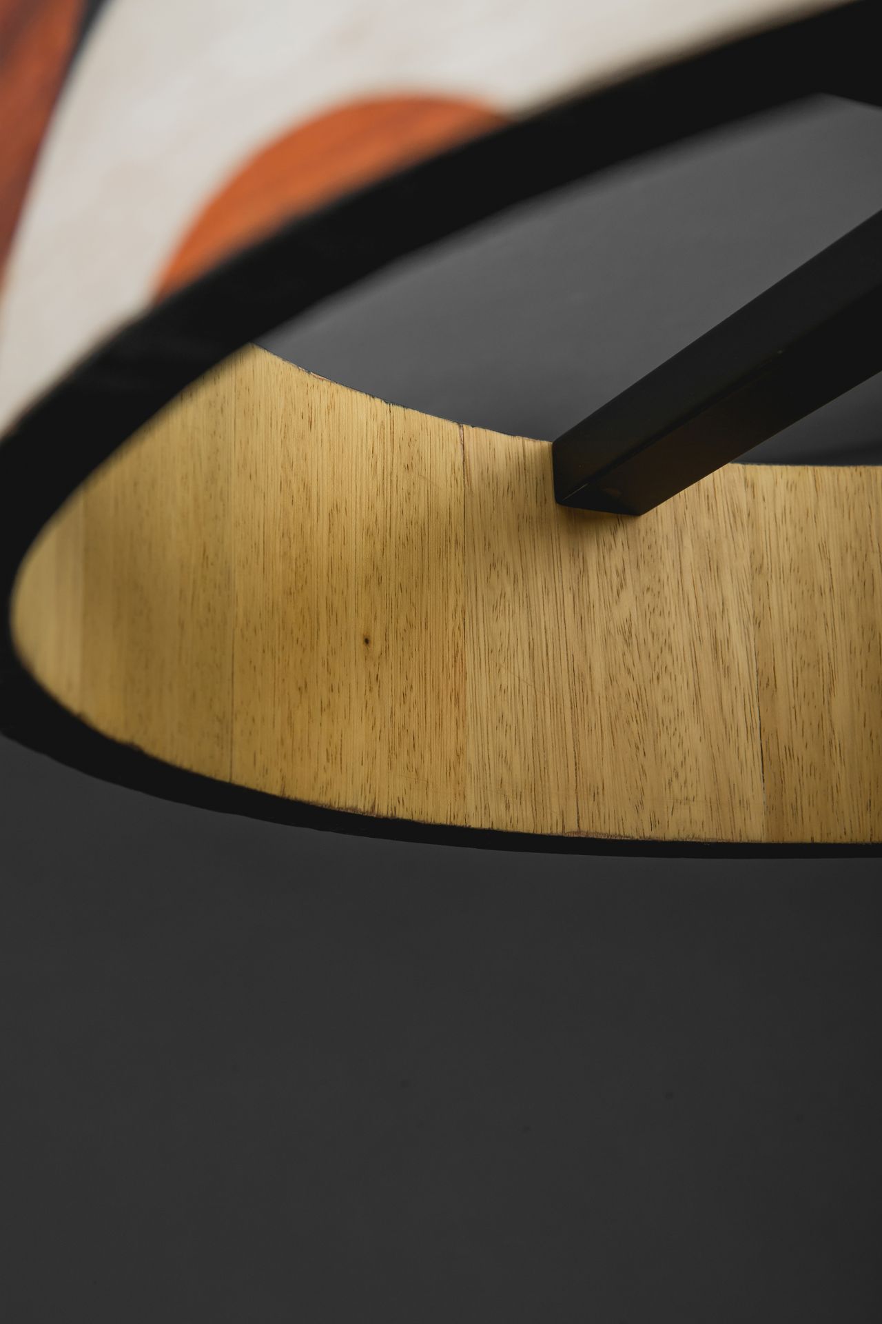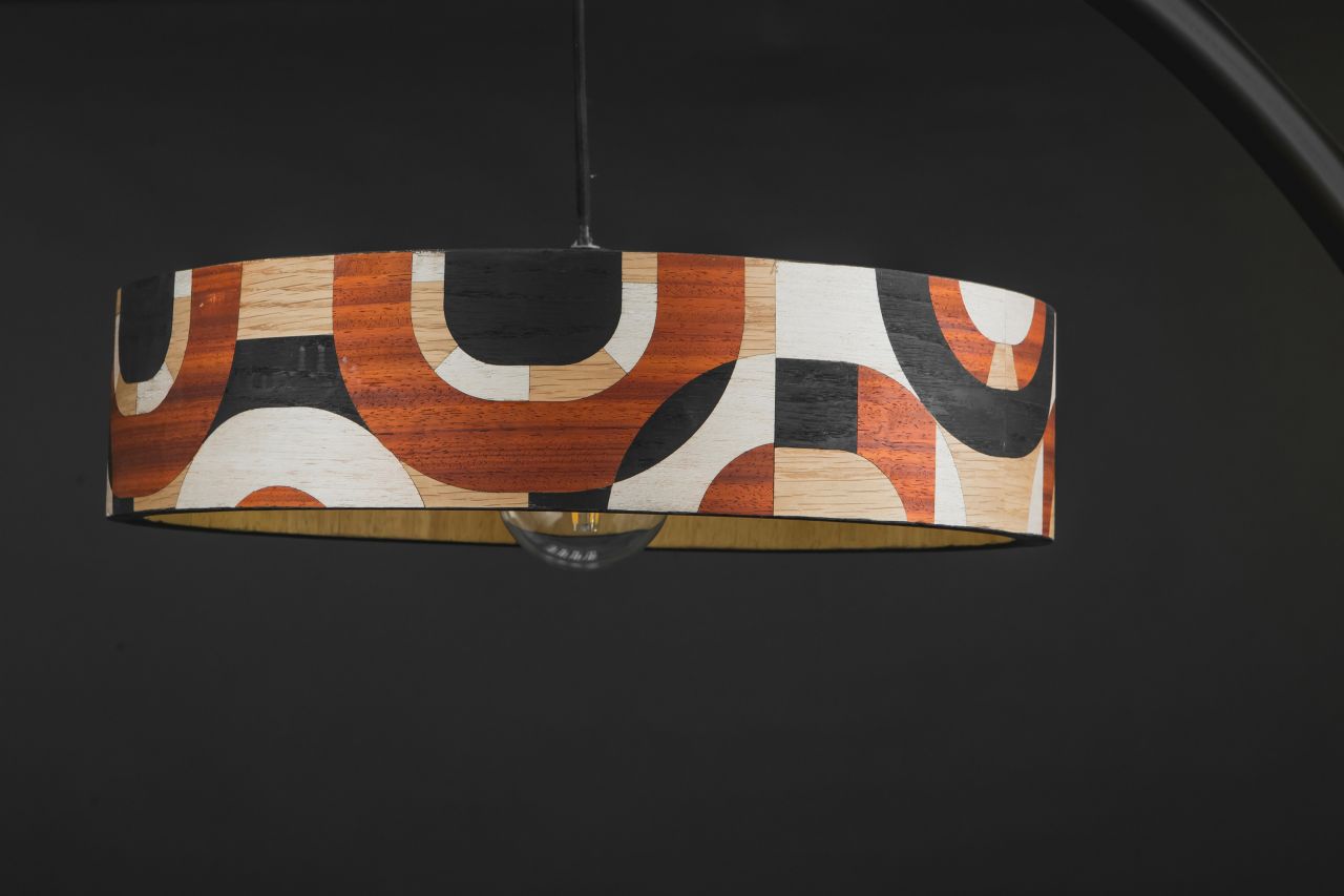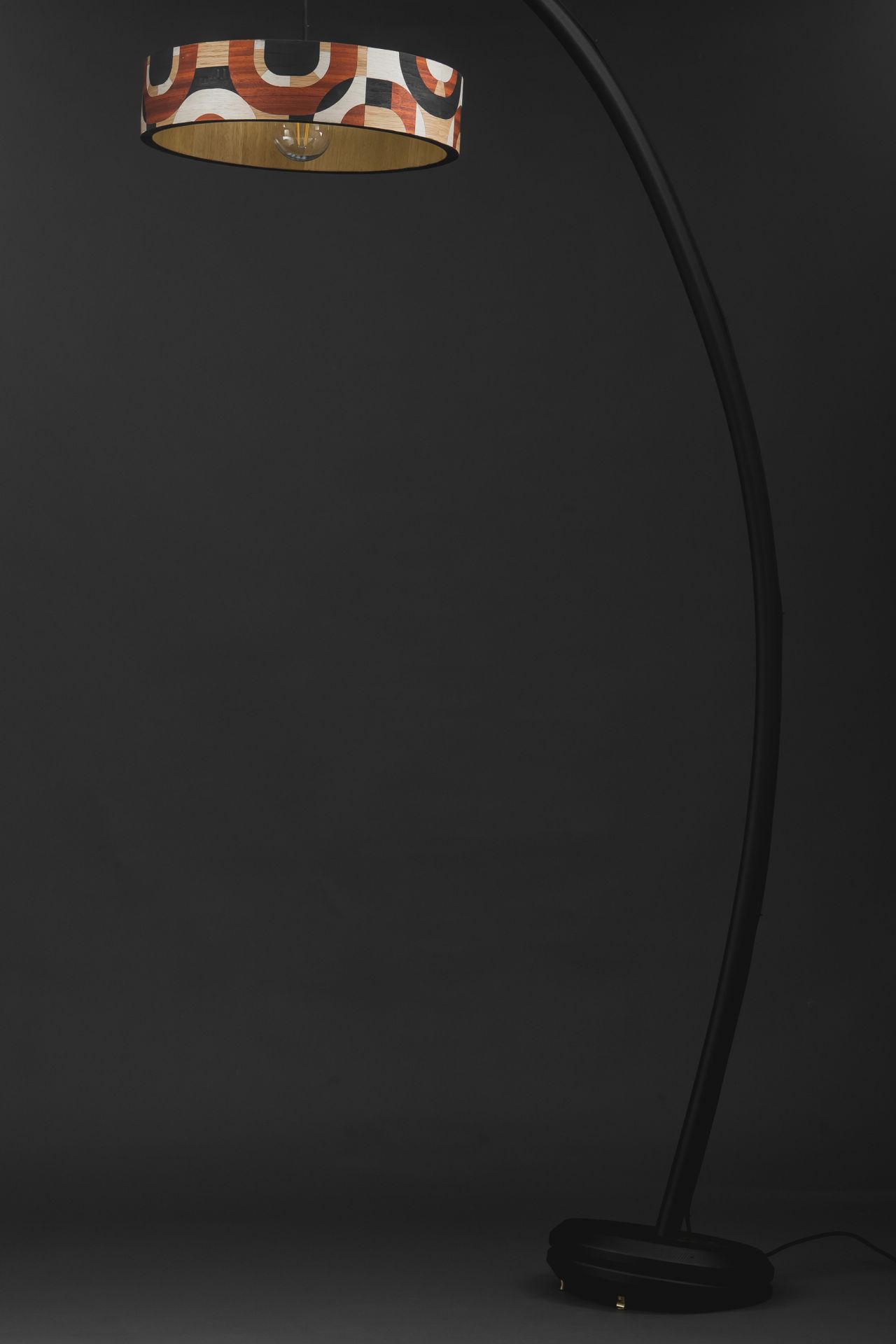 The design and construction of this particular item which is adorned with geometric marquetry, is inspired from Art Deco movement. Its lampshade comes into a circular form. Marquetry covers the whole perimeter in repetition of geometric laser cut patterns out of a variety of veneers in such a way that colors and composition come into contrast. Plywood used: paduk, oak, eucalyptus and black imbued oak. Its lampshade interior is iroko veneer lined. Τhe floor lamp base was formed out of solid beech imbued in black.The whole construction is varnished in matte acrylics (non yellowing).
