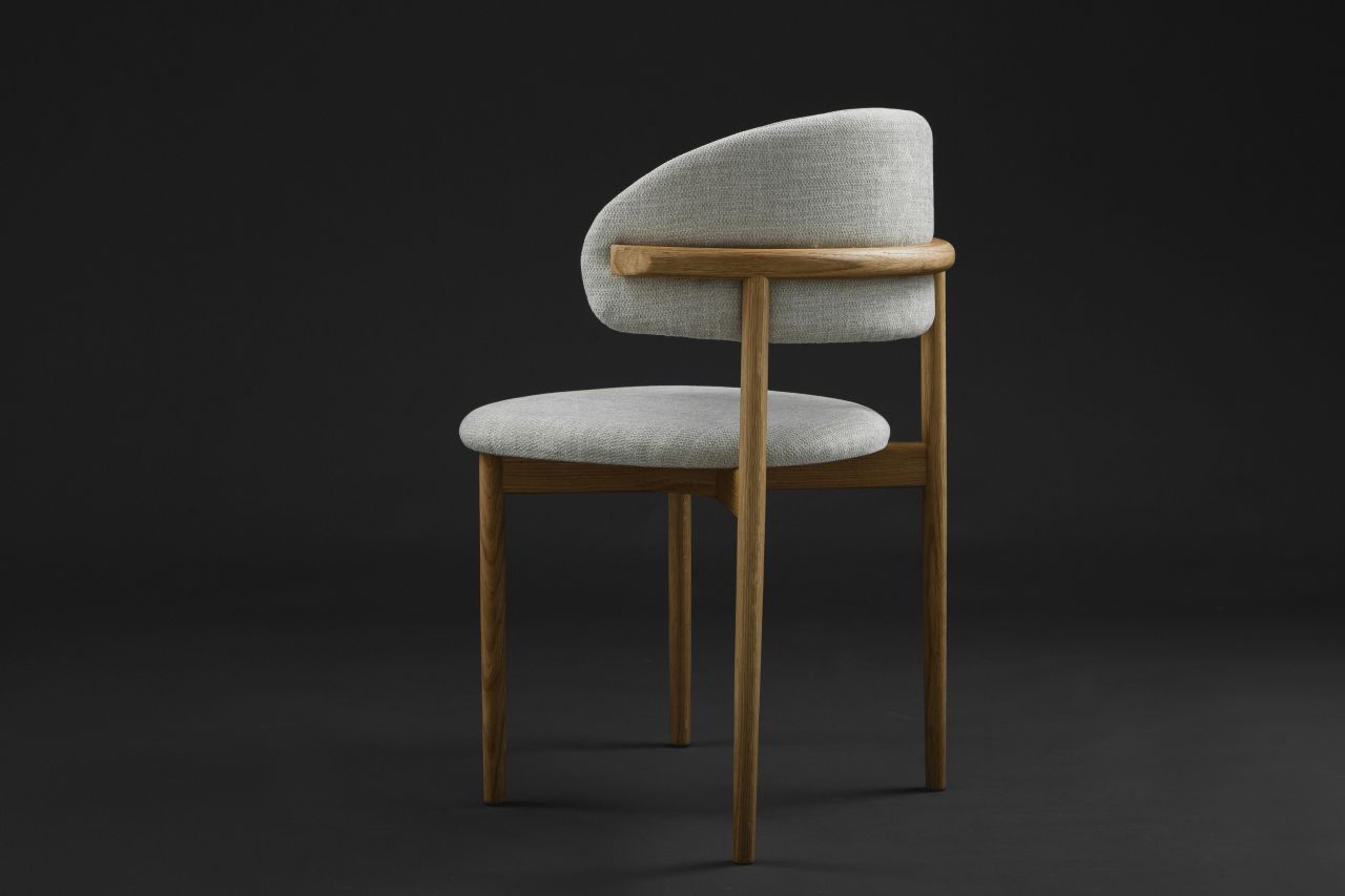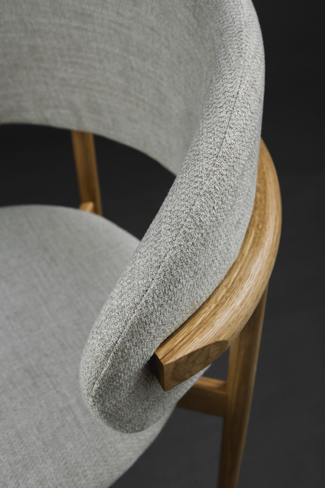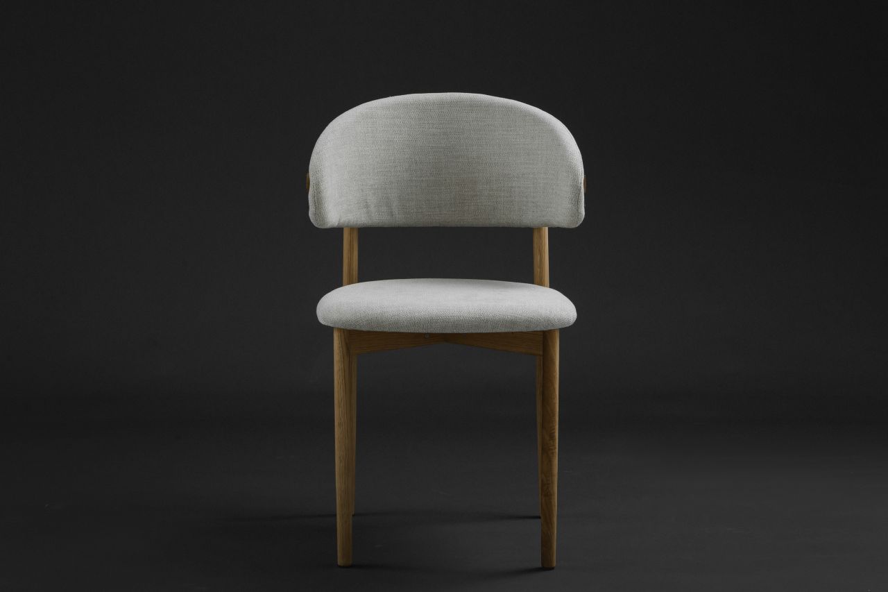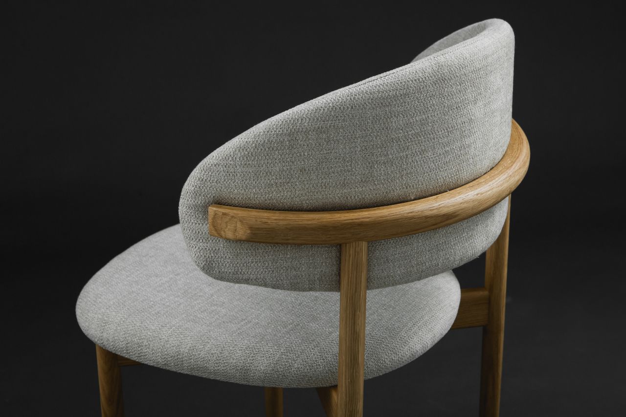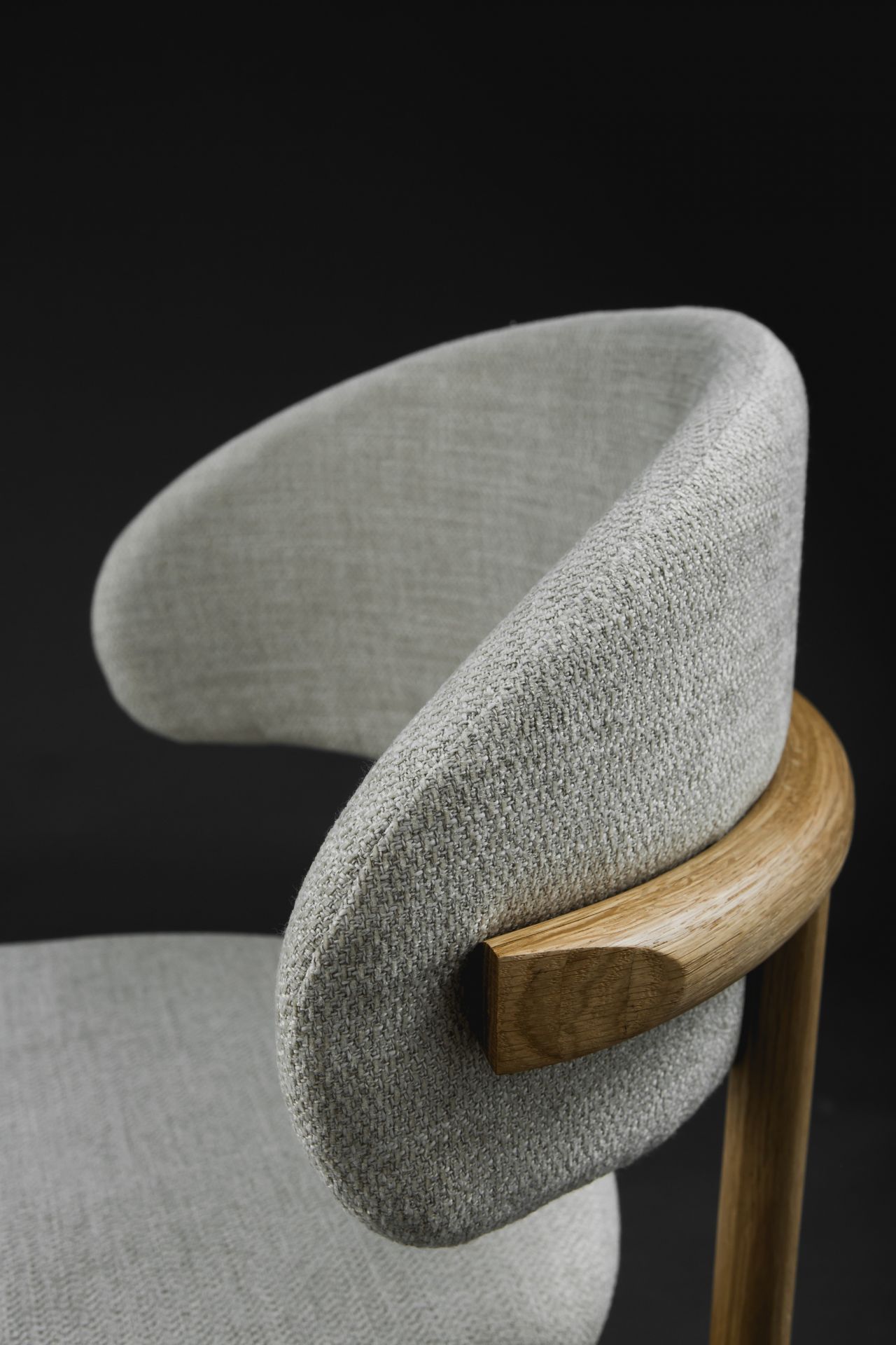 Απαιτητική ειδική κατασκευή καρέκλας από δρυ. Η κατασκευή βασίστηκε σε σχέδιο επιλογής του πελάτη. Η ιδιομορφία του επίπλου είναι οι κυκλικές φόρμες τόσο στον σκελετό της πλάτης, όσο και στο σχήμα του μαξιλαριού καθώς και τα κωνικά  τορνιριστά πόδια. Στην κατασκευή σχεδιάστηκαν ειδικές φόρμες η οποίες πρεσσαρίστηκαν υπό κενό, για να επιτευχθεί το ημικυκλικό σχήμα της μασίφ ξυλείας. Η υφασμάτινη ψάθα, αδιάβροχη και αλέκιαστη, επιλέχθηκε στις αποχρώσεις του γκρι αρζάν για να δέσει αρμονικά και να αναδείξει τη χρωματική παλέτα του ξύλου και τη γραμμή της. Επιπρόσθετα, έχει μελετηθεί η μελλοντική αντικατάσταση των υφασμάτων εφόσον χρειαστεί. Παρόλη τη ντελικάτη φόρμα της καρέκλας, έχει επιτευχθεί η εργονομία και η άνεση, τα οποία  ήταν αρχικός στόχος. Τα λούστρα που χρησιμοποιήθηκαν για το φινίρισμα του επίπλου είναι ακρυλικά (non yellowing).