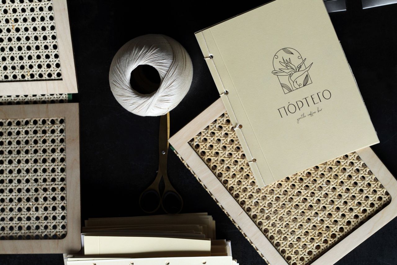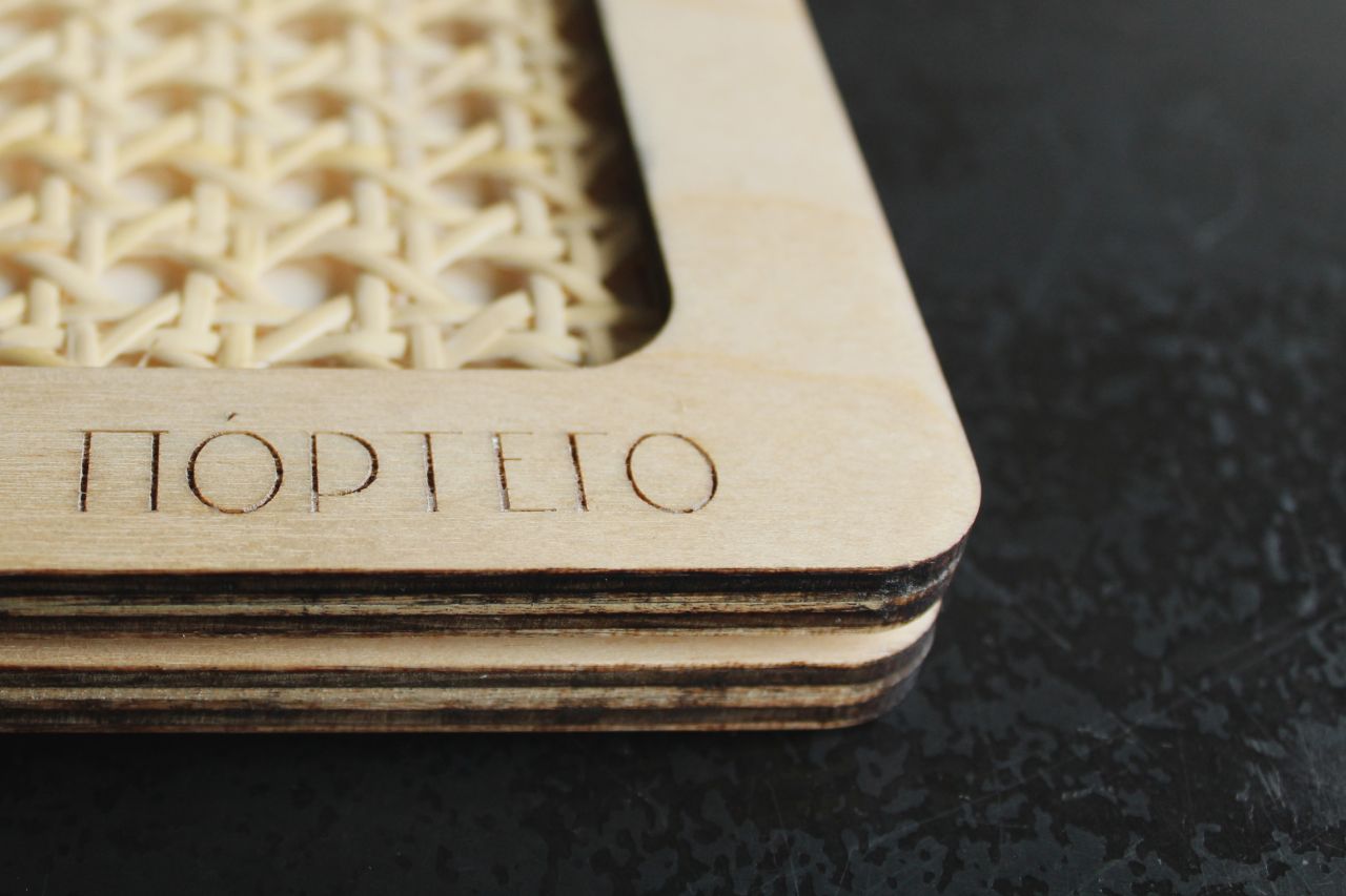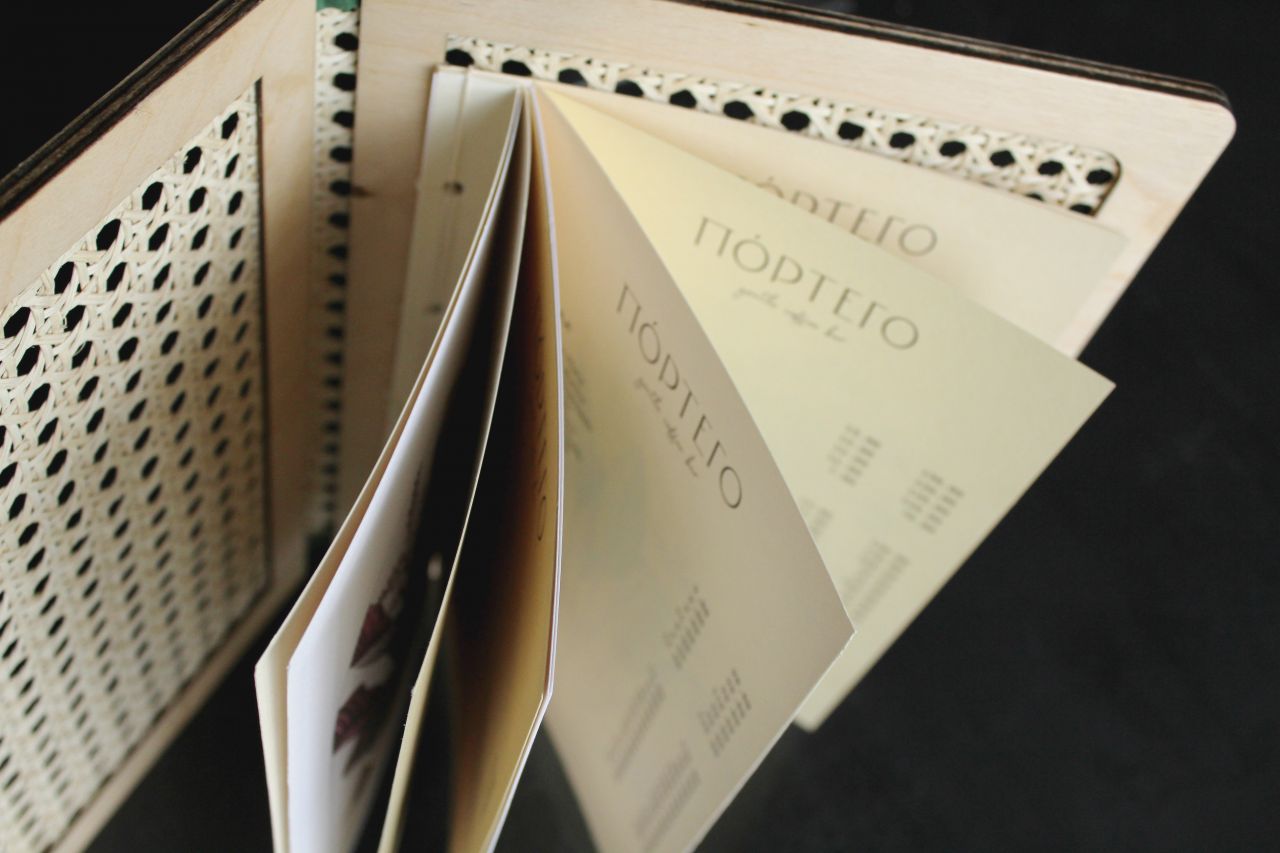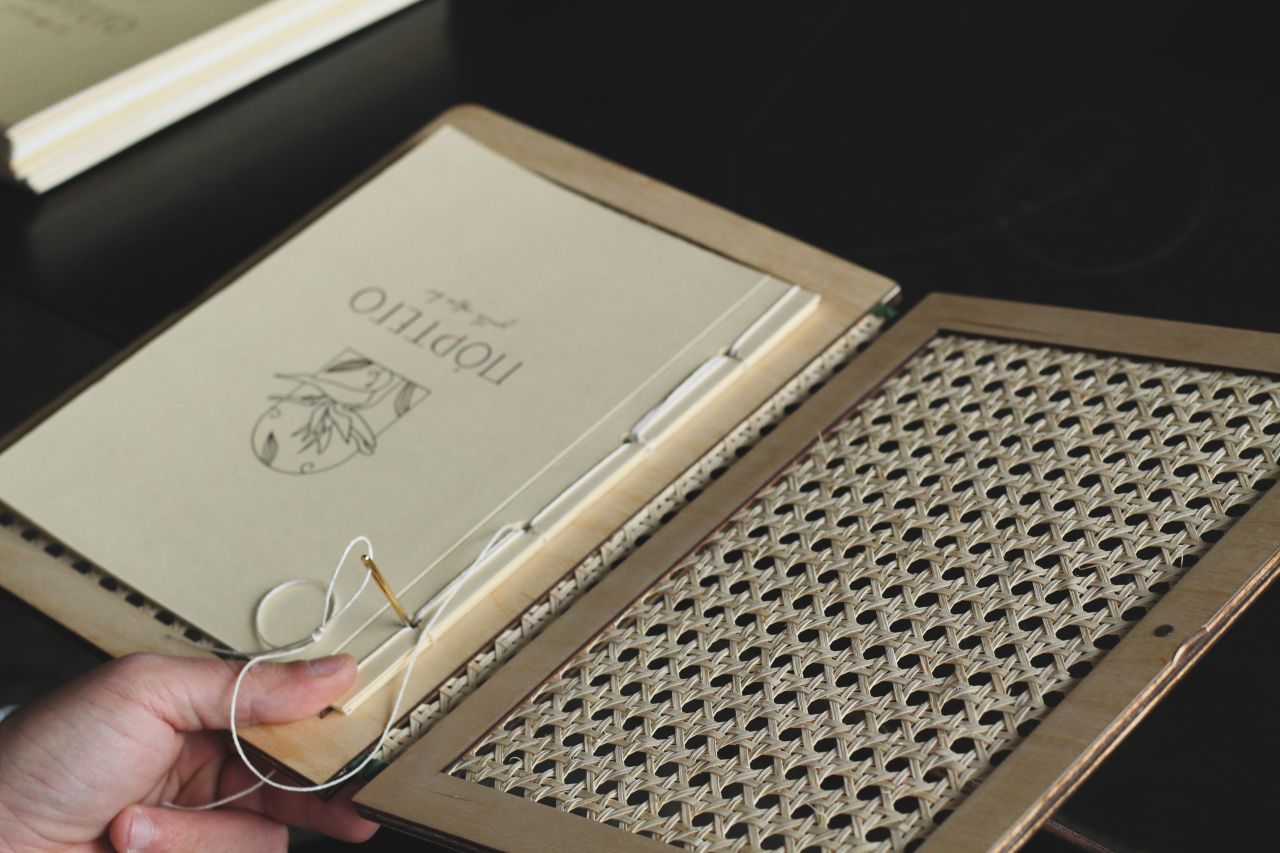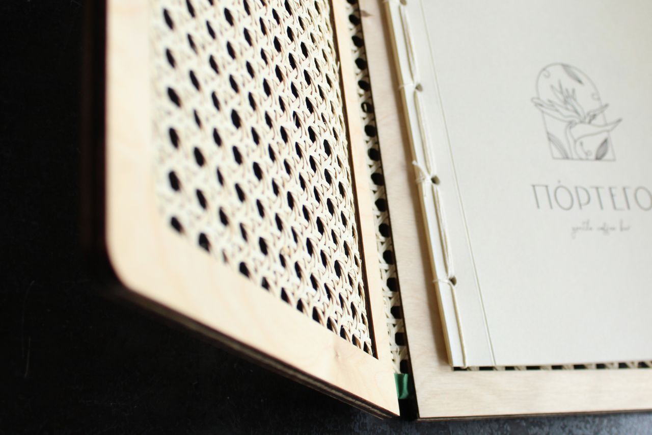 Ειδική κατασκευή καταλόγου με Βιεννέζικη ψάθα. Το συγκεκριμένο project έγινε σε συνεργασία με το γραφιστικό γραφείο Small Studio, οι οποίοι ανέλαβαν το σχεδιασμό του καταλόγου και ανέθεσαν σε εμάς την κατασκευή του. Πρόκειται για μια απαιτητική κατασκευή, αφού η βασική ιδέα ήταν η ανάδειξη της ψάθας. Όσον αφορά στη δομή του καταλόγου, αποτελείται από τέσσερα "παράθυρα" από κόντρα πλακέ κομμένα με το laser cutter που διαθέτει το εργαστήριο μας. Τα παράθυρα αυτά έχουν επεξεργαστεί με τέτοιο τρόπο ώστε να φιλοξενήσουν στο ενδιάμεσο την ψάθα με την τεχνική του λαμιναρίσματος και η ψάθα αποτελεί και την ράχη του καταλόγου, αφού συνδέει τα δυο πανέρια που έχουν δημιουργηθεί. Το εξώφυλλο του καταλόγου φέρει laser χάραξη με τον λογότυπο του μαγαζιού. Οι άκρες της ψάθας έχουν επενδυθεί με βελουτέ αυτοκόλλητο, το οποίο εξυπηρετεί και αισθητικούς λόγους αλλά και λειτουργικούς, αφού δεν επιτρέπει στην ψάθα να ξεφτίσει. Η βιβλιοδεσία έγινε με τον παραδοσιακό τρόπο, δηλαδή με ράψιμο των σελίδων.