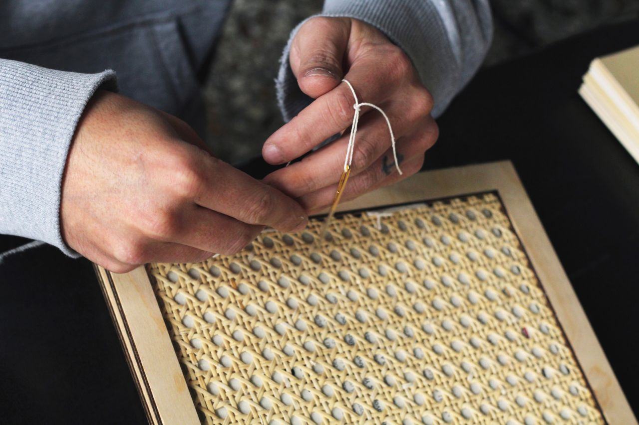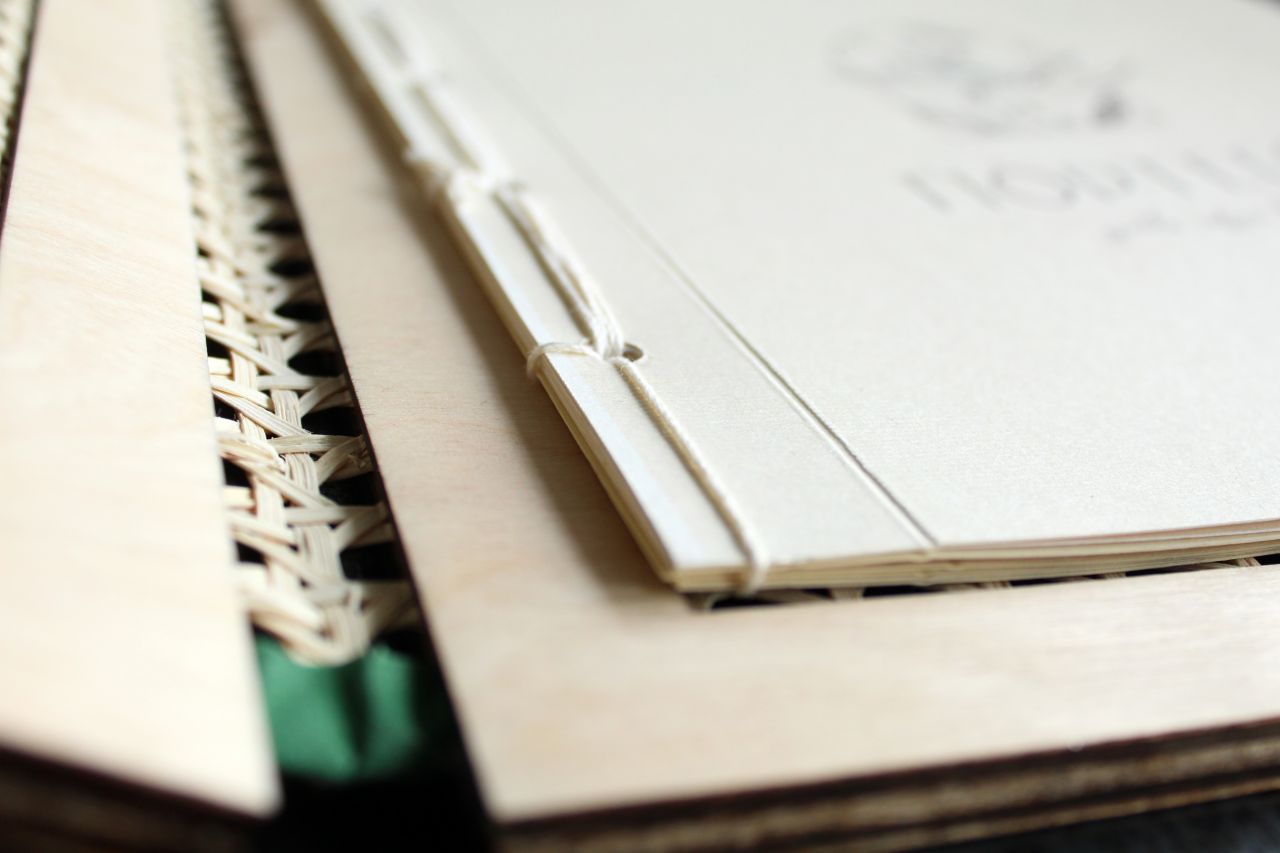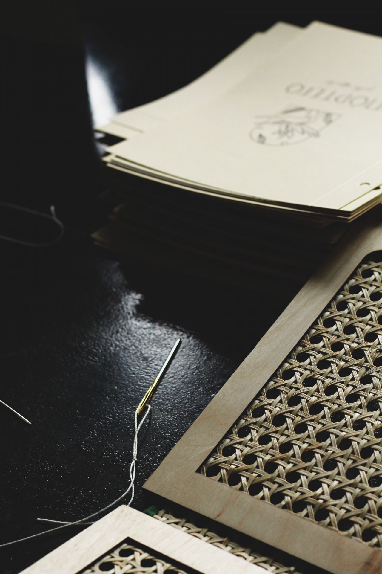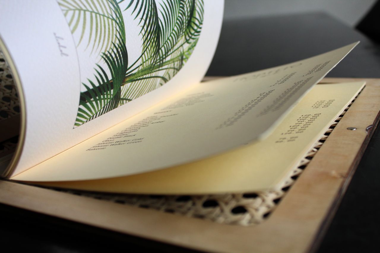 Ειδική κατασκευή καταλόγου με Βιεννέζικη ψάθα. Το συγκεκριμένο project έγινε σε συνεργασία με το γραφιστικό γραφείο Small Studio, οι οποίοι ανέλαβαν το σχεδιασμό του καταλόγου και ανέθεσαν σε εμάς την κατασκευή του. Πρόκειται για μια απαιτητική κατασκευή, αφού η βασική ιδέα ήταν η ανάδειξη της ψάθας. Όσον αφορά στη δομή του καταλόγου, αποτελείται από τέσσερα "παράθυρα" από κόντρα πλακέ κομμένα με το laser cutter που διαθέτει το εργαστήριο μας. Τα παράθυρα αυτά έχουν επεξεργαστεί με τέτοιο τρόπο ώστε να φιλοξενήσουν στο ενδιάμεσο την ψάθα με την τεχνική του λαμιναρίσματος και η ψάθα αποτελεί και την ράχη του καταλόγου, αφού συνδέει τα δυο πανέρια που έχουν δημιουργηθεί. Το εξώφυλλο του καταλόγου φέρει laser χάραξη με τον λογότυπο του μαγαζιού. Οι άκρες της ψάθας έχουν επενδυθεί με βελουτέ αυτοκόλλητο, το οποίο εξυπηρετεί και αισθητικούς λόγους αλλά και λειτουργικούς, αφού δεν επιτρέπει στην ψάθα να ξεφτίσει. Η βιβλιοδεσία έγινε με τον παραδοσιακό τρόπο, δηλαδή με ράψιμο των σελίδων.