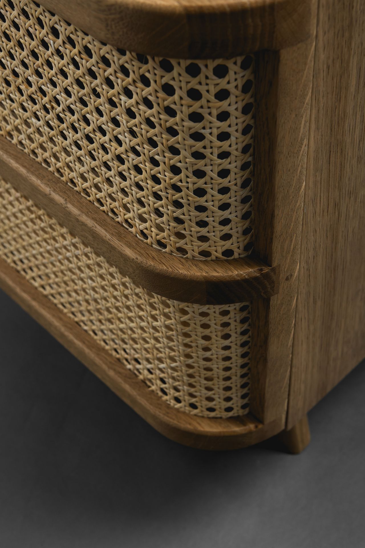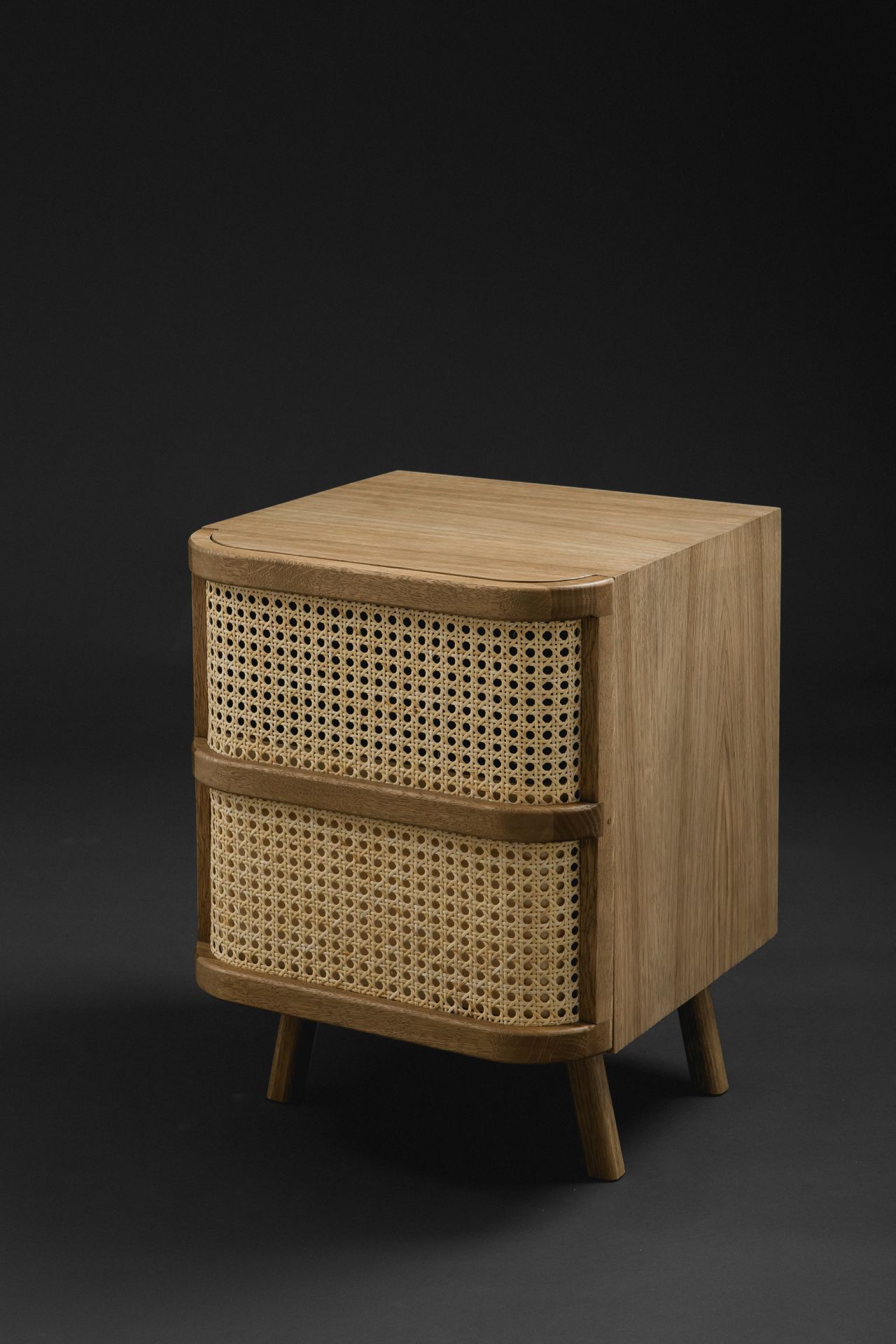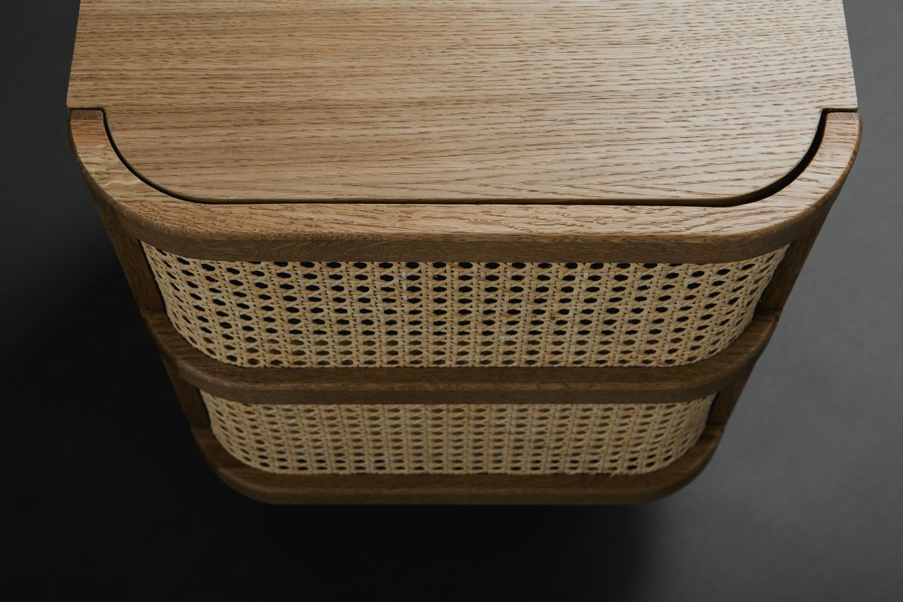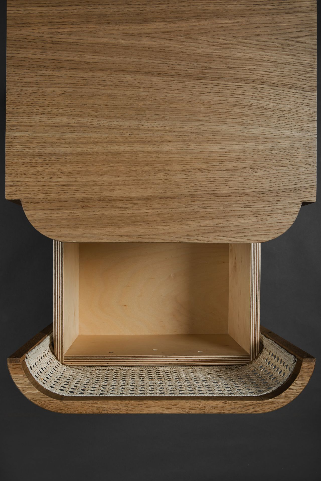 Custom oak nightstand construction. This construction was based on a design chosen by the customer. The main body of the bedside table is a rectangular construction. The most distinguishing trait of the furniture is the circular forms in the frame of the drawer's metope, where the Viennese rattan has been specially designed to fit in. Its legs are turned round out of solid oak. As for the colour of the furniture, the natural method of ammonia fuming was applied to give oak a darker shade; acrylic varnishes (non yellowing) were used for the finish.