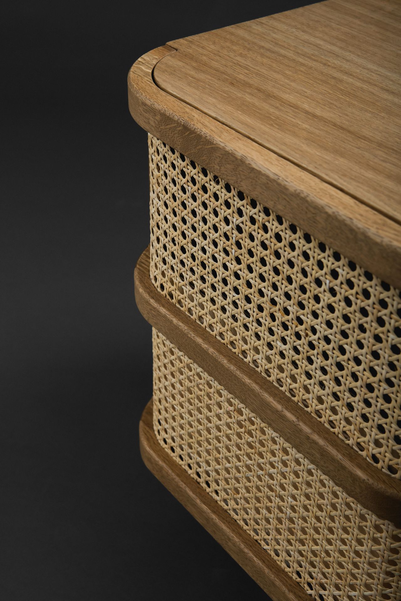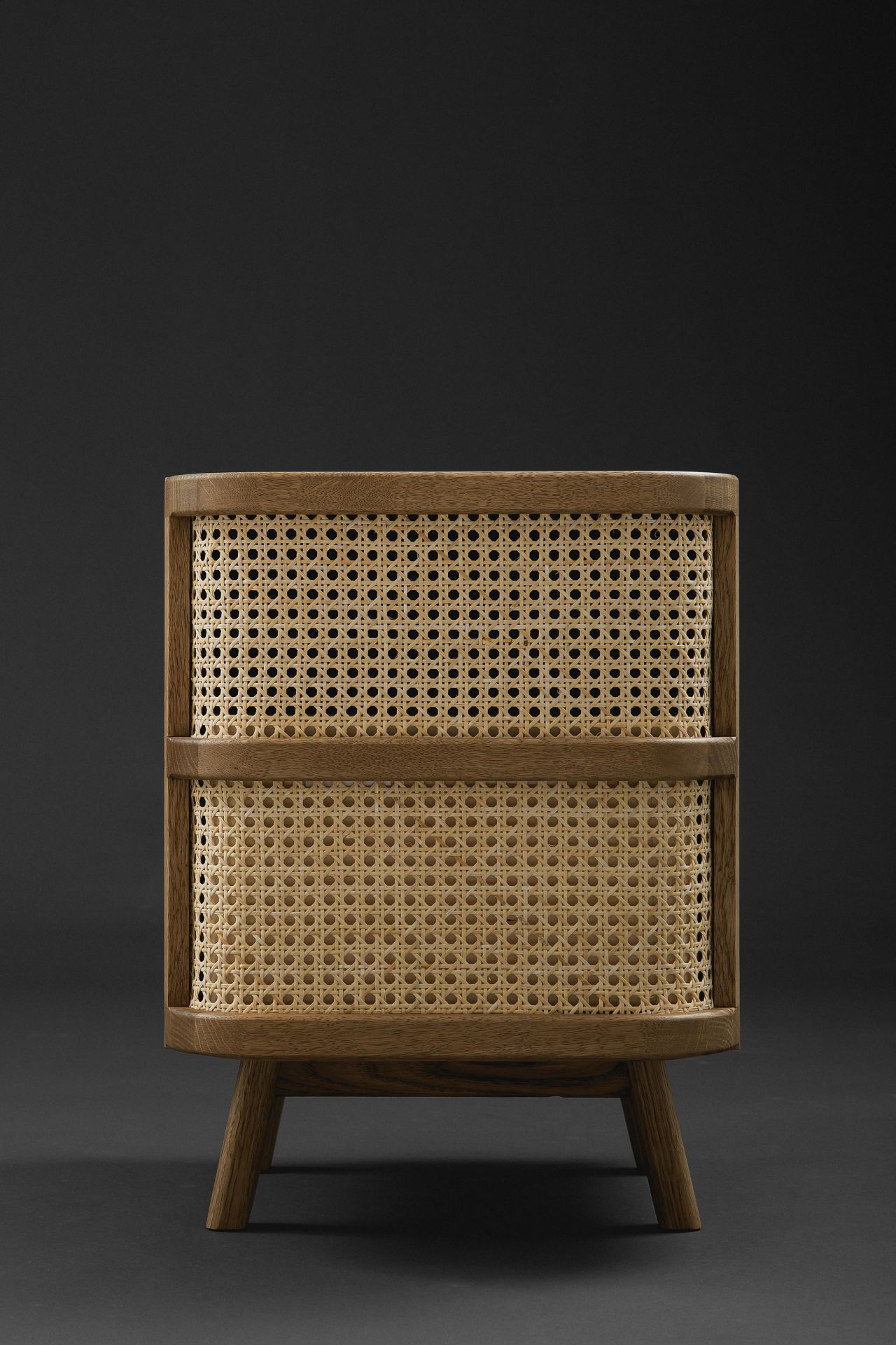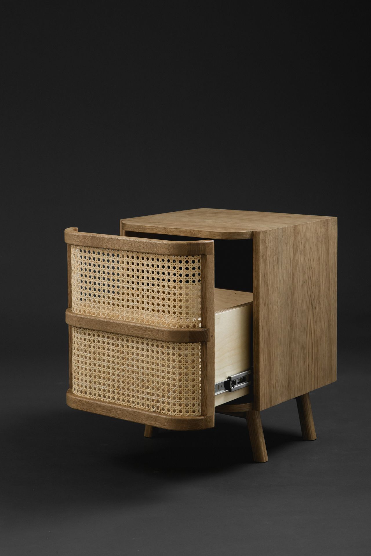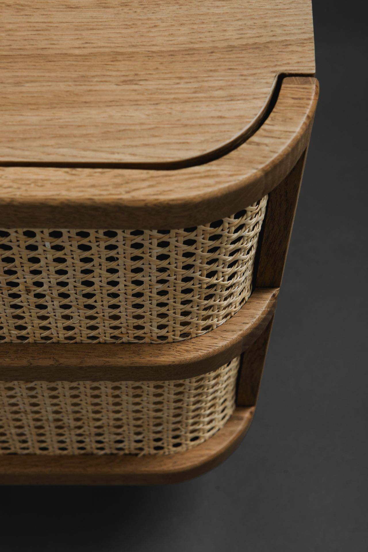 Custom oak nightstand construction. This construction was based on a design chosen by the customer. The main body of the bedside table is a rectangular construction. The most distinguishing trait of the furniture is the circular forms in the frame of the drawer's metope, where the Viennese rattan has been specially designed to fit in. Its legs are turned round out of solid oak. As for the colour of the furniture, the natural method of ammonia fuming was applied to give oak a darker shade; acrylic varnishes (non yellowing) were used for the finish.