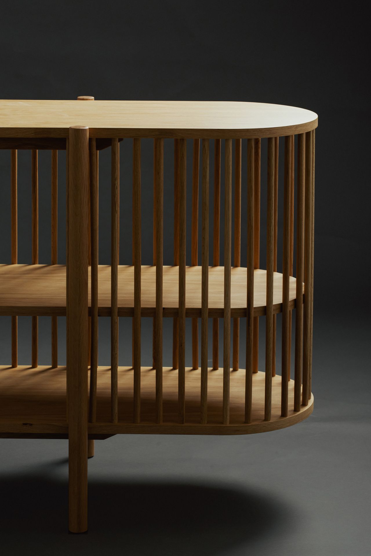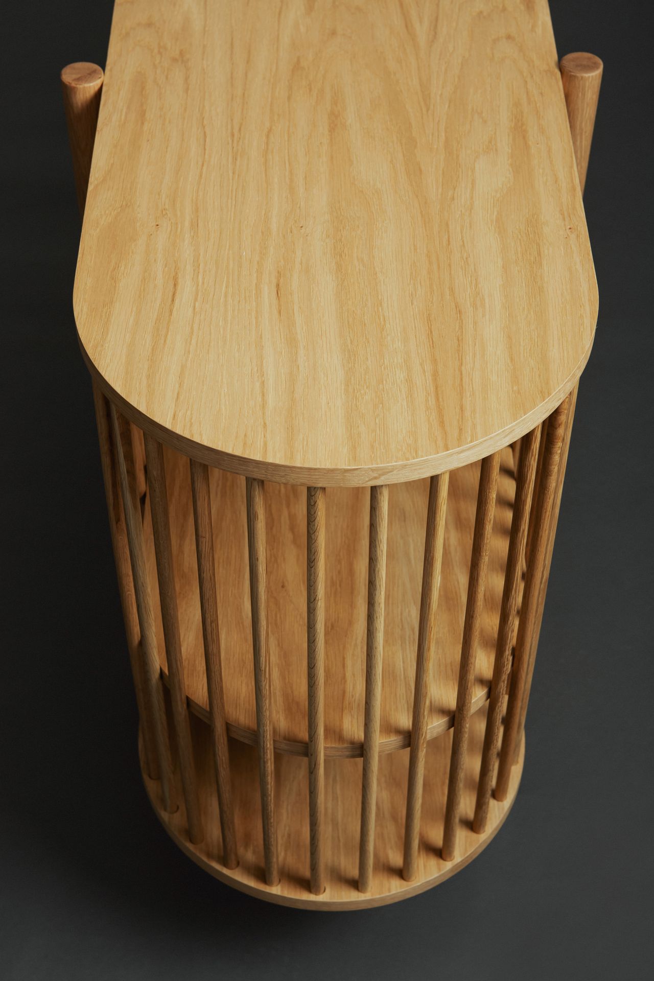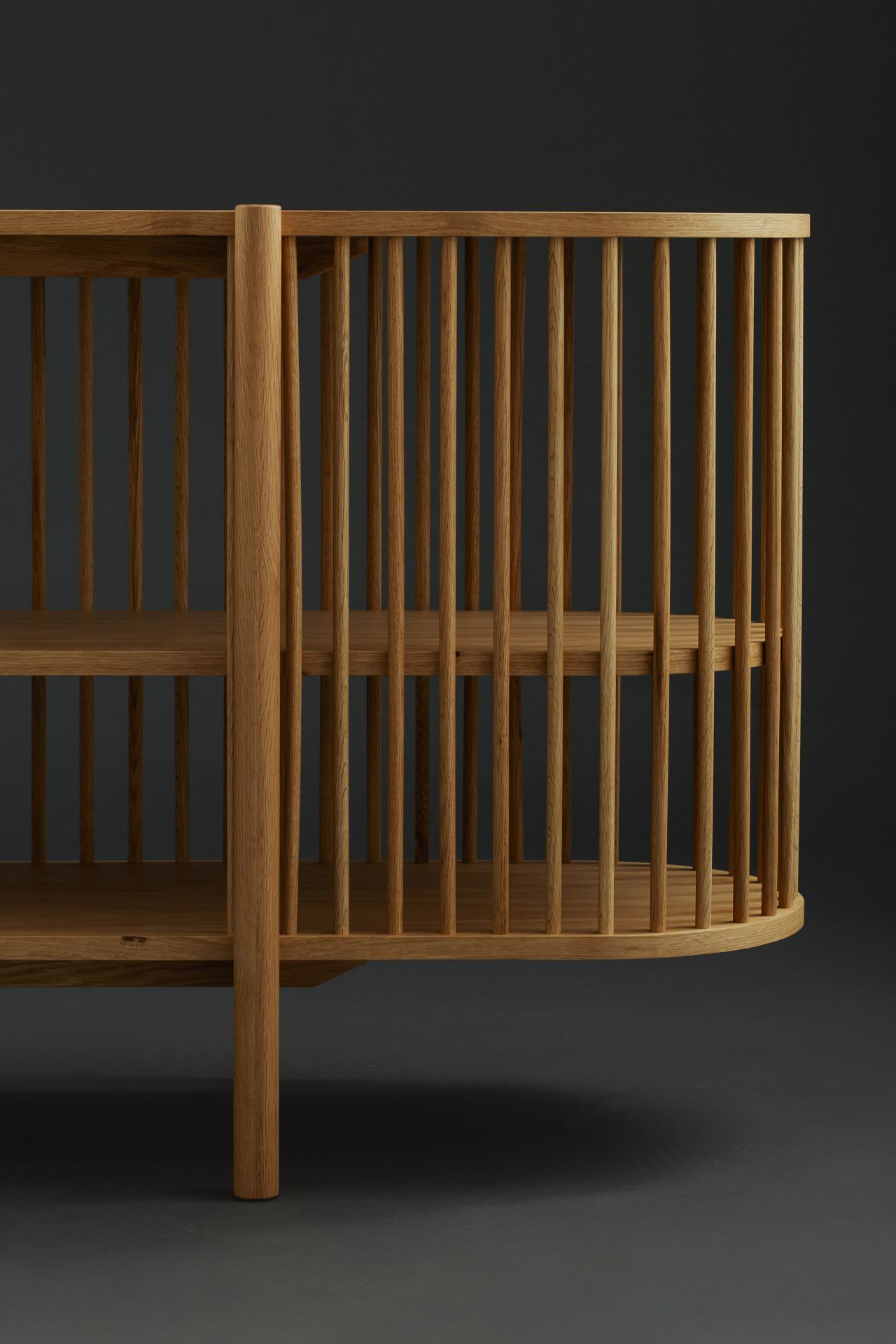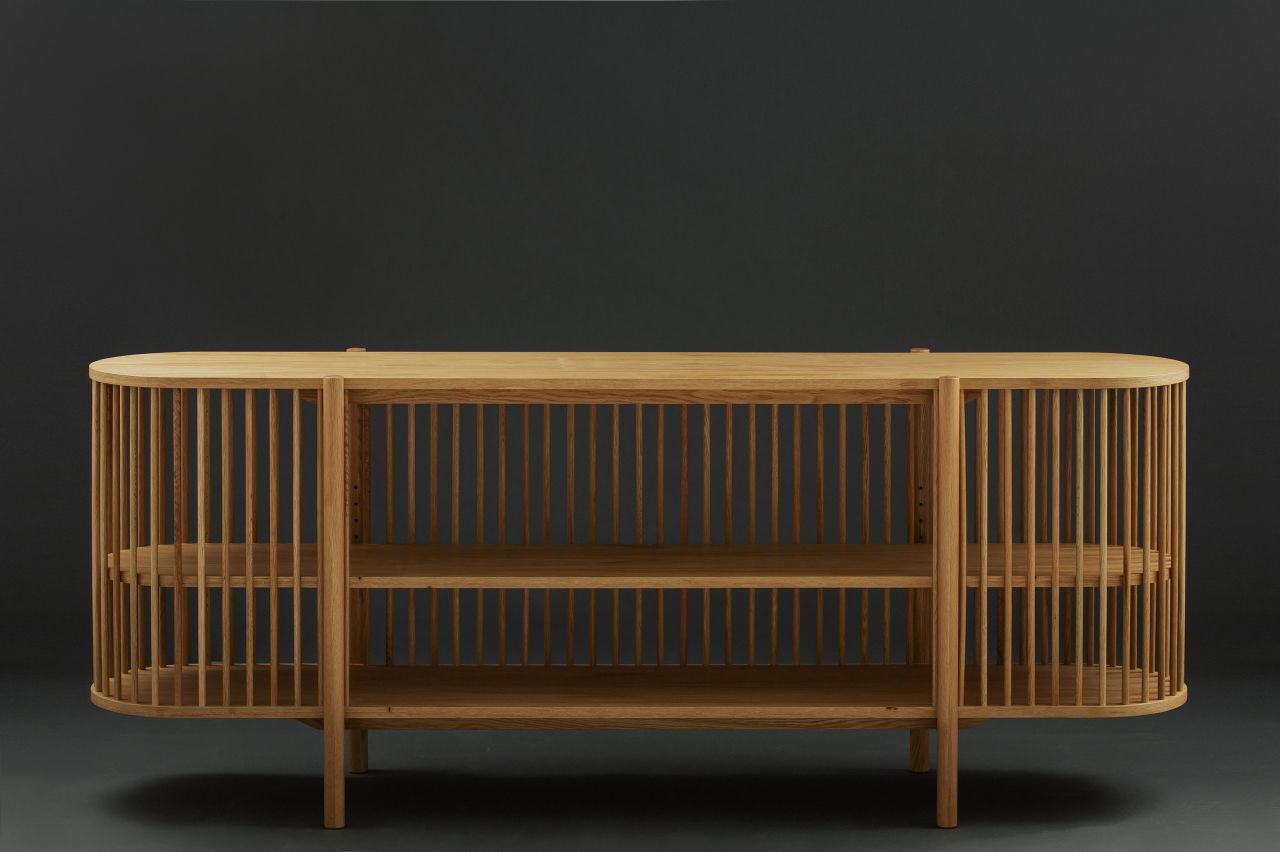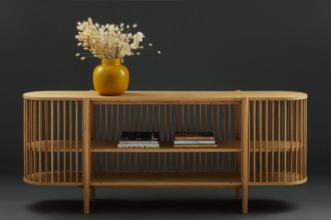 Tailormade oak sideboard construction. The furniture was made based on a design of the customer's choice. The philosophy behind it, is a combination of both Japanese simplicity and Scandinavian philosophy. For its construction we chose solid European oak wood and veneer of the same species variety which was selected and processed specifically for this project. The furniture is oval shaped and has three surfaces which are the distinct boundaries of the construction (base, shelf, bottom). The main element of the structure is a solid frame consisting of round legs and crossbars . The study and the particular way of construction of the frame gives the furniture both the required firmness and the feeling of its shelves ,floating. This feeling is also enhanced by the perimeter structure of the sideboard, since it is made up of numerous oak dowels which are spread out around the perimeter of the furniture at an equal distance from each other. The modern buffet is far away from the stereotype of an enclosed piece of furniture and makes a statement for the space that it is intended to host as the structure allows light to diffuse, creating a play on the shadow it creates. The right choice of its contents can elevate its owner's living room. The construction has been finished with zero gloss acrylic varnishes (Non yellowing) Dimensions: 200*45*85cm (L*W*H).