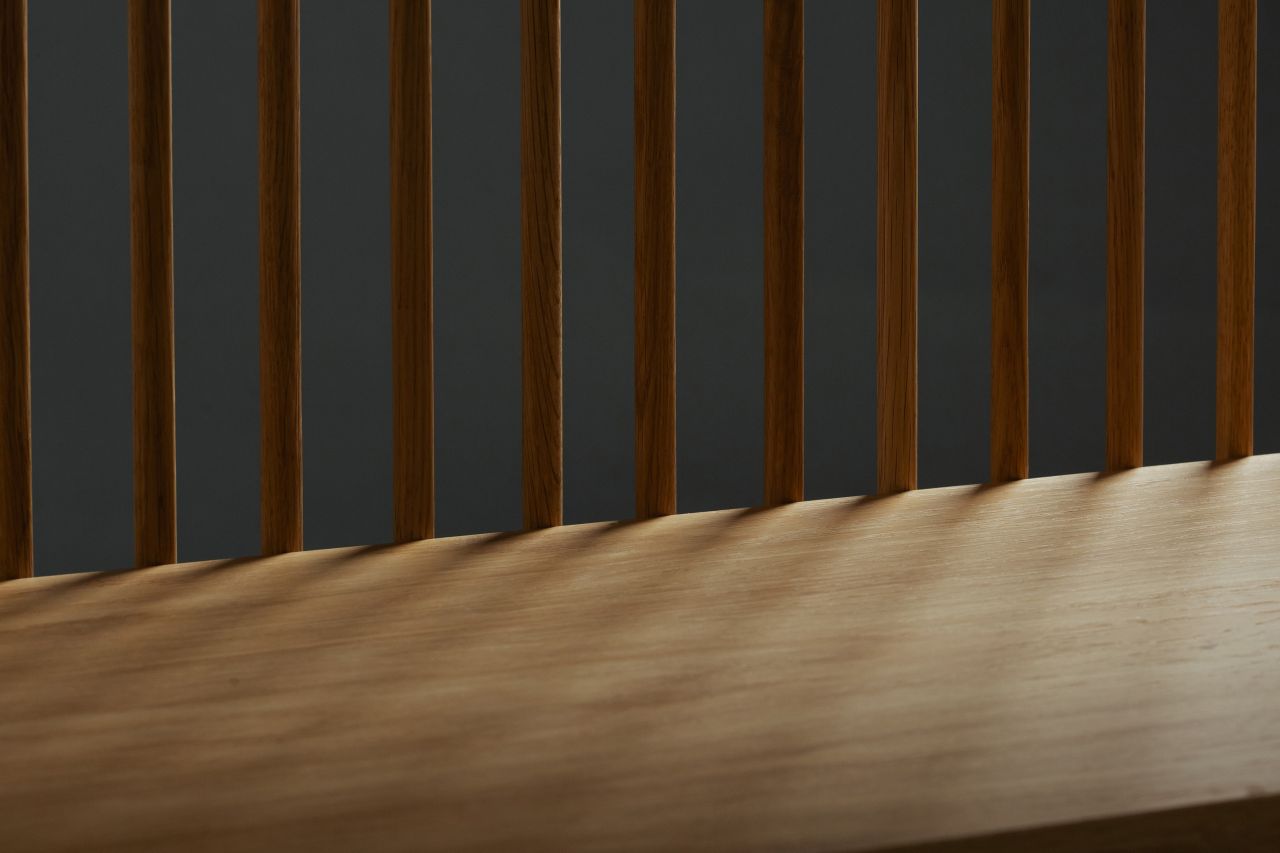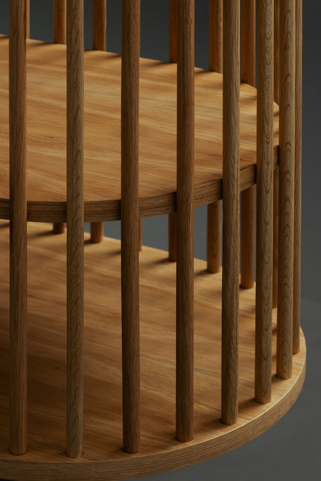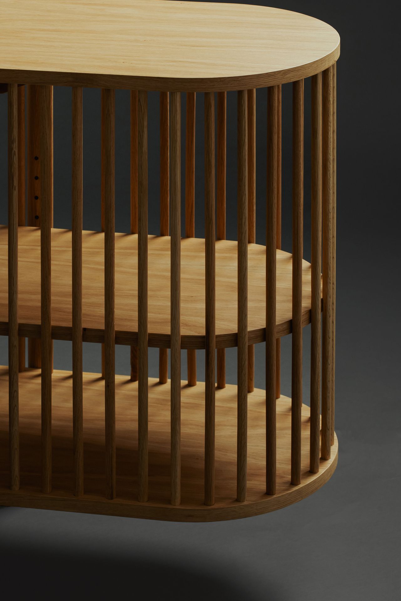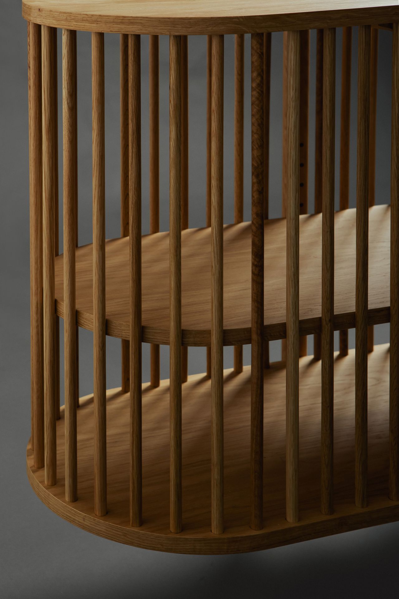 Tailormade oak sideboard construction. The furniture was made based on a design of the customer's choice. The philosophy behind it, is a combination of both Japanese simplicity and Scandinavian philosophy. For its construction we chose solid European oak wood and veneer of the same species variety which was selected and processed specifically for this project. The furniture is oval shaped and has three surfaces which are the distinct boundaries of the construction (base, shelf, bottom). The main element of the structure is a solid frame consisting of round legs and crossbars . The study and the particular way of construction of the frame gives the furniture both the required firmness and the feeling of its shelves ,floating. This feeling is also enhanced by the perimeter structure of the sideboard, since it is made up of numerous oak dowels which are spread out around the perimeter of the furniture at an equal distance from each other. The modern buffet is far away from the stereotype of an enclosed piece of furniture and makes a statement for the space that it is intended to host as the structure allows light to diffuse, creating a play on the shadow it creates. The right choice of its contents can elevate its owner's living room. The construction has been finished with zero gloss acrylic varnishes (Non yellowing) Dimensions: 200*45*85cm (L*W*H).