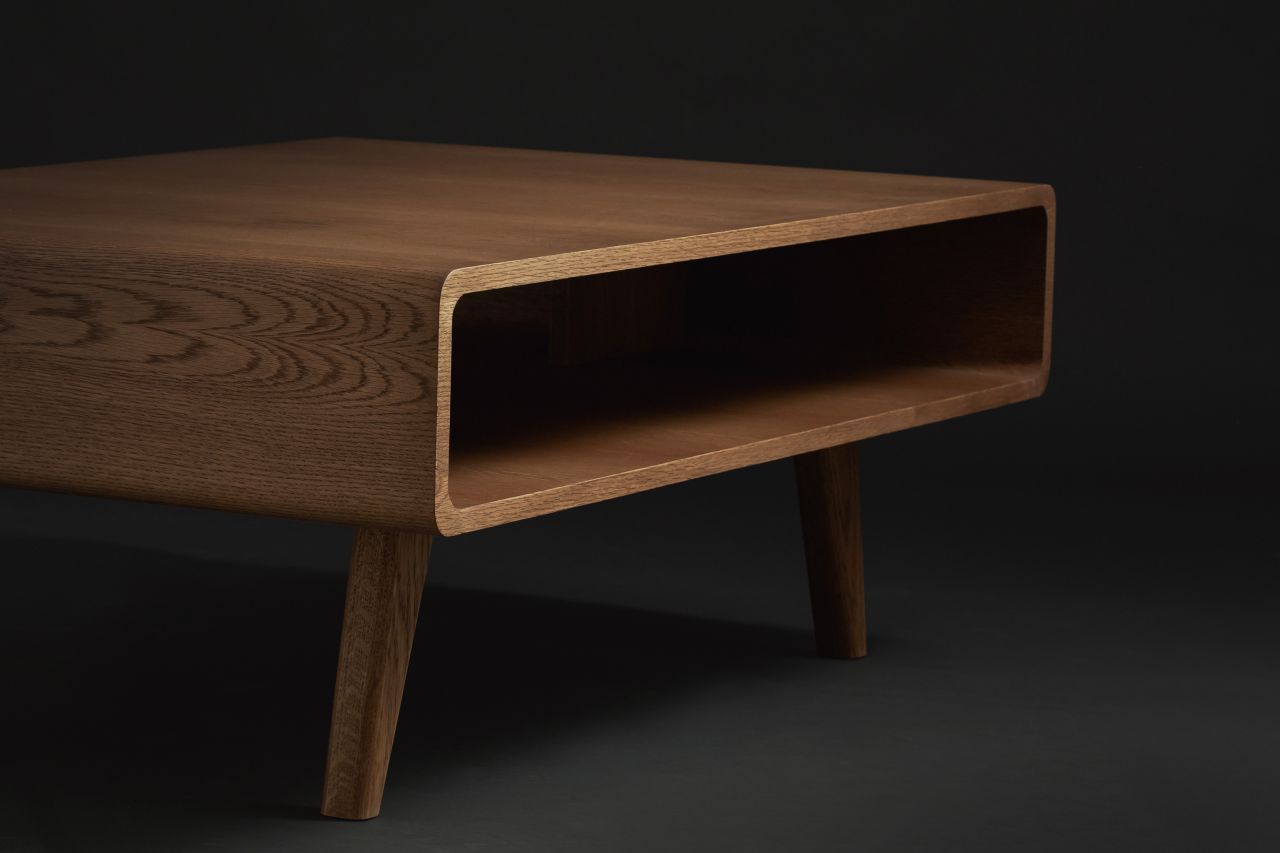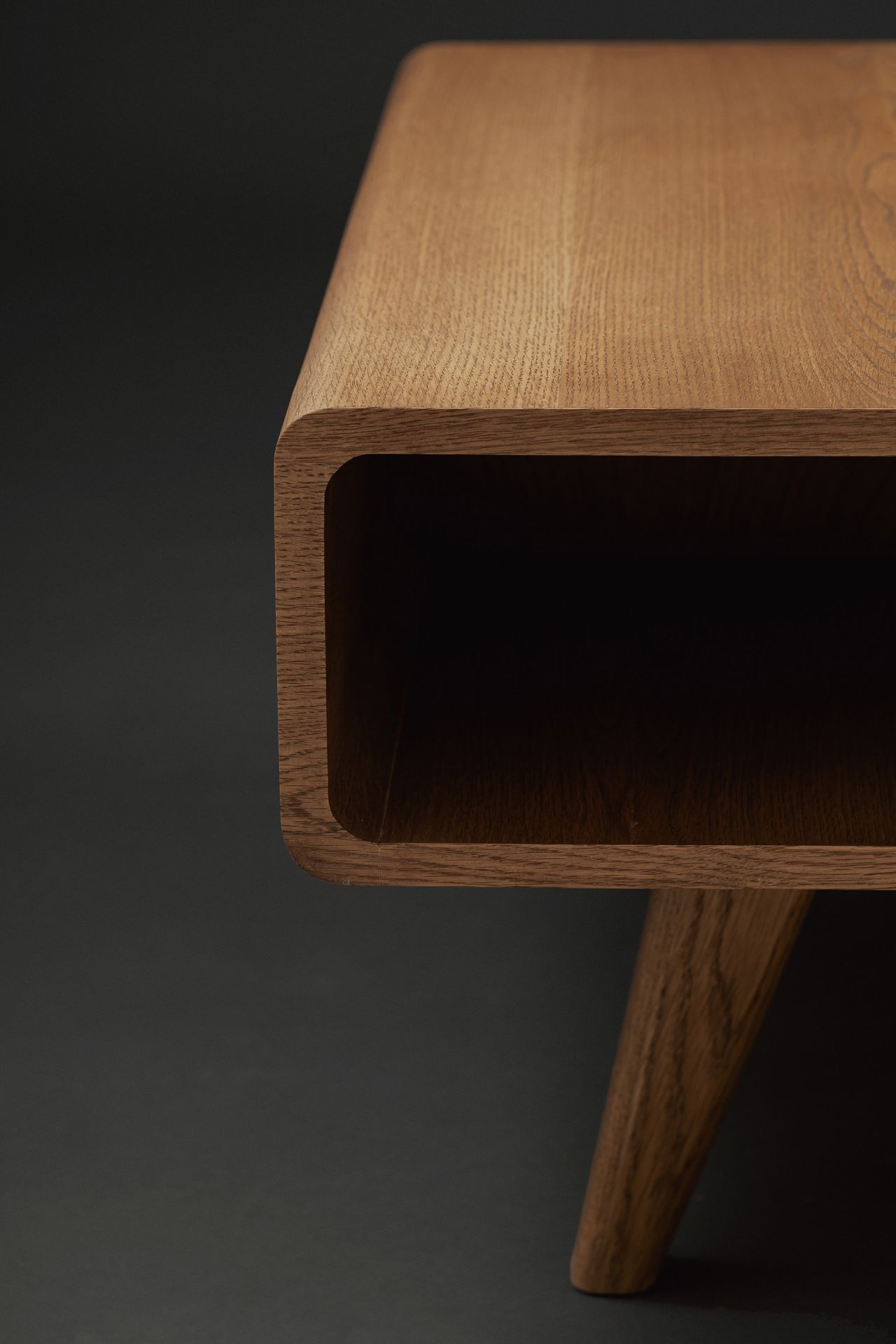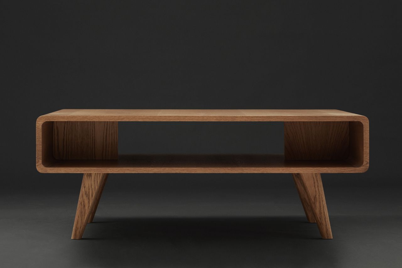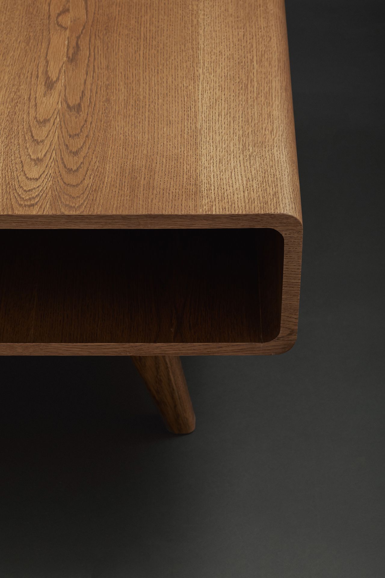 We were requested to create a custom construction of a coffee table made of oak. The construction was made according to the design provided by the client. The form of the table consists of semi-circular forms. To create these semi-circular forms, we made special square section timber blocks from plywood using the laminating technique. These pieces have been machined with special cutting tools to obtain the desired radius on both outer and inner side,too. After creating the main form of the table, we lined it with oak veneer where the grains of the wood "run" all around the perimeter of the furniture, creating an effect of a single wooden surface. The interior of the coffee table allows for storage and serves as a shelf, and is equally lined in oak. The legs were made of solid oak while its aesthetics is based on Mid Century Modern forms. The coffee table was imbued with a paint of the client's choice , to give it a darker shade , and finished with acrylic glaze matte (non yellowing). Its dimensions are 118*70*45cm (W*D*H*W).