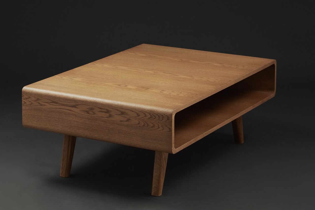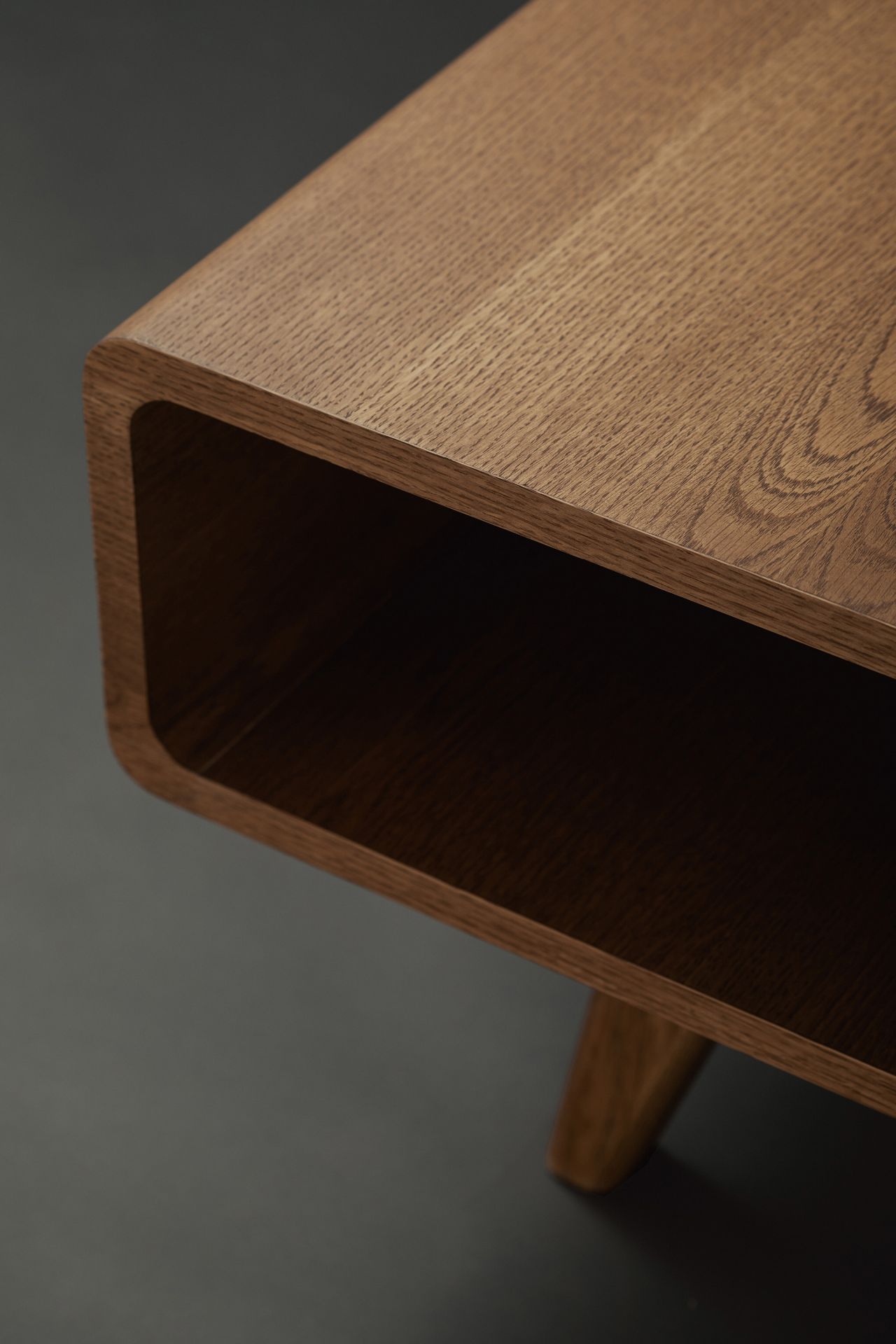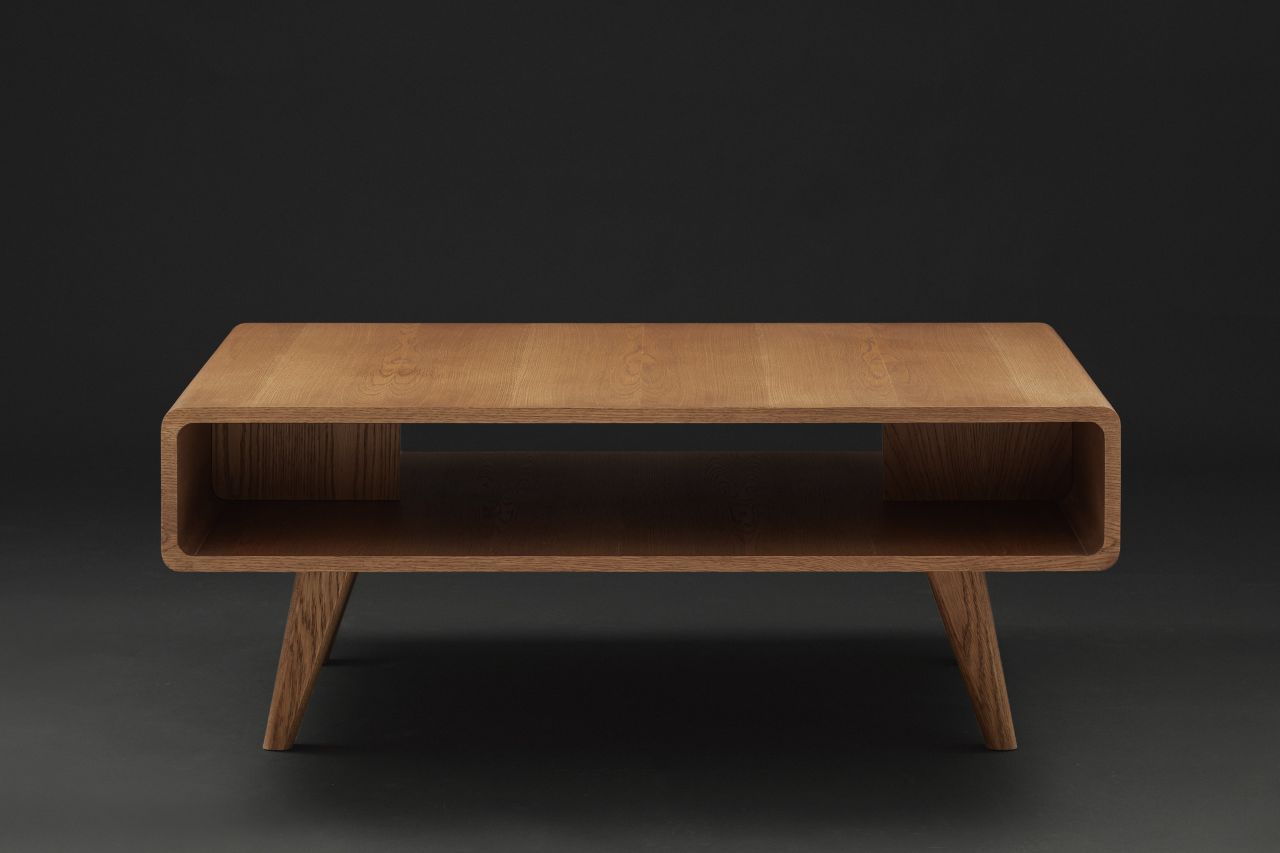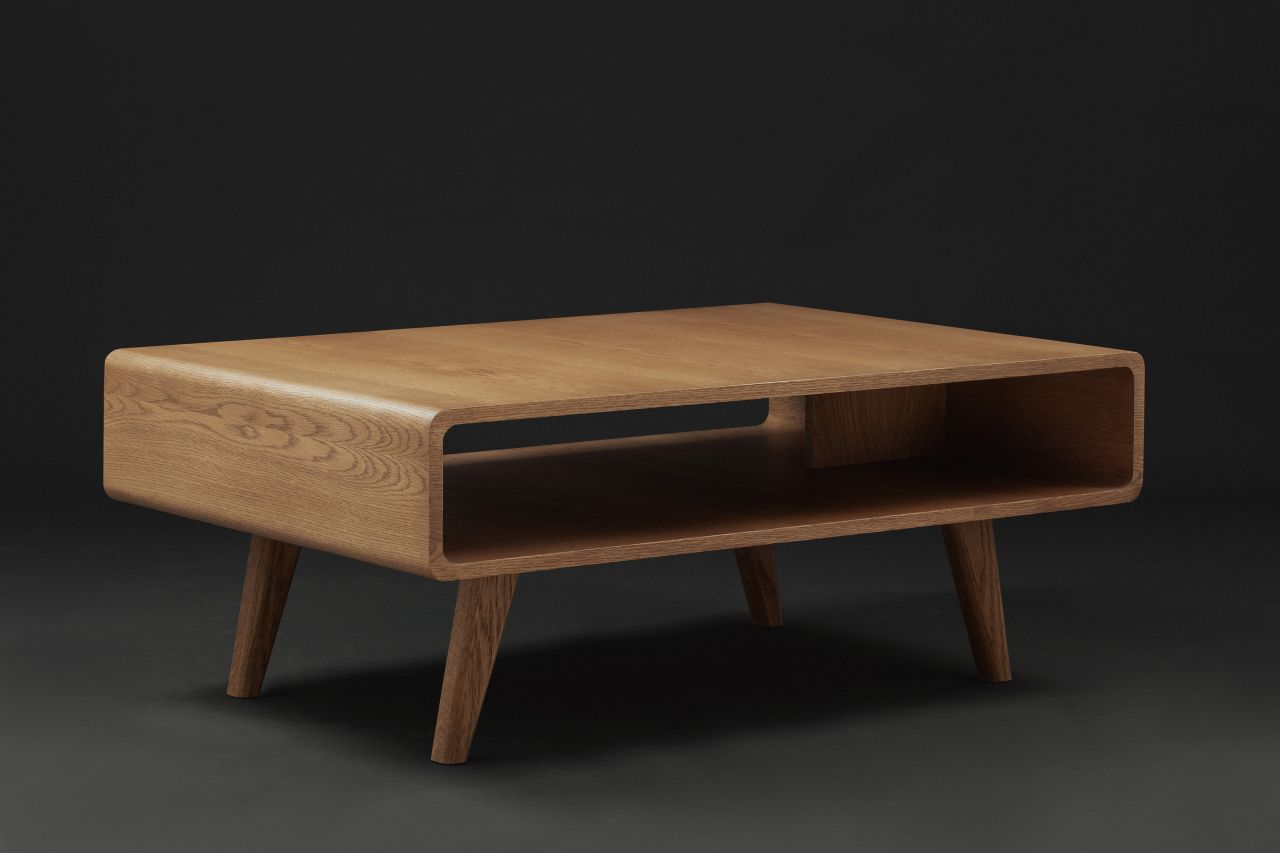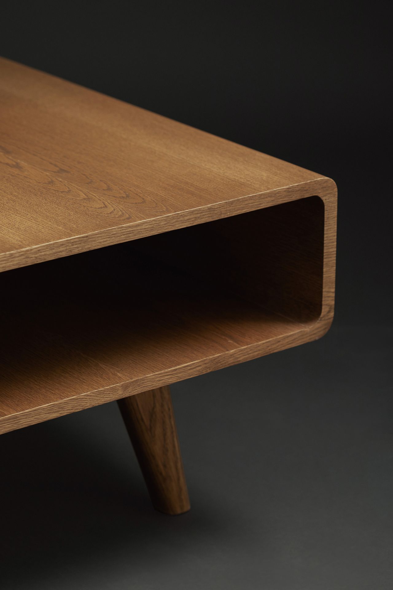 We were requested to create a custom construction of a coffee table made of oak. The construction was made according to the design provided by the client. The form of the table consists of semi-circular forms. To create these semi-circular forms, we made special square section timber blocks from plywood using the laminating technique. These pieces have been machined with special cutting tools to obtain the desired radius on both outer and inner side,too. After creating the main form of the table, we lined it with oak veneer where the grains of the wood "run" all around the perimeter of the furniture, creating an effect of a single wooden surface. The interior of the coffee table allows for storage and serves as a shelf, and is equally lined in oak. The legs were made of solid oak while its aesthetics is based on Mid Century Modern forms. The coffee table was imbued with a paint of the client's choice , to give it a darker shade , and finished with acrylic glaze matte (non yellowing). Its dimensions are 118*70*45cm (W*D*H*W).