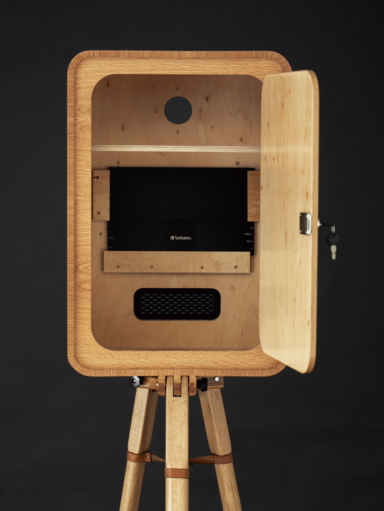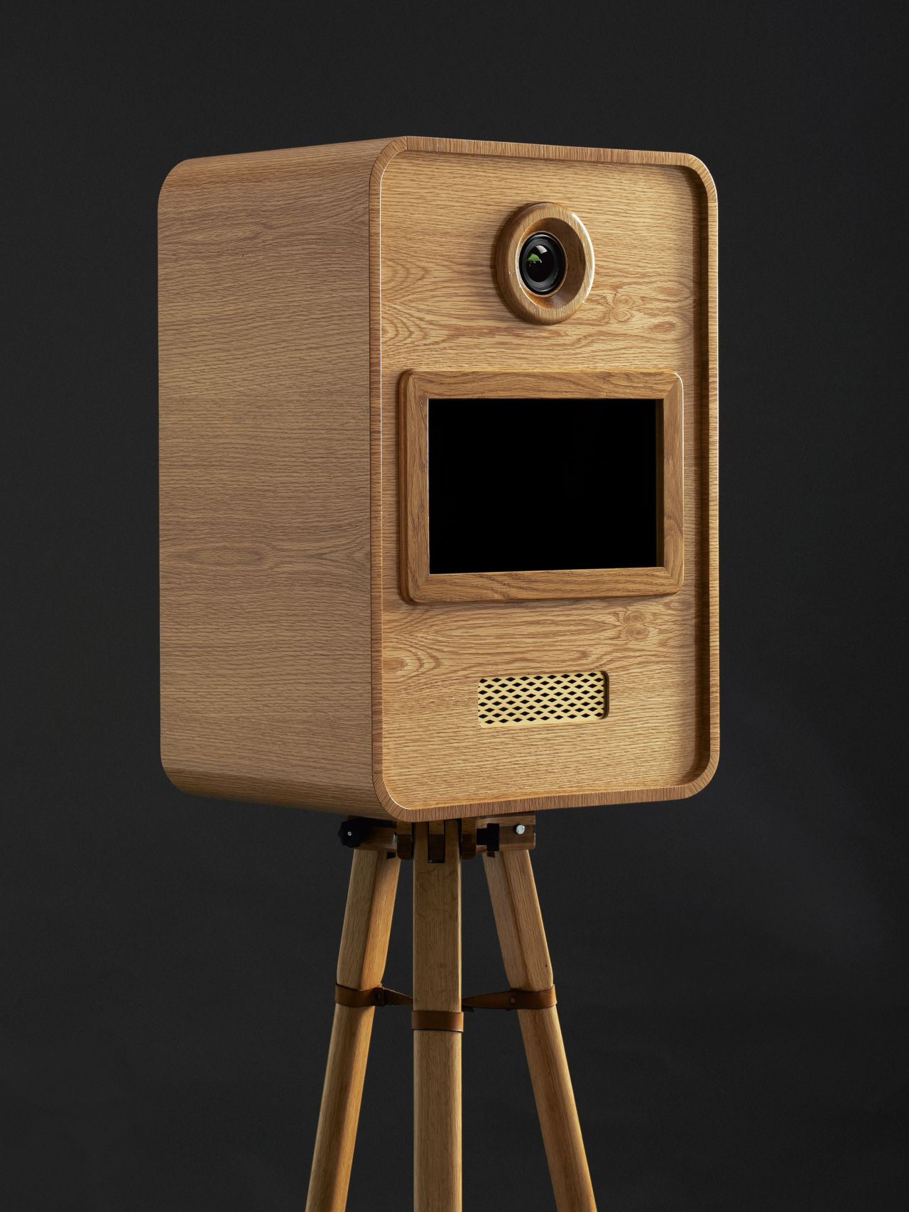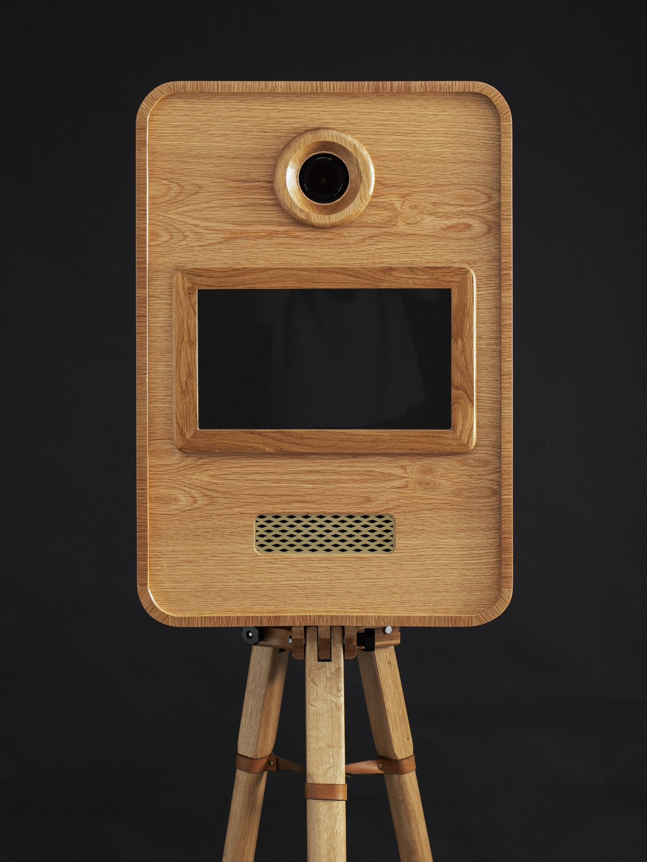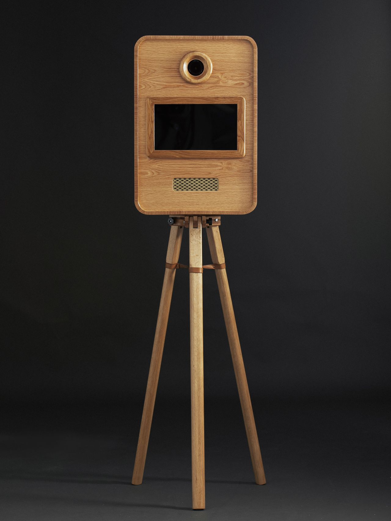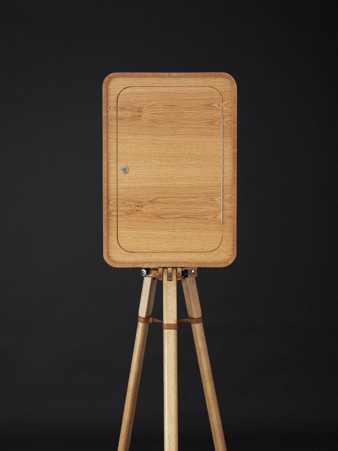 Custom made Photo Booth construction, according to the specifications and designs provided by the photographer. The Photo Booth box, is made of plywood lined with oak veneer. Its form is rectangular carrying semi-circular corners, where a special way of cutting the plywood was applied. The technique used allows the wood to curve naturally. The box has an adaptable camera mount. The base can also be adjusted in height, but after applying special regulations , it also allows the photographer to adjust how close the lens of the camera can be to the hole, allowing it to move back and forth. It also has a special slot for a tablet that is placed in order to accommodate the handling of the Photo Booth. Moreover, it also carries a vent made of gold plexiglass that has been laser-cut, in case additional equipment is placed inside the box, such as a digital photo printer. For reasons that serve the functionality of the box, there is a door at the back of the same form made of the same wood, which is secured with a lock. To support the box we designed a photographic tripod. The tripod is entirely made of solid oak, with simple and clean lines. The base of the tripod, where the box is placed, has been handmade from solid timber plywood. This adds both to its aesthetics and stability. As for the legs, their opening is adjusted by special straps made of leather, which are held in place by a brass ring in the center of the tripod. The finish of the construction was made with polyurethane matte (non yellowing) varnishes.
