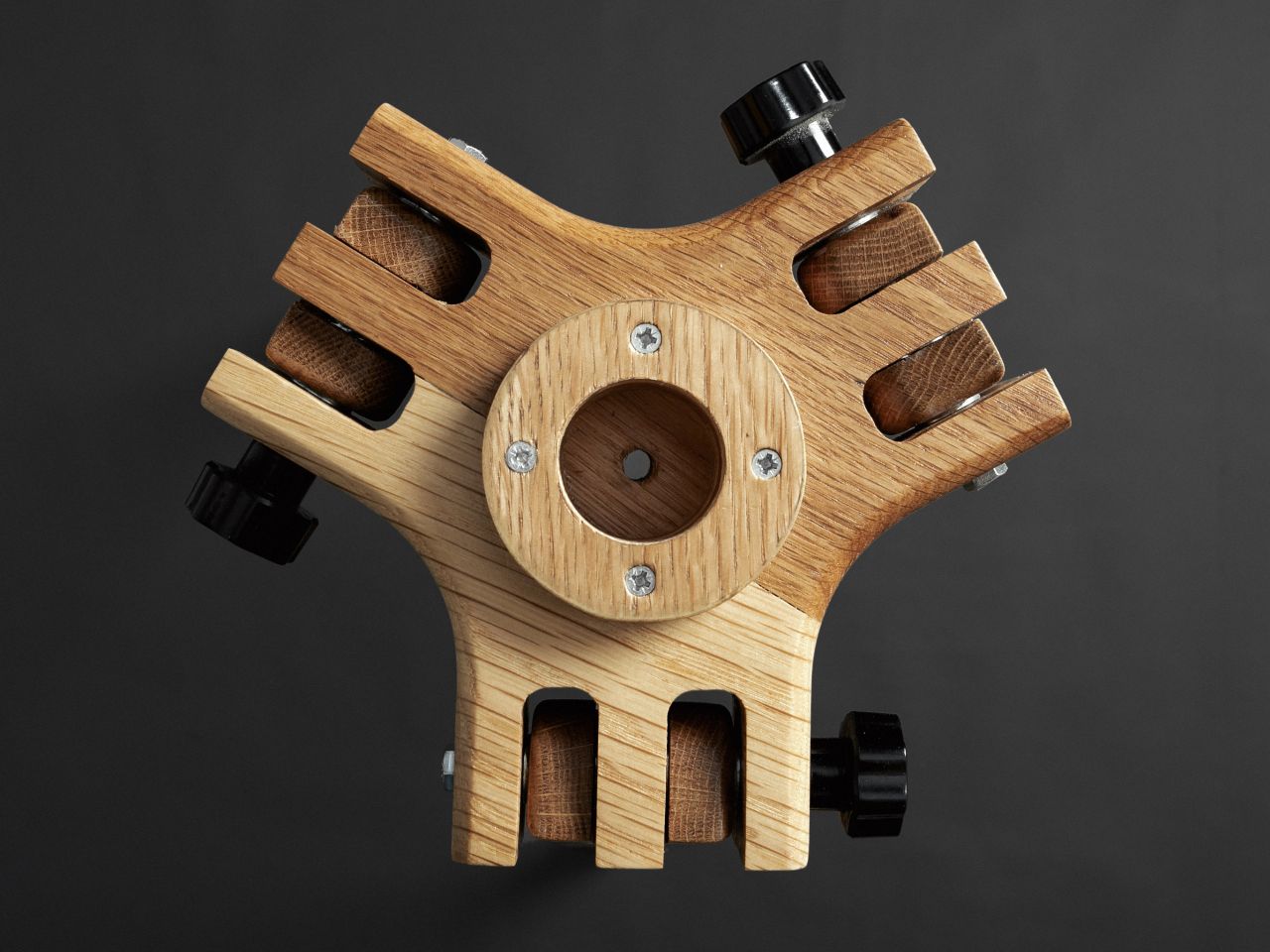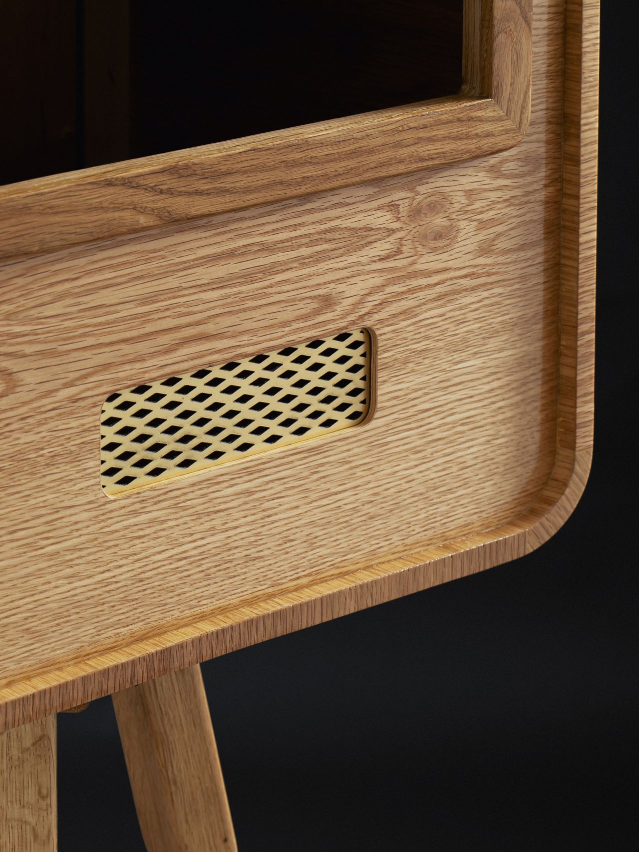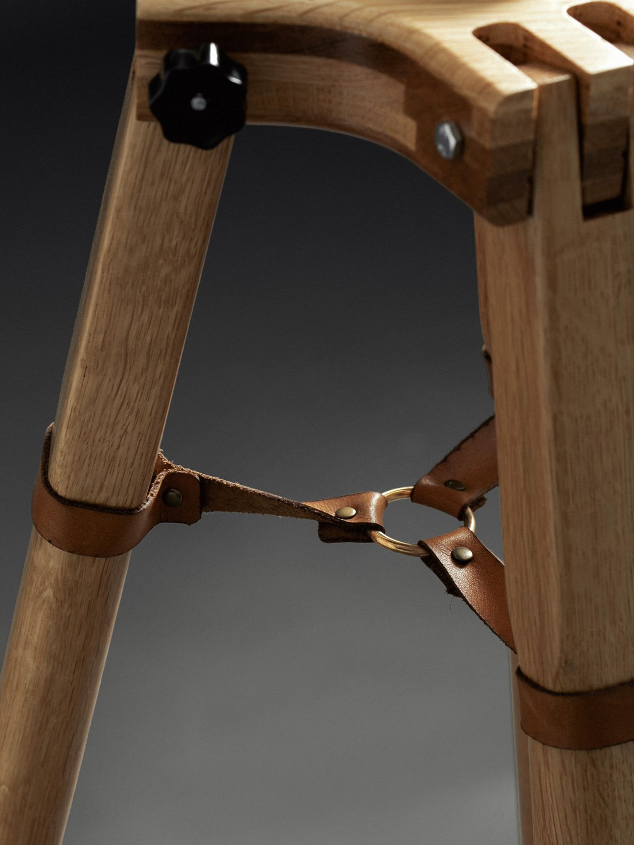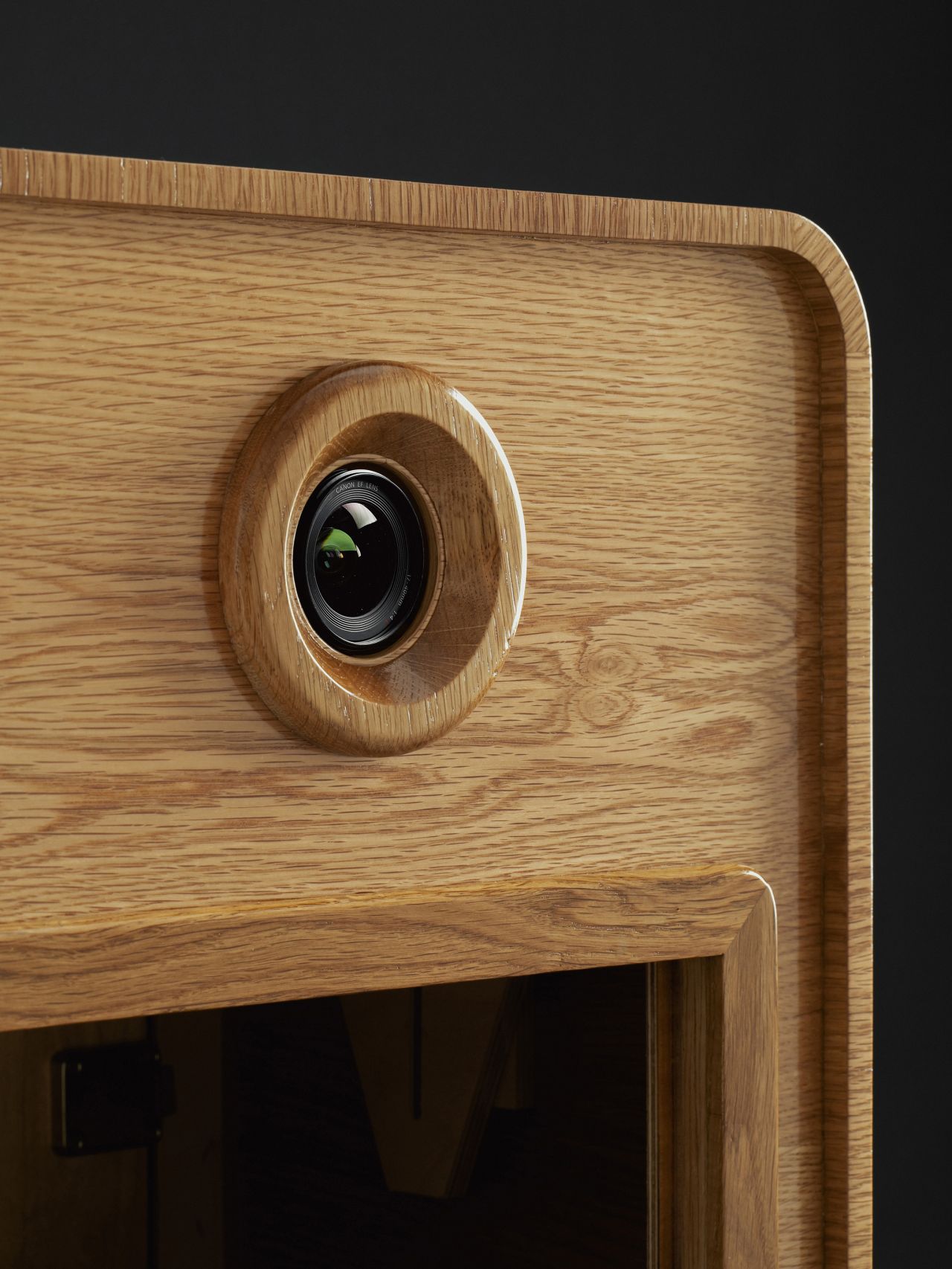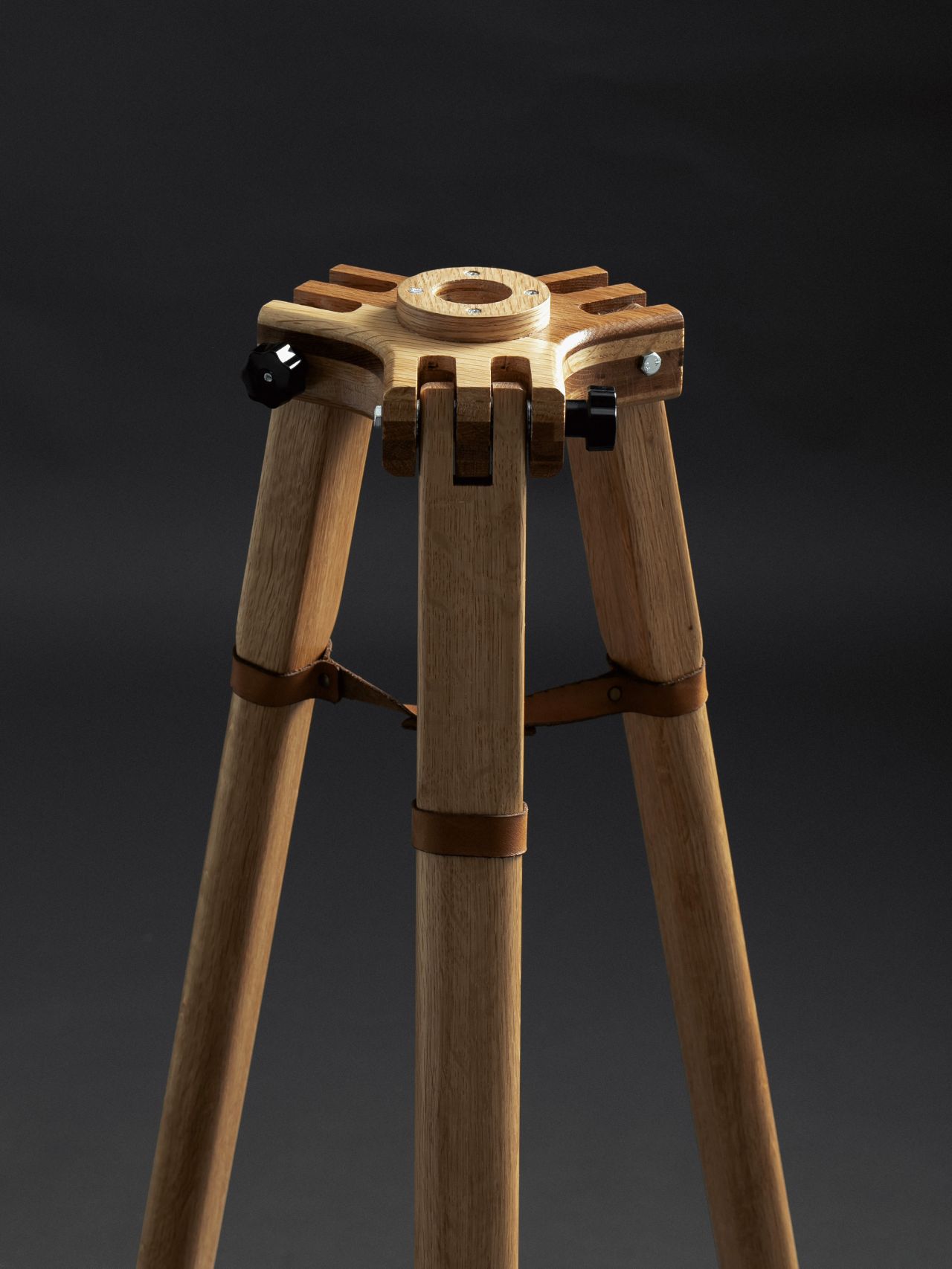 Custom made Photo Booth construction, according to the specifications and designs provided by the photographer. The Photo Booth box, is made of plywood lined with oak veneer. Its form is rectangular carrying semi-circular corners, where a special way of cutting the plywood was applied. The technique used allows the wood to curve naturally. The box has an adaptable camera mount. The base can also be adjusted in height, but after applying special regulations , it also allows the photographer to adjust how close the lens of the camera can be to the hole, allowing it to move back and forth. It also has a special slot for a tablet that is placed in order to accommodate the handling of the Photo Booth. Moreover, it also carries a vent made of gold plexiglass that has been laser-cut, in case additional equipment is placed inside the box, such as a digital photo printer. For reasons that serve the functionality of the box, there is a door at the back of the same form made of the same wood, which is secured with a lock. To support the box we designed a photographic tripod. The tripod is entirely made of solid oak, with simple and clean lines. The base of the tripod, where the box is placed, has been handmade from solid timber plywood. This adds both to its aesthetics and stability. As for the legs, their opening is adjusted by special straps made of leather, which are held in place by a brass ring in the center of the tripod. The finish of the construction was made with polyurethane matte (non yellowing) varnishes.