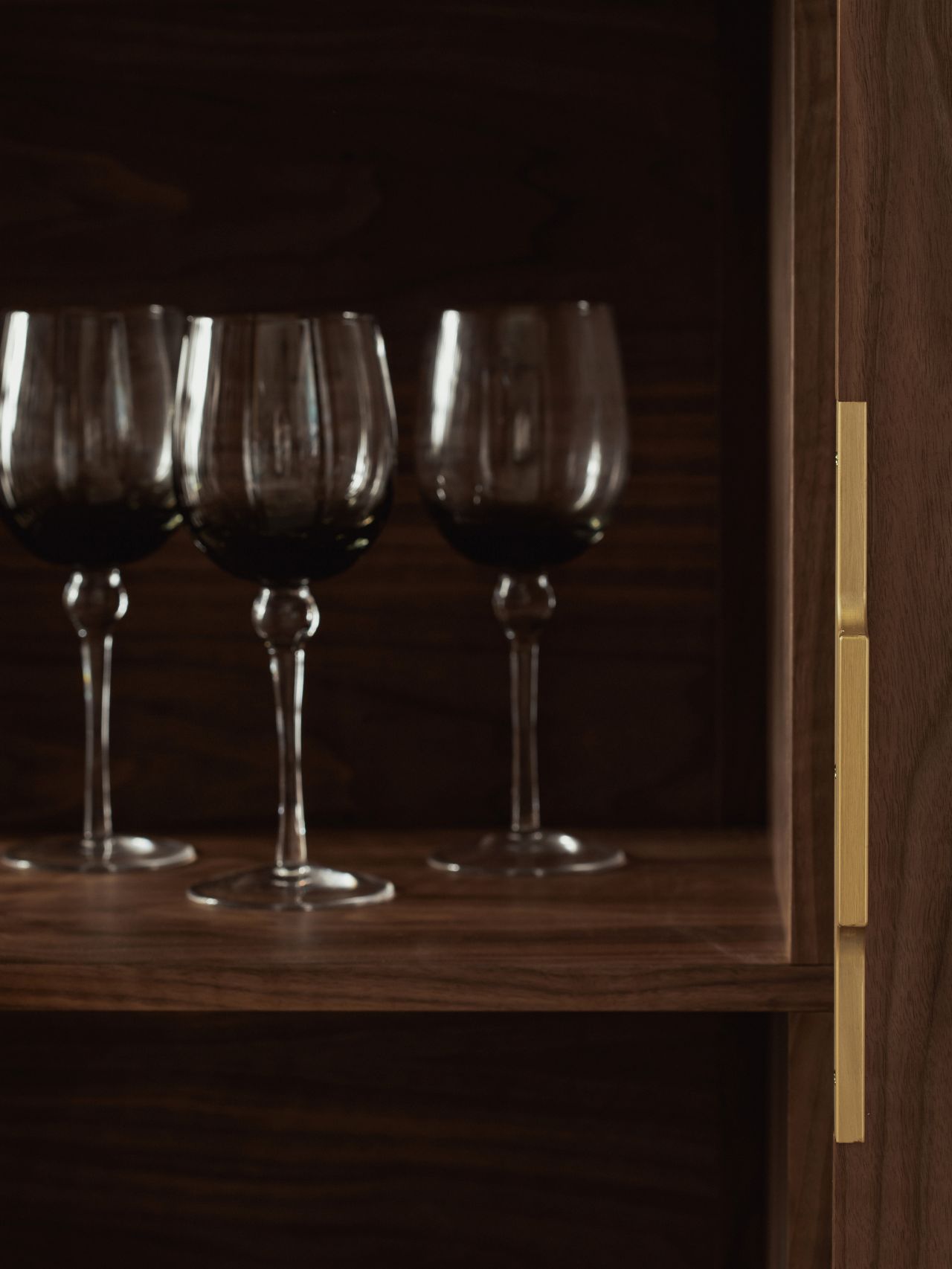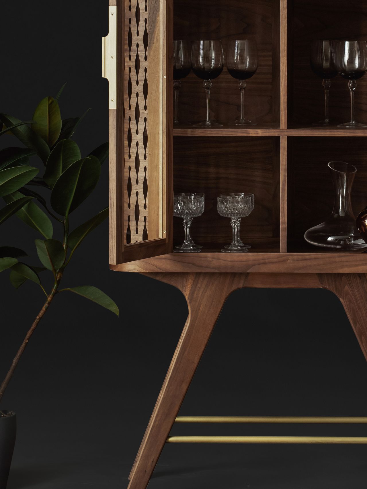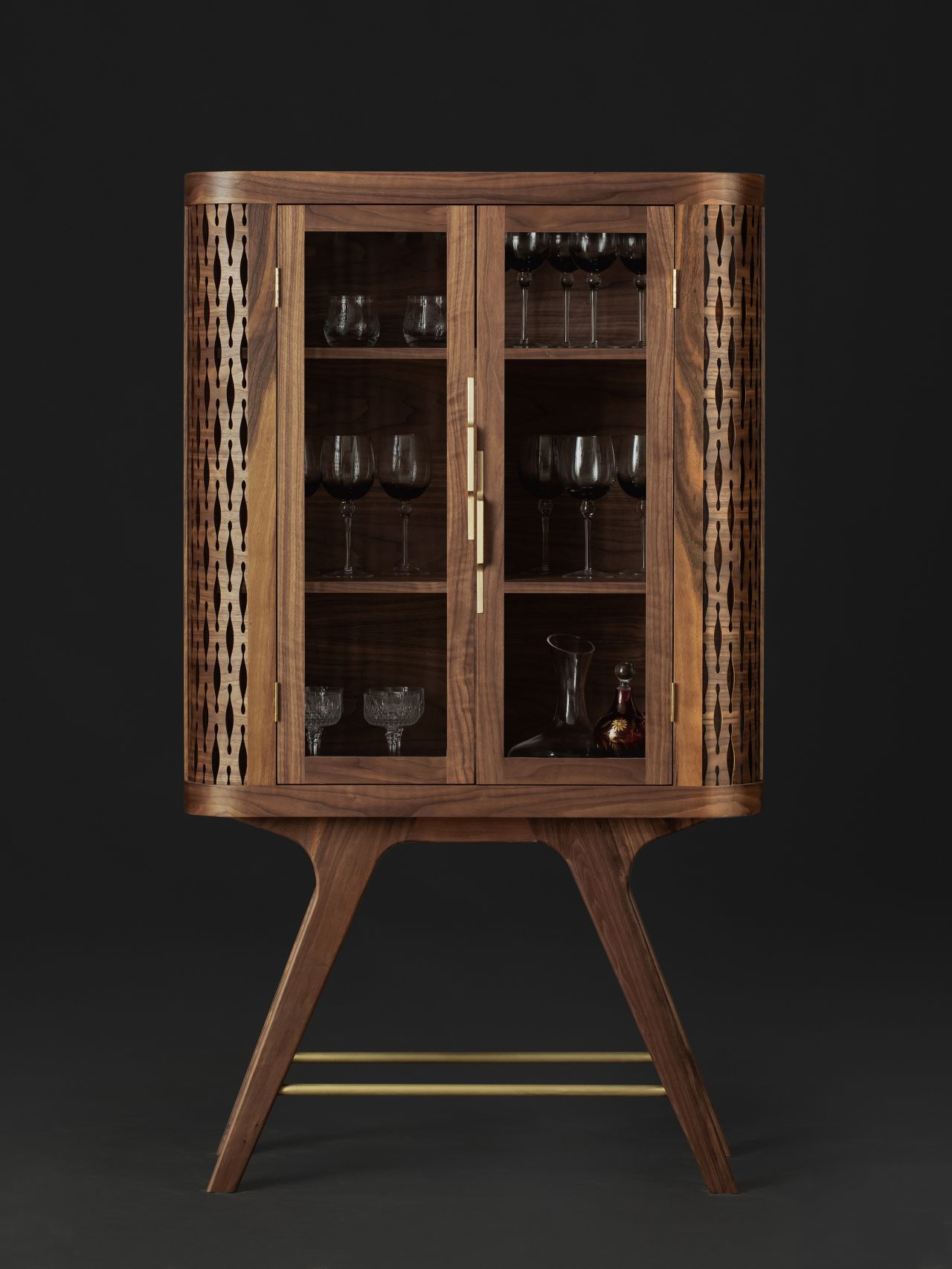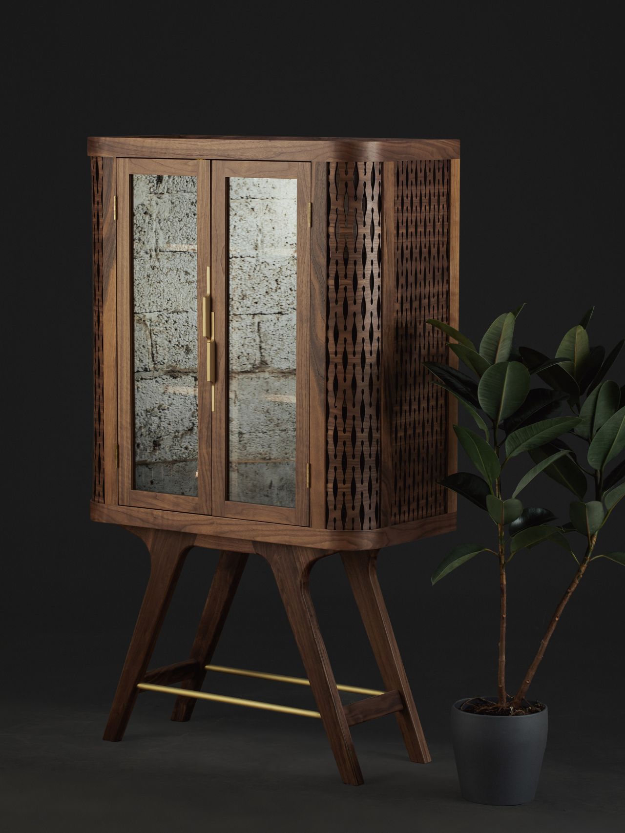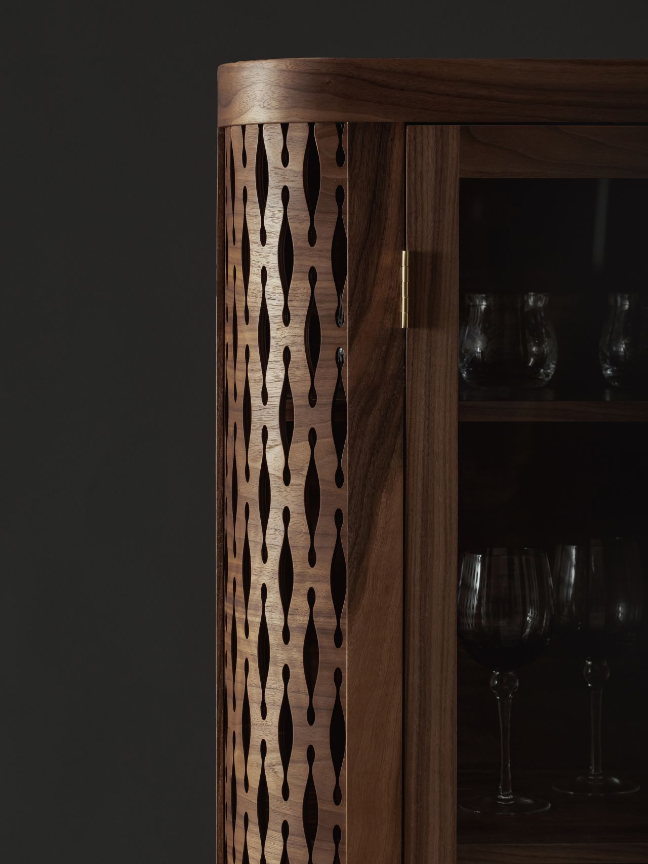 This custom-designed wine cabinet was entirely crafted in our studio, based on specific dimensions provided by the client as the the only one specification. Its creation represents a balance between the clarity of form, timeless aesthetics, and functionality. The construction consists of two distinct parts: the main body of the cabinet and its legs. The cabinet's body serves as a display case, featuring a load-bearing frame made from solid American walnut, with side panels veneered in walnut, where the wood grain runs seamlessly around the perimeter of the piece. The form is semi-circular at its edges—a signature element of our design identity—enhancing the flow and smoothness of its overall geometry. Perforated side panels with a repeating geometric pattern are integrated, providing controlled transparency and light management, further contributing to the visual brightness of this item. The doors are made from solid walnut and are fitted with safety glass, maintaining the required durability and aesthetic clarity. The handles are entirely handcrafted from solid brass, as are the other peripheral components of the cabinet, including hinges and screws. The choice of this material enhances the premium identity of the piece, creating an elegant aesthetic contrast with the deep, natural tone of the walnut wood. The base of the cabinet draws inspiration from Mid-Century Modern design, featuring angled, curved legs made of solid wood. These legs are integrated in such a way that they create a visual sense of levitation for the cabinet. Stability is ensured through cross-brass rods, which serve not only as structural elements but also as decorative accents of high aesthetic value. The final finish is achieved with matte acrylic varnishes to preserve the natural texture and color of the walnut while protecting the piece from everyday use. For the project's photo shooting, we collaborated with Papahatzis Home, which provided the glassware and decorative objects that highlight the cabinet's functional use and aesthetic integrity.