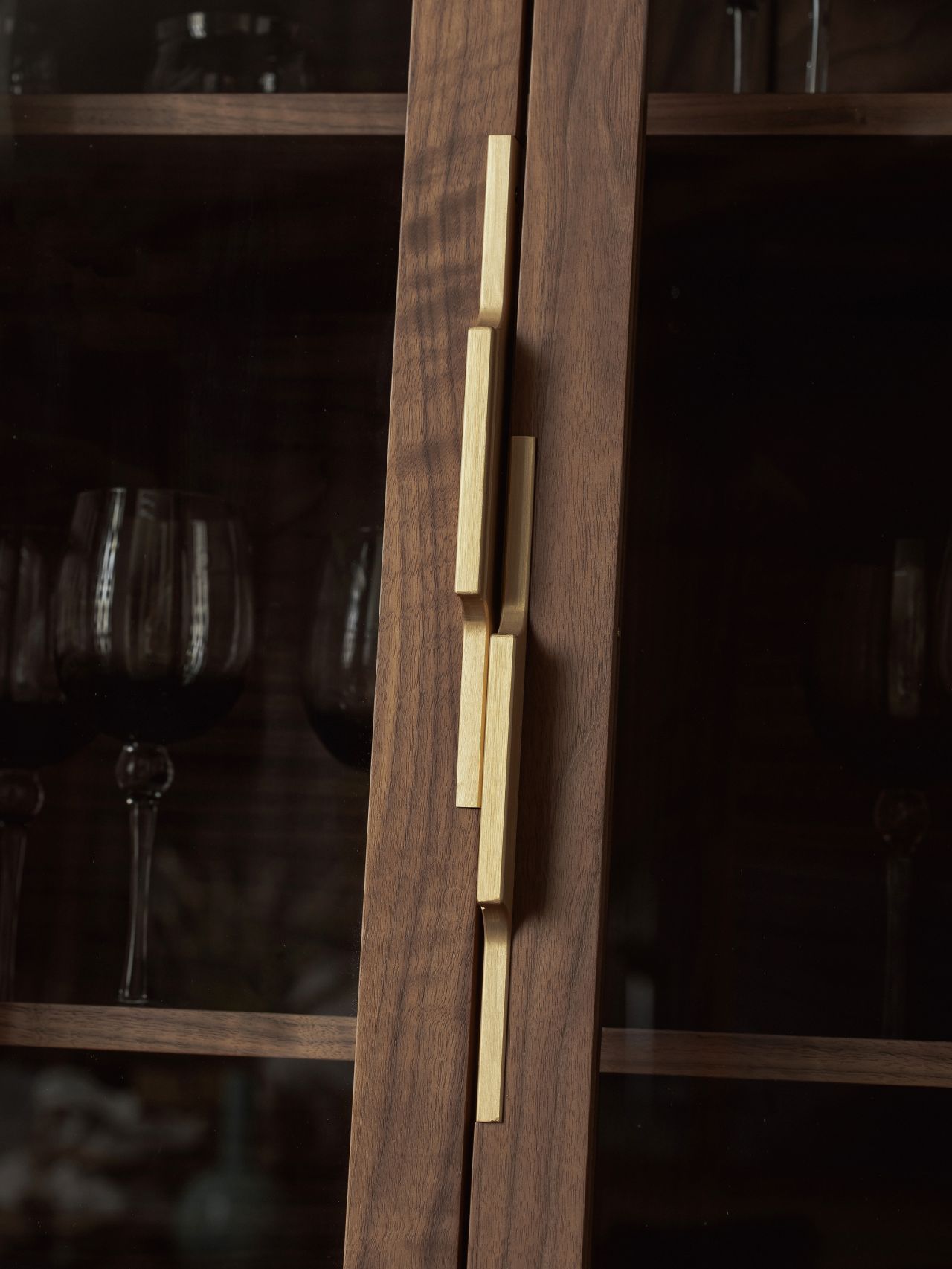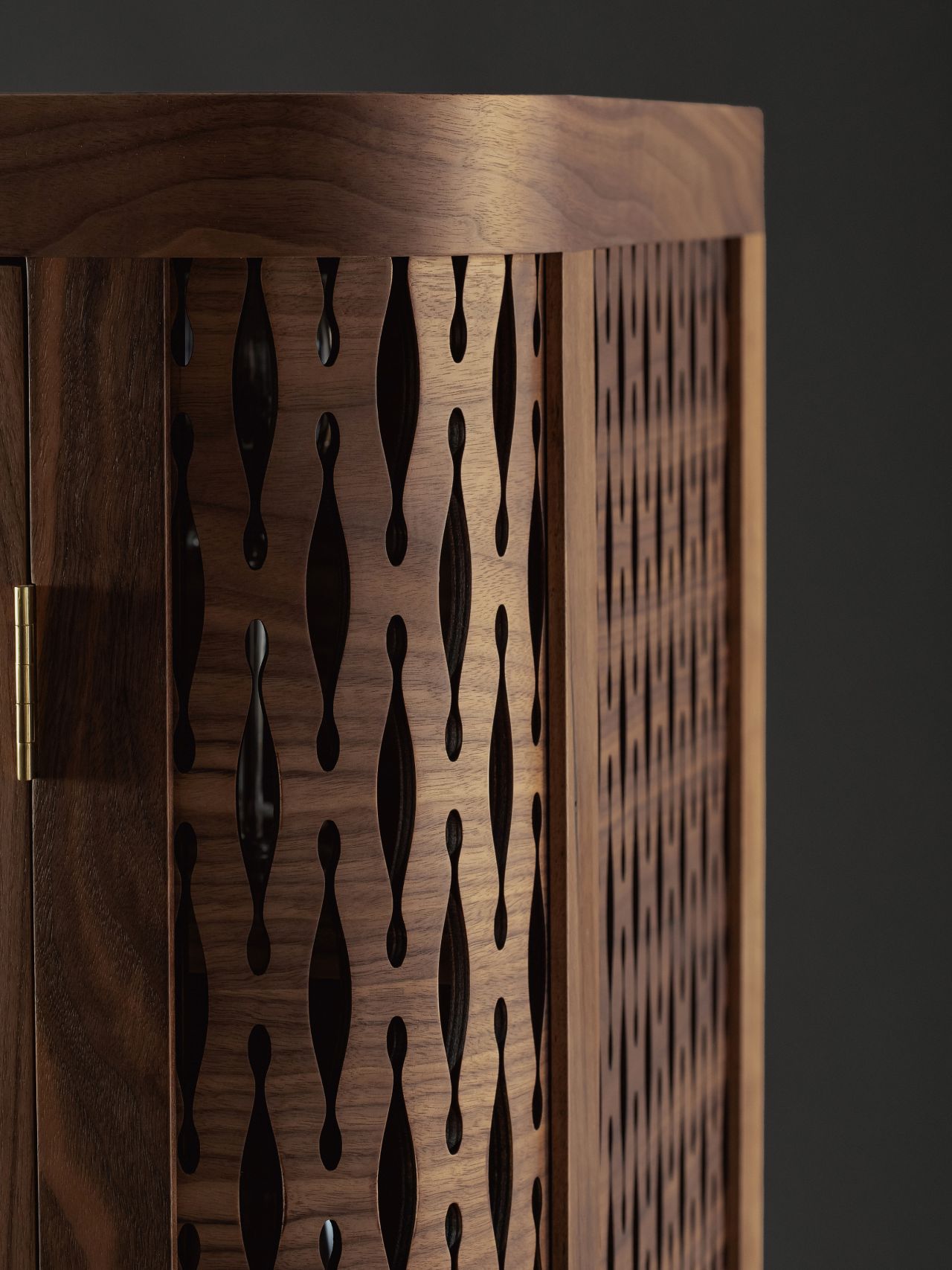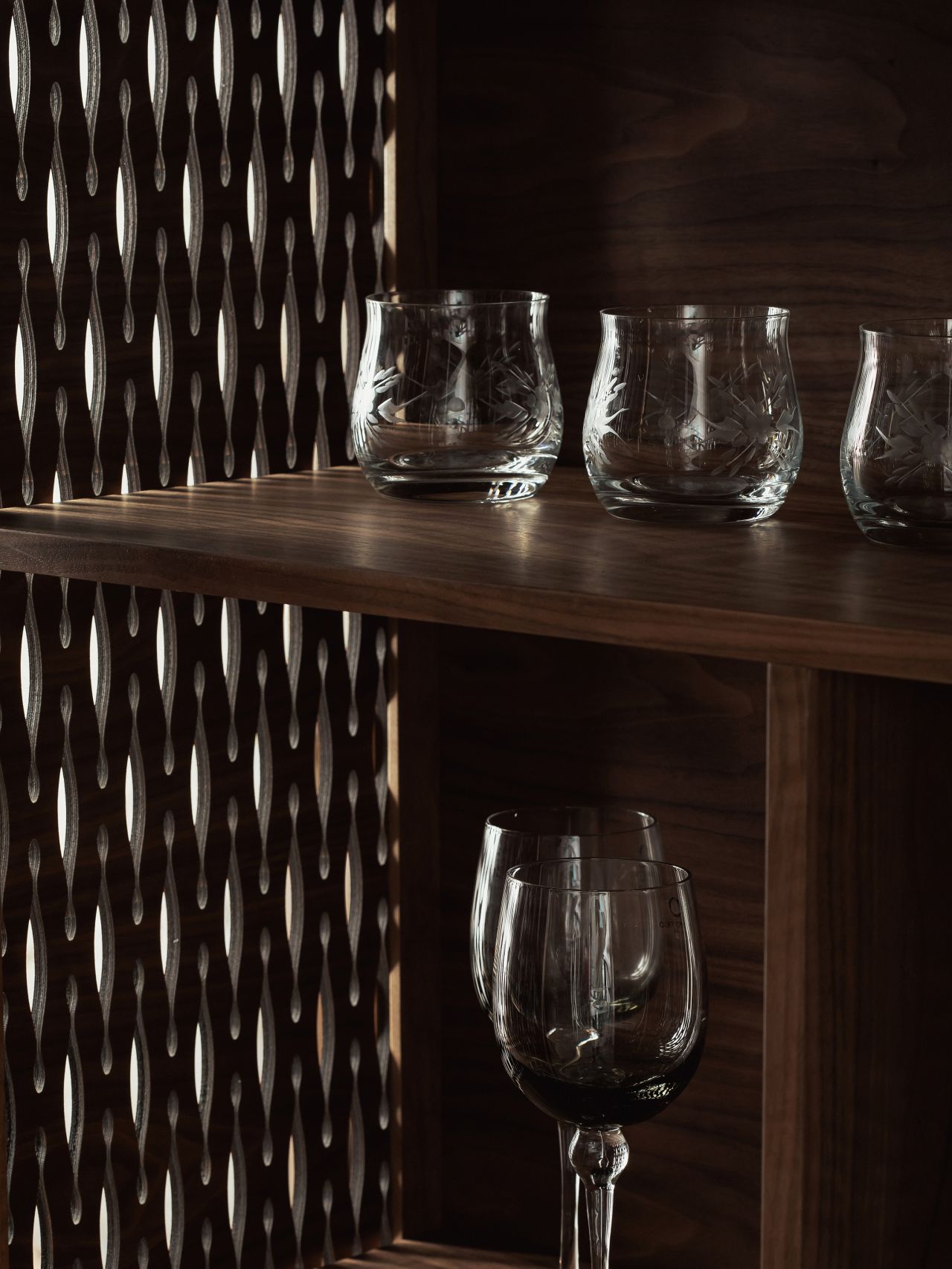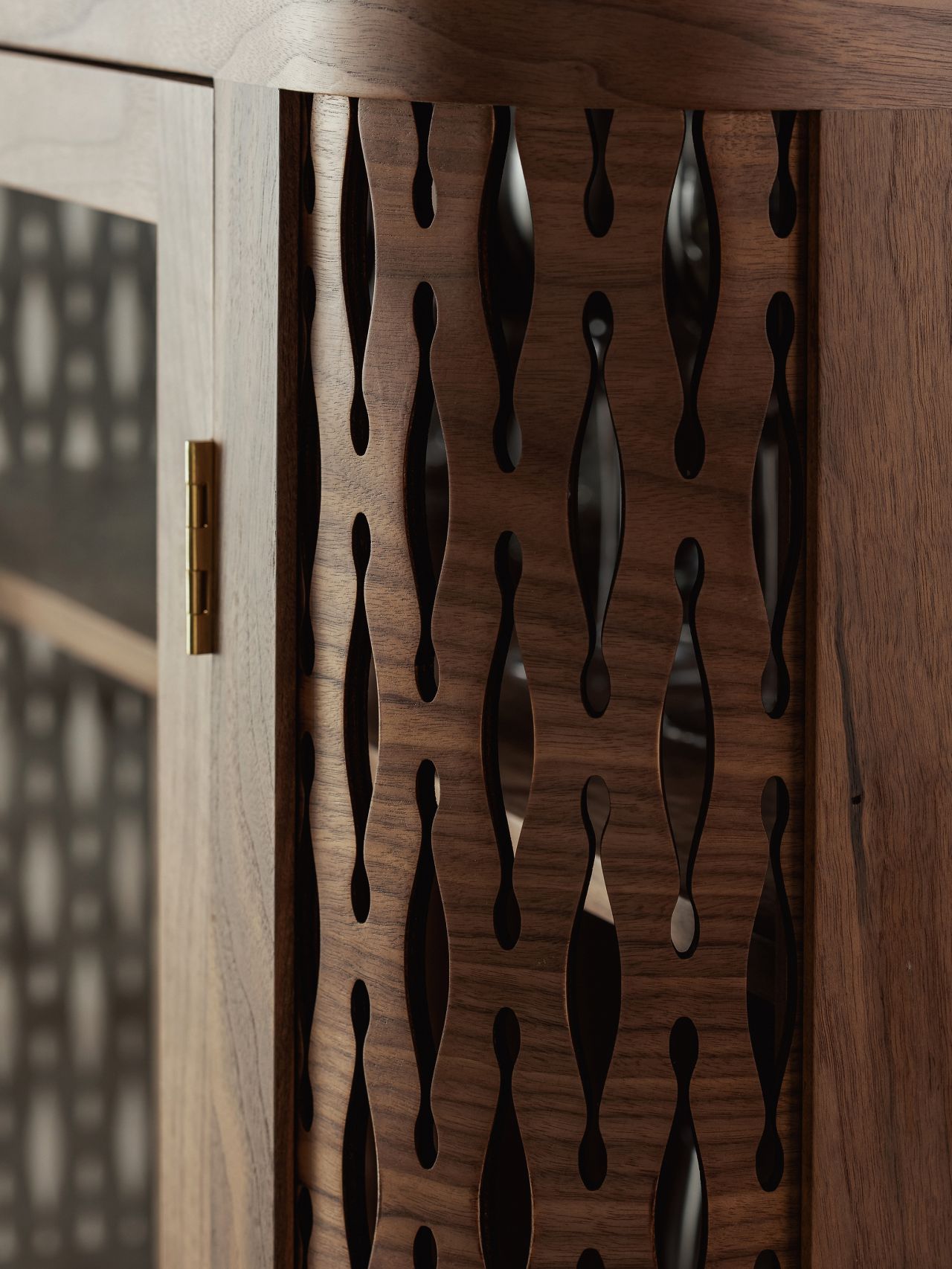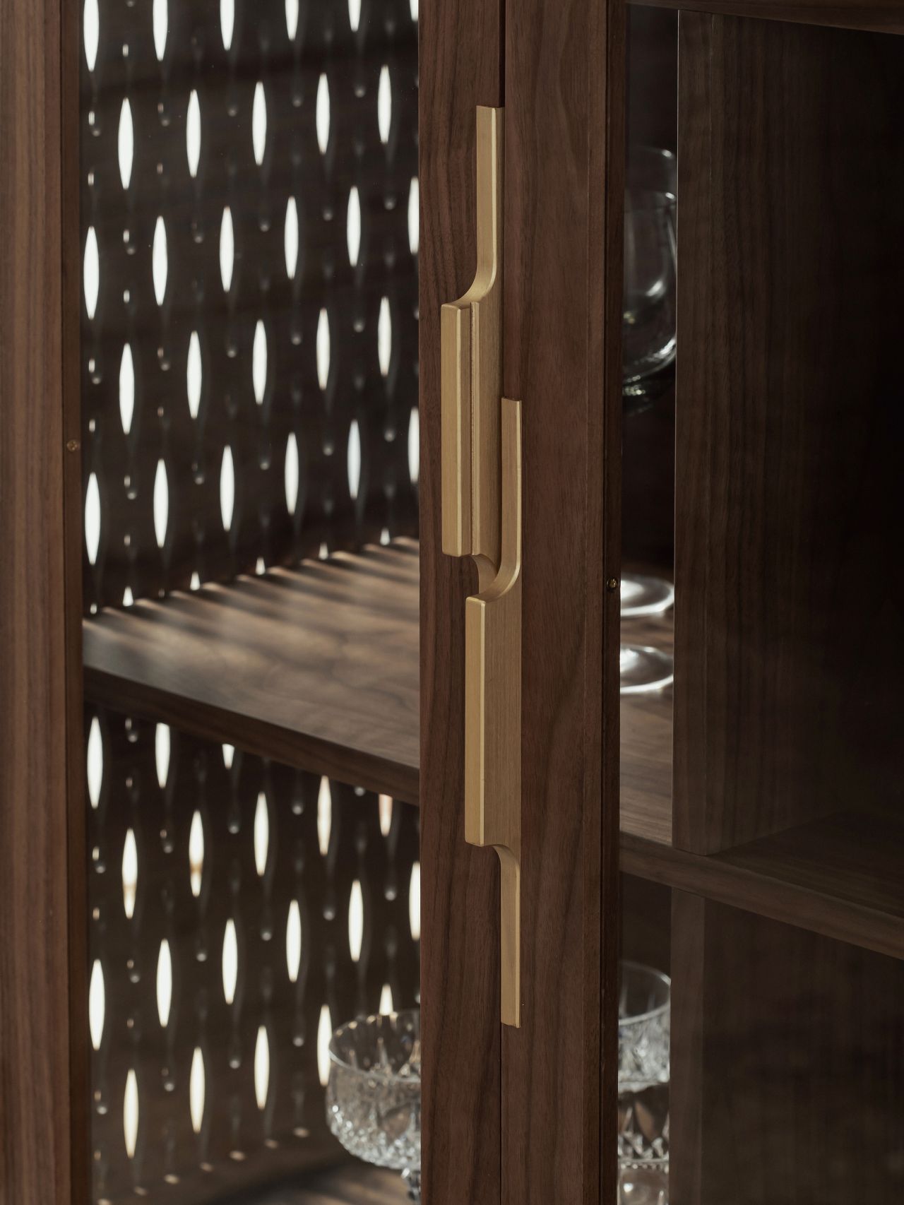 This custom-designed wine cabinet was entirely crafted in our studio, based on specific dimensions provided by the client as the the only one specification. Its creation represents a balance between the clarity of form, timeless aesthetics, and functionality. The construction consists of two distinct parts: the main body of the cabinet and its legs. The cabinet's body serves as a display case, featuring a load-bearing frame made from solid American walnut, with side panels veneered in walnut, where the wood grain runs seamlessly around the perimeter of the piece. The form is semi-circular at its edges—a signature element of our design identity—enhancing the flow and smoothness of its overall geometry. Perforated side panels with a repeating geometric pattern are integrated, providing controlled transparency and light management, further contributing to the visual brightness of this item. The doors are made from solid walnut and are fitted with safety glass, maintaining the required durability and aesthetic clarity. The handles are entirely handcrafted from solid brass, as are the other peripheral components of the cabinet, including hinges and screws. The choice of this material enhances the premium identity of the piece, creating an elegant aesthetic contrast with the deep, natural tone of the walnut wood. The base of the cabinet draws inspiration from Mid-Century Modern design, featuring angled, curved legs made of solid wood. These legs are integrated in such a way that they create a visual sense of levitation for the cabinet. Stability is ensured through cross-brass rods, which serve not only as structural elements but also as decorative accents of high aesthetic value. The final finish is achieved with matte acrylic varnishes to preserve the natural texture and color of the walnut while protecting the piece from everyday use. For the project's photo shooting, we collaborated with Papahatzis Home, which provided the glassware and decorative objects that highlight the cabinet's functional use and aesthetic integrity.