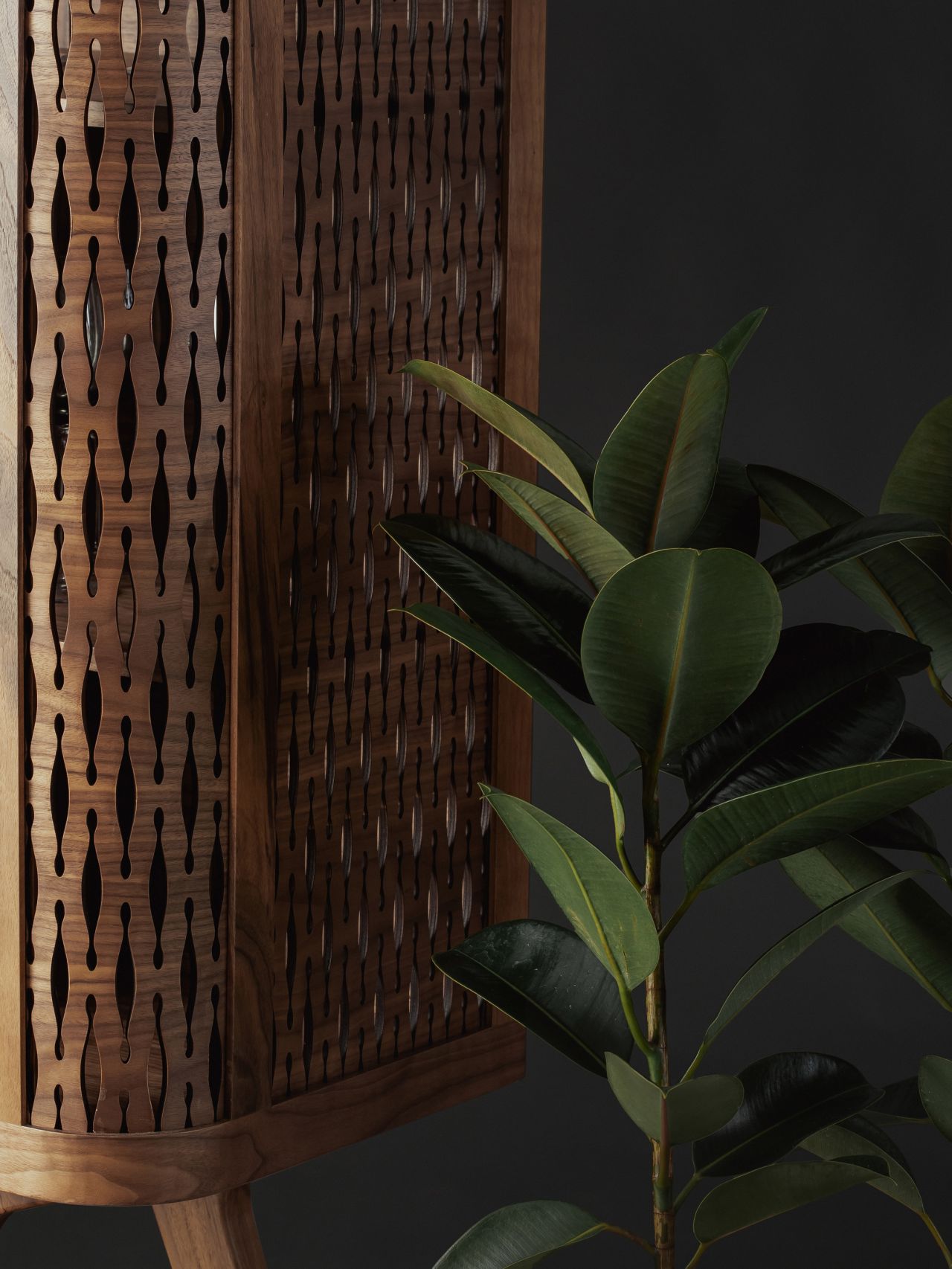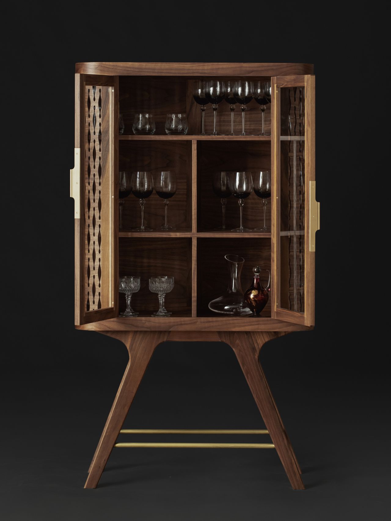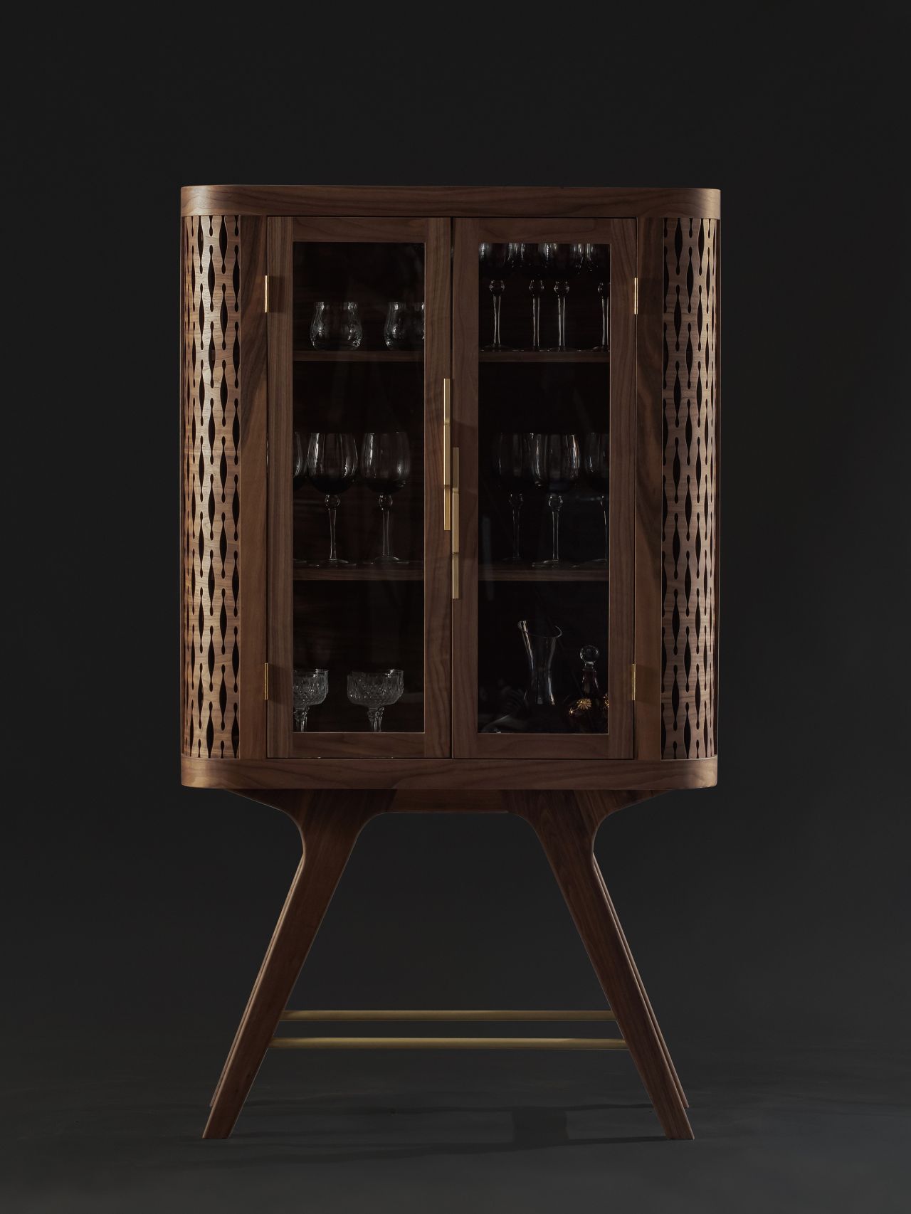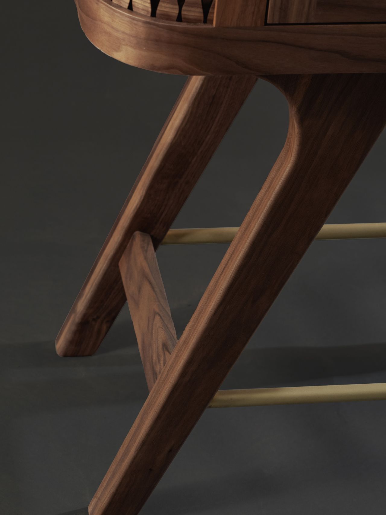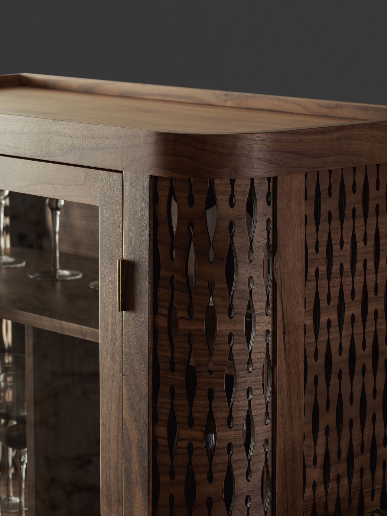 This custom-designed wine cabinet was entirely crafted in our studio, based on specific dimensions provided by the client as the the only one specification. Its creation represents a balance between the clarity of form, timeless aesthetics, and functionality. The construction consists of two distinct parts: the main body of the cabinet and its legs. The cabinet's body serves as a display case, featuring a load-bearing frame made from solid American walnut, with side panels veneered in walnut, where the wood grain runs seamlessly around the perimeter of the piece. The form is semi-circular at its edges—a signature element of our design identity—enhancing the flow and smoothness of its overall geometry. Perforated side panels with a repeating geometric pattern are integrated, providing controlled transparency and light management, further contributing to the visual brightness of this item. The doors are made from solid walnut and are fitted with safety glass, maintaining the required durability and aesthetic clarity. The handles are entirely handcrafted from solid brass, as are the other peripheral components of the cabinet, including hinges and screws. The choice of this material enhances the premium identity of the piece, creating an elegant aesthetic contrast with the deep, natural tone of the walnut wood. The base of the cabinet draws inspiration from Mid-Century Modern design, featuring angled, curved legs made of solid wood. These legs are integrated in such a way that they create a visual sense of levitation for the cabinet. Stability is ensured through cross-brass rods, which serve not only as structural elements but also as decorative accents of high aesthetic value. The final finish is achieved with matte acrylic varnishes to preserve the natural texture and color of the walnut while protecting the piece from everyday use. For the project's photo shooting, we collaborated with Papahatzis Home, which provided the glassware and decorative objects that highlight the cabinet's functional use and aesthetic integrity.