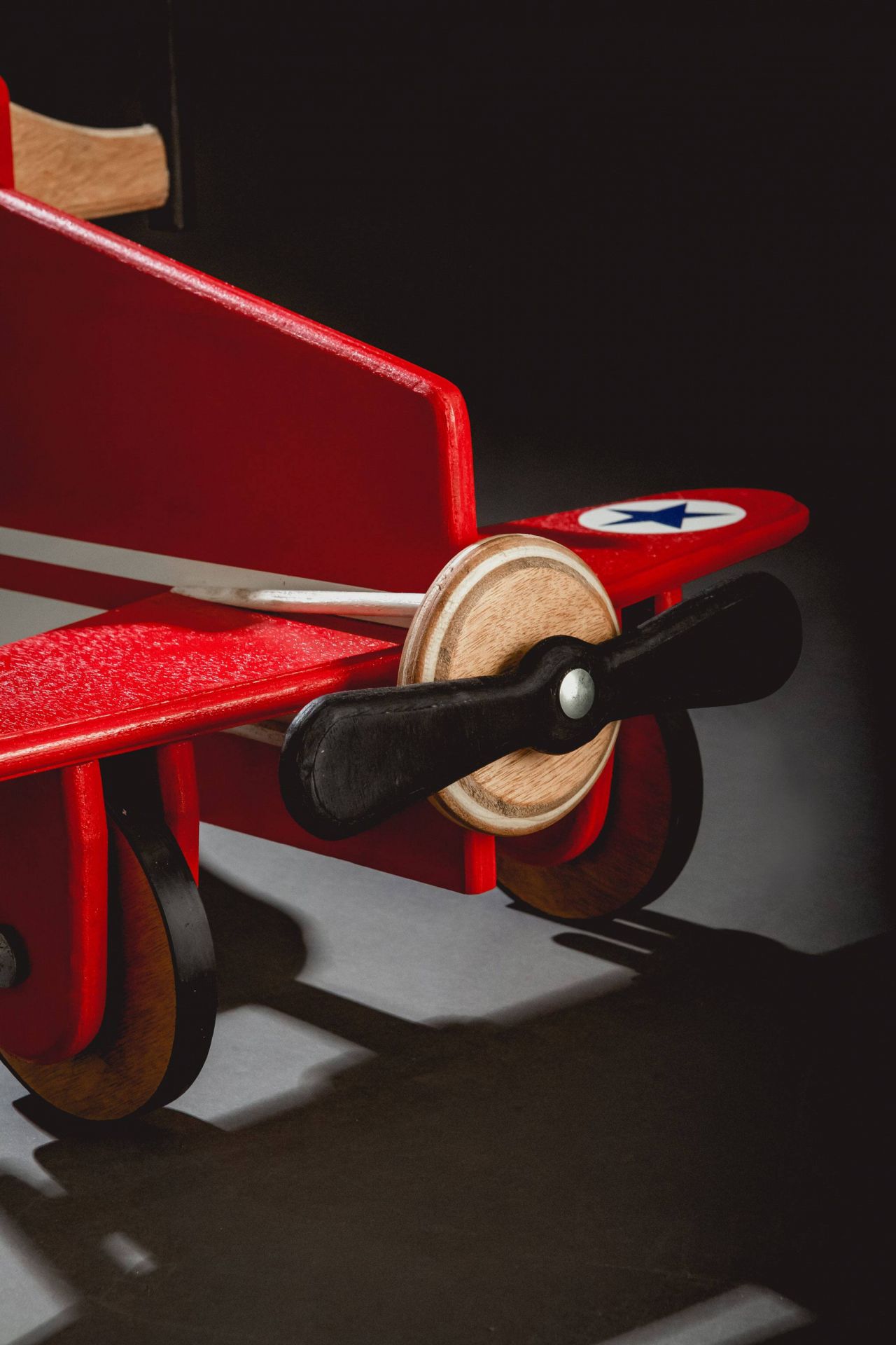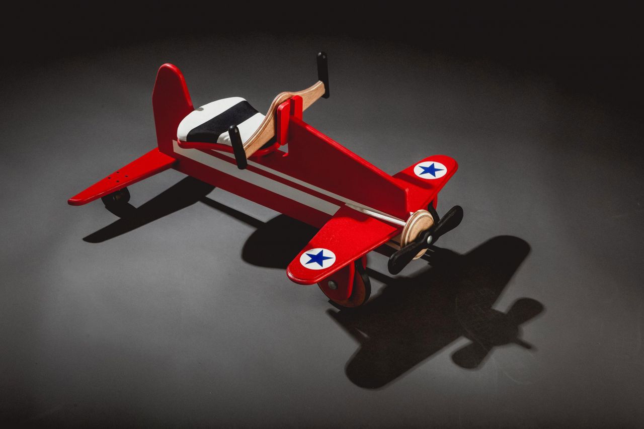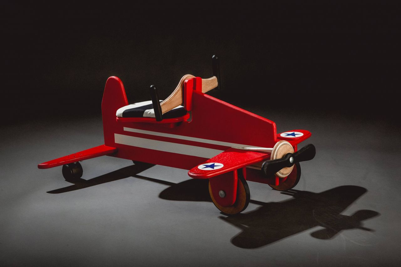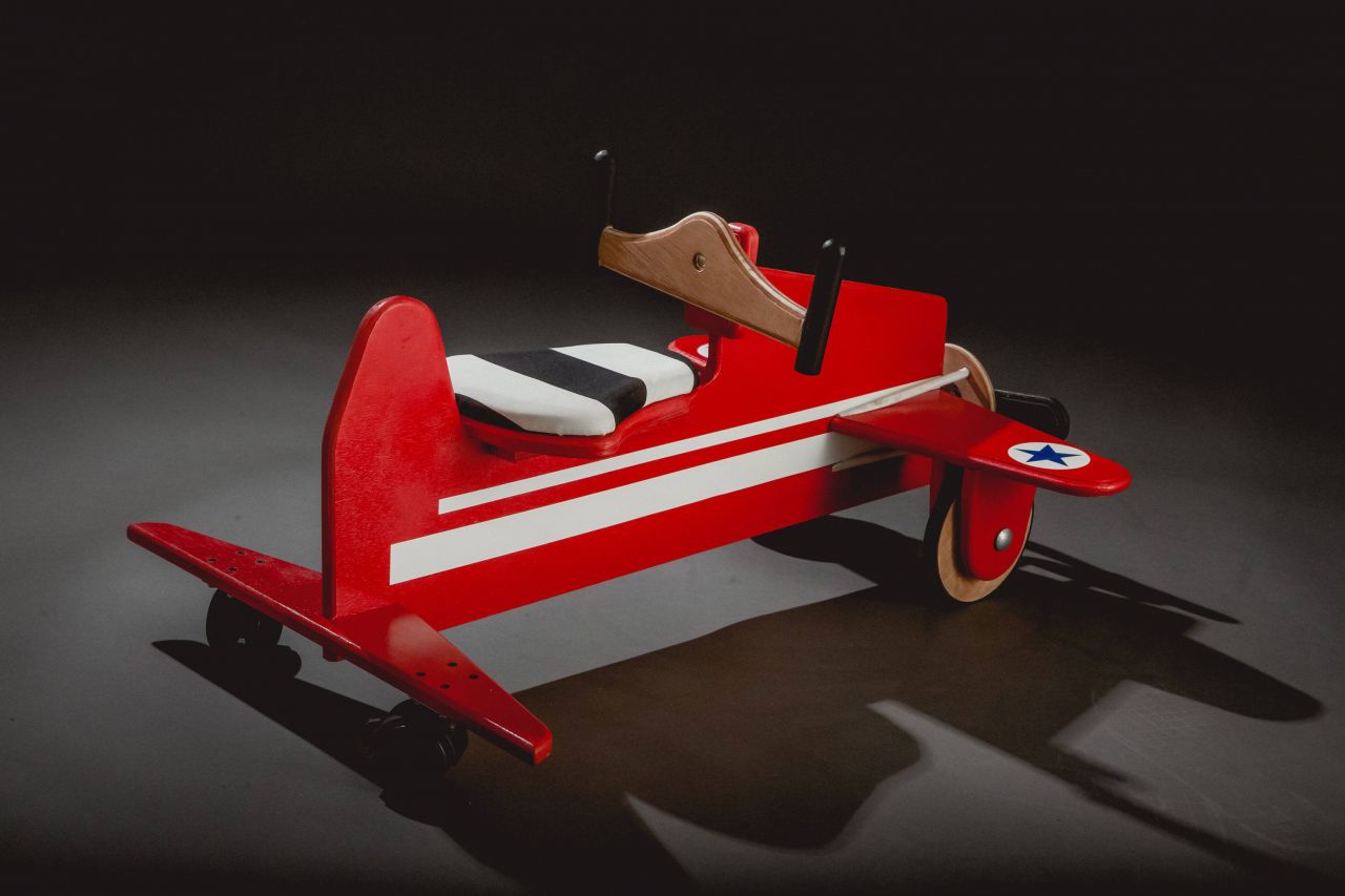 Design and construction of a toy in the shape of an airplane. Since it is a toy, we wanted to add to the design a vintage aesthetic so it has been painted in the appropriate way. The toy was designed for toddlers who are just starting to walk. It was entirely handcrafted from okoumé plywood and solid beech timber, where necessary. All edges of the construction are specially treated to prevent any injury to the user. The materials used are completely safe and non-toxic. The construction is hand painted with the help of stencils in certified water colors that are friendly for children. The chair has been fitted with a special material that absorbs vibrations and is covered with a rough cotton fabric. The wheels have been lined with rubber around the perimeter to allow smooth movement of the toy. In addition, it was made under the rules following the thorough study while designing it, so that it prevents tripping over.