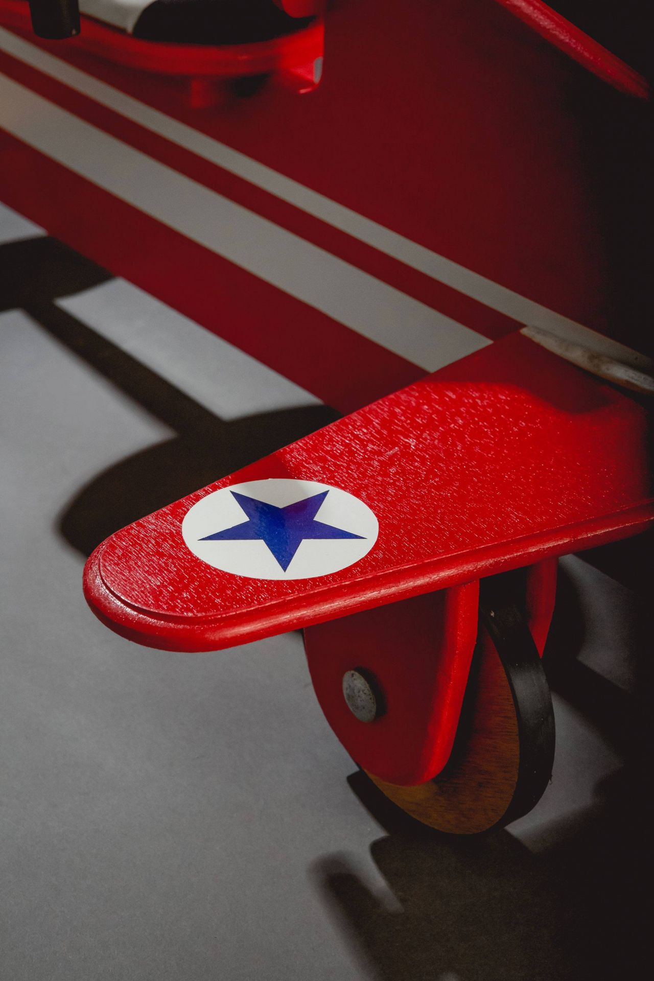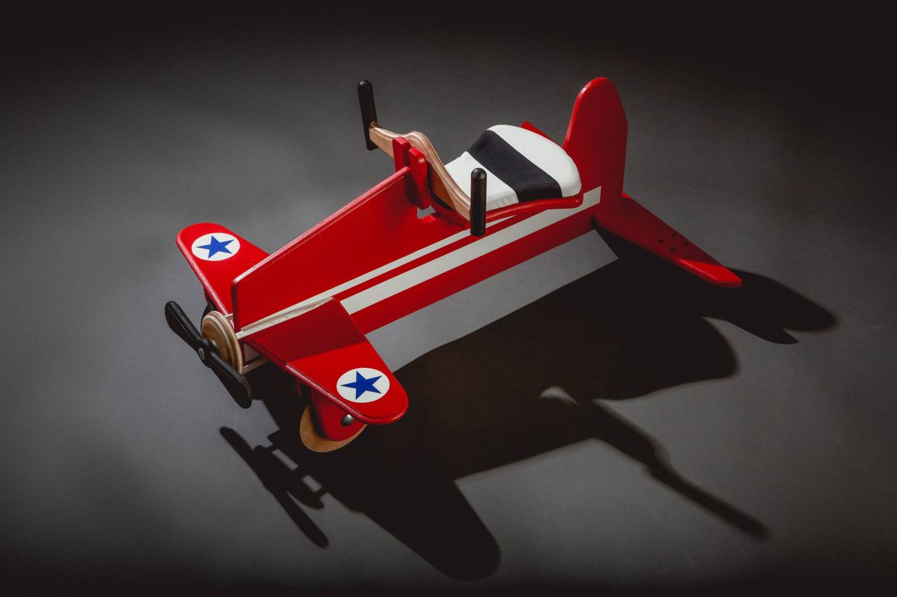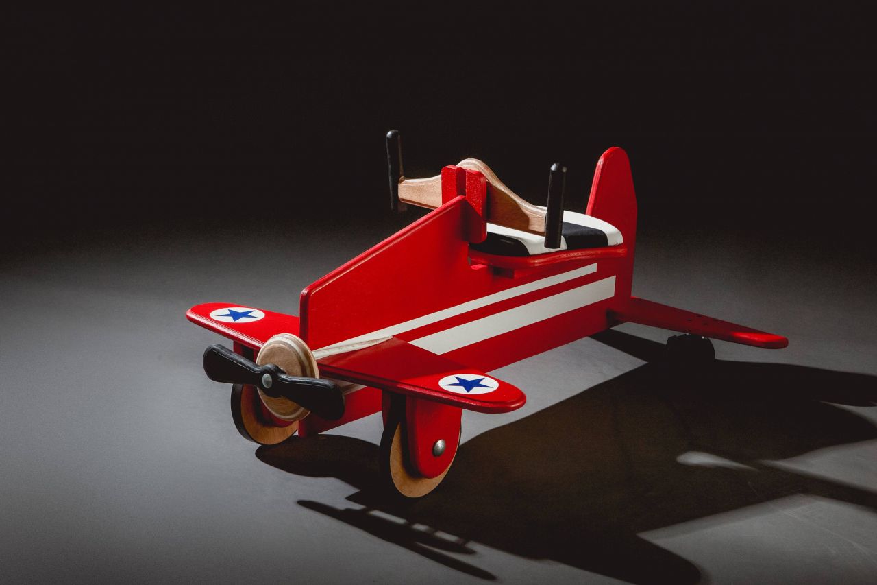 Design and construction of a toy in the shape of an airplane. Since it is a toy, we wanted to add to the design a vintage aesthetic so it has been painted in the appropriate way. The toy was designed for toddlers who are just starting to walk. It was entirely handcrafted from okoumé plywood and solid beech timber, where necessary. All edges of the construction are specially treated to prevent any injury to the user. The materials used are completely safe and non-toxic. The construction is hand painted with the help of stencils in certified water colors that are friendly for children. The chair has been fitted with a special material that absorbs vibrations and is covered with a rough cotton fabric. The wheels have been lined with rubber around the perimeter to allow smooth movement of the toy. In addition, it was made under the rules following the thorough study while designing it, so that it prevents tripping over.