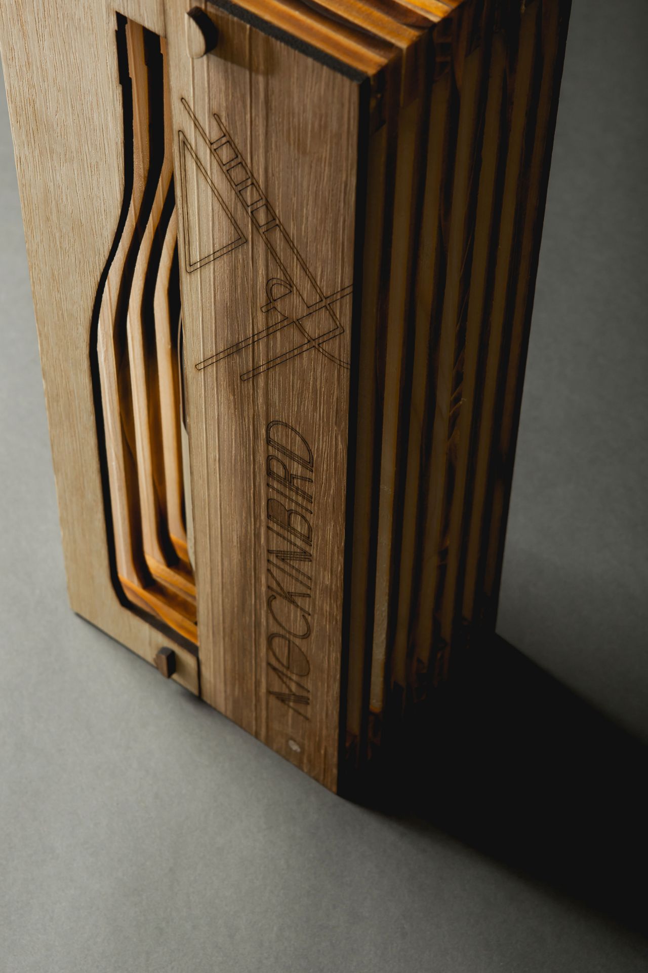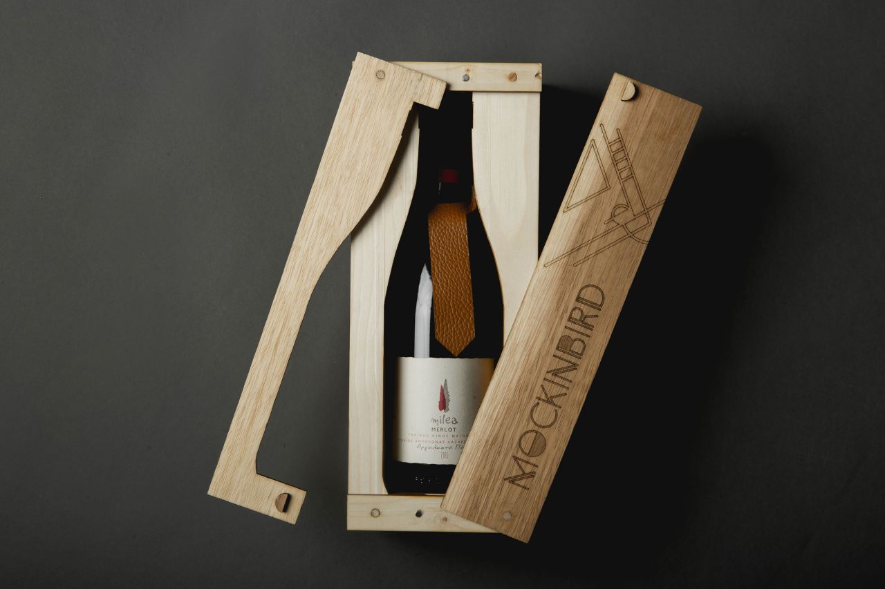 Our desire to express via that gift the whole range and aesthetics of our work, led us to the creation of this product. We made sure that the elegant packaging highlights the broadness of our work and at the same time the impulse of the Christmas mood to offer an exceptional red wine to accompany festive table. Therefore, we applied Laser cuts, Laser engravings, intricate closing mechanisms and an outstanding variety of wood. The package combines different layers of rustic fir, in a strict geometric shape but at the same time embracing the shape of the bottle, which protects the bottle during transport. The upper surface and the bottom of the package follow the same philosophy, so that the two-tone iroko used, appears much more fanciful and tropical. The two parts of the top open in opposite directions through a hidden mechanism, giving a different geometry to the whole package and partially highlighting its interior. In general, the package allows full lighting of its contents, ideally marking out the excellence of Merlot 2015 / Milea Winery in Argalasti, Pelion, which we have chosen as our corporate gift for 2018.