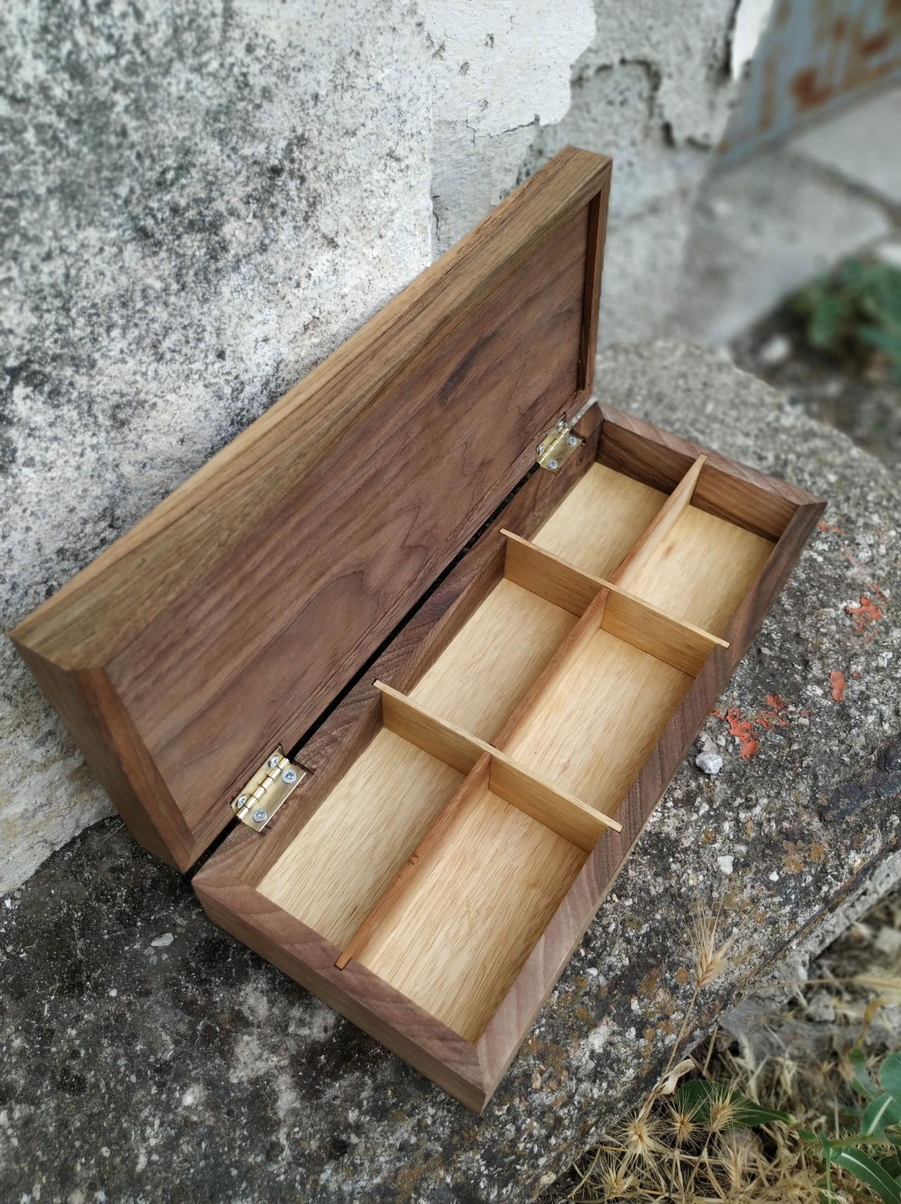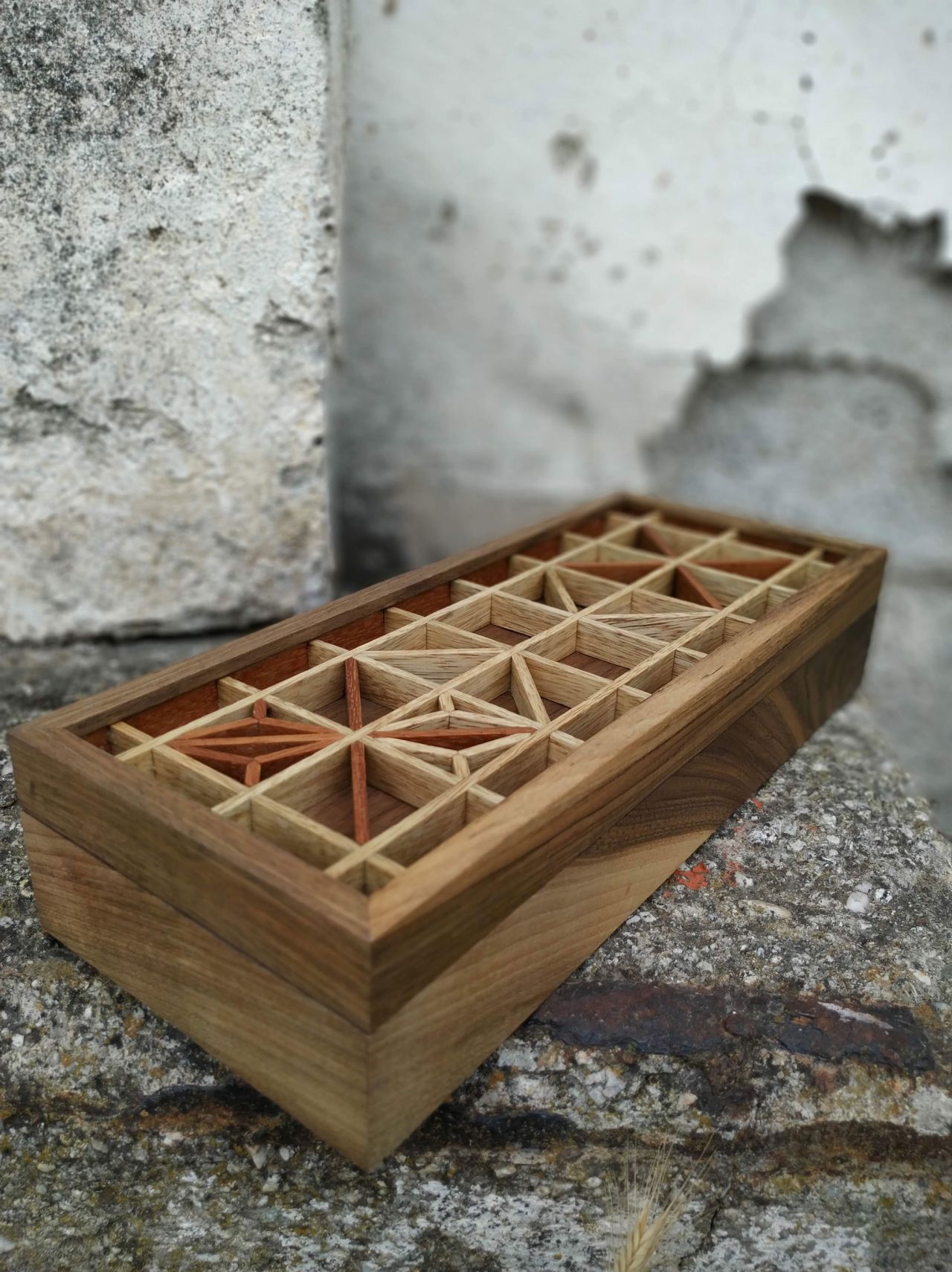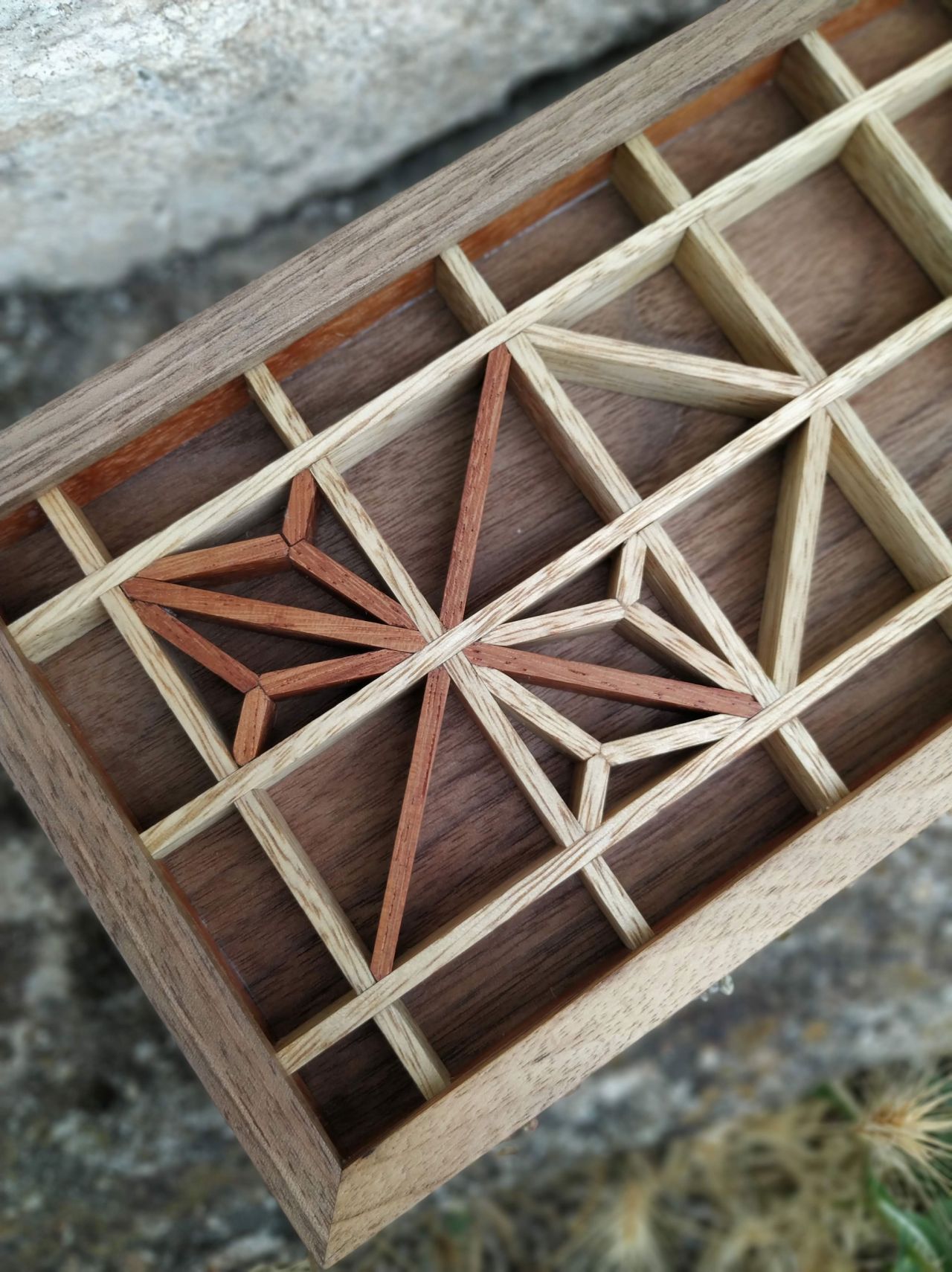 In this project , a solid walnut root herbal case was designed and handcrafted . The box top was built by means of the traditional Japanese kumiko technique, in which the wood pattern is created without nailings. The pieces of wood are shaped and handcrafted appropriately by using various traditional carpentry tools. Our source of inspiration is the asanoha pattern for this specific application. Inside the construction, separate cases have been formed to hold a variety of herbs.