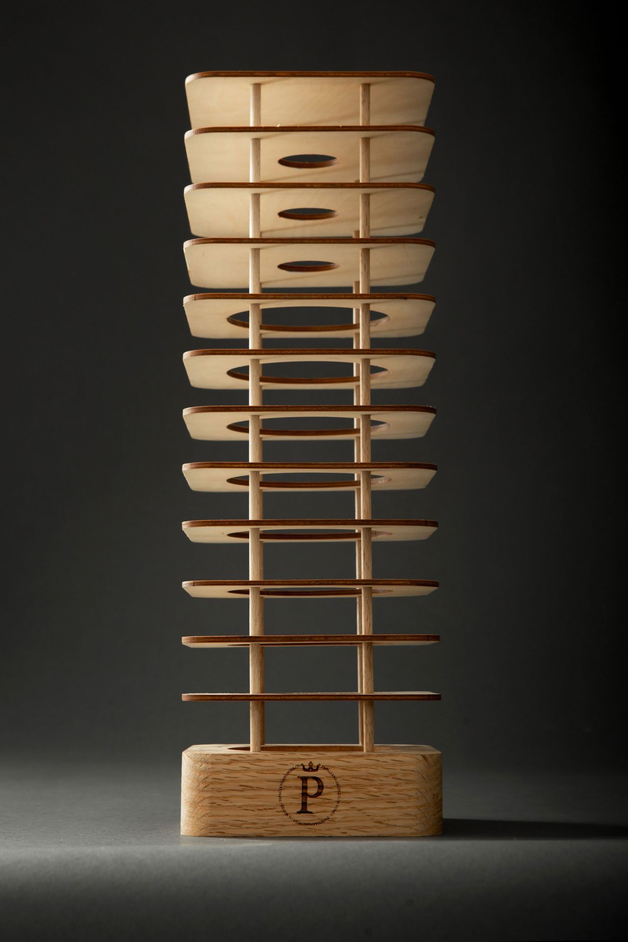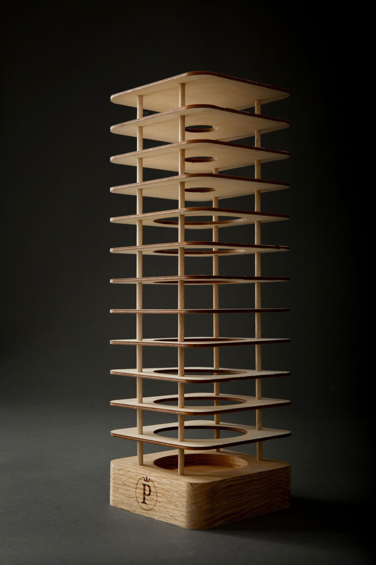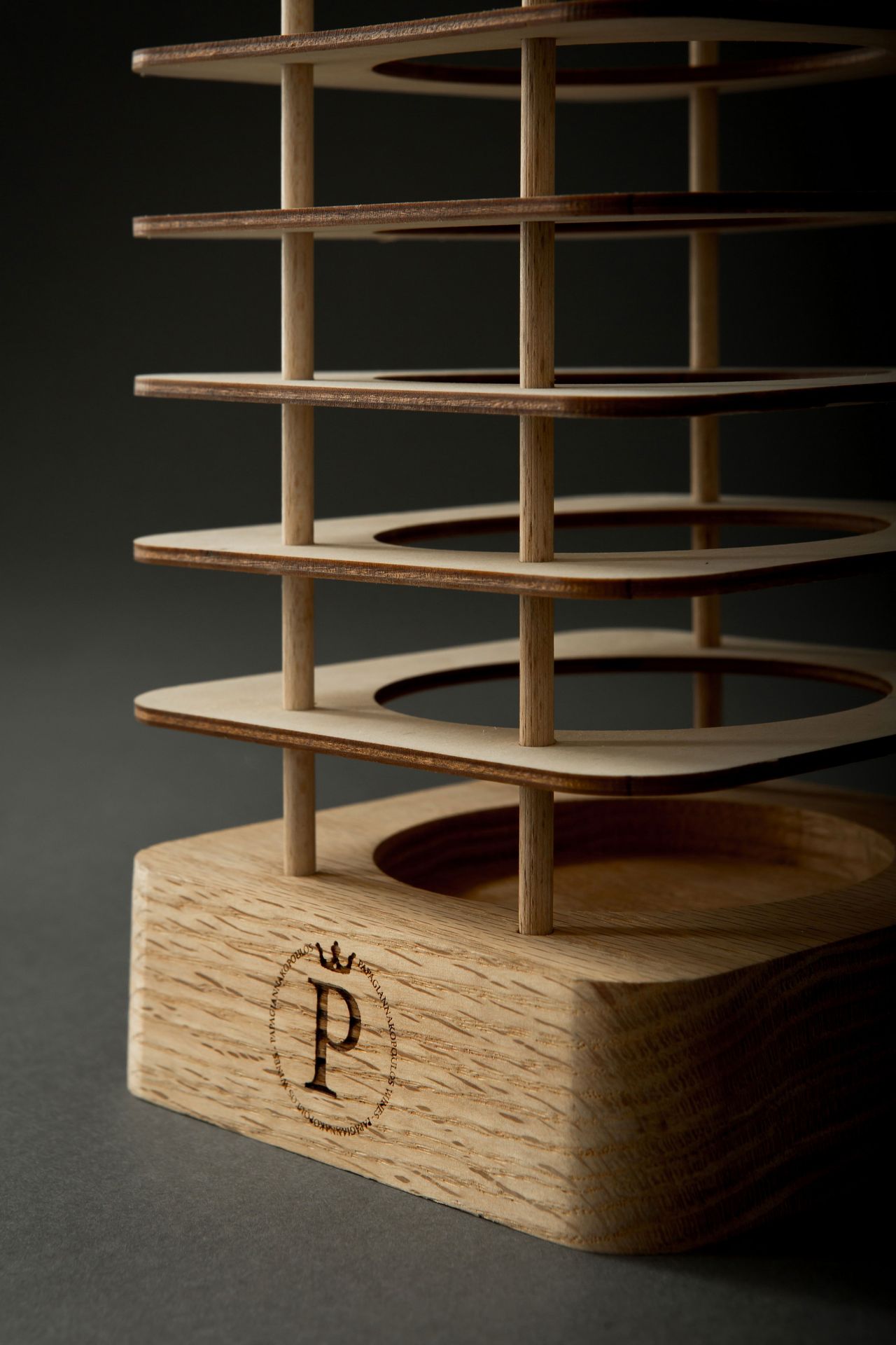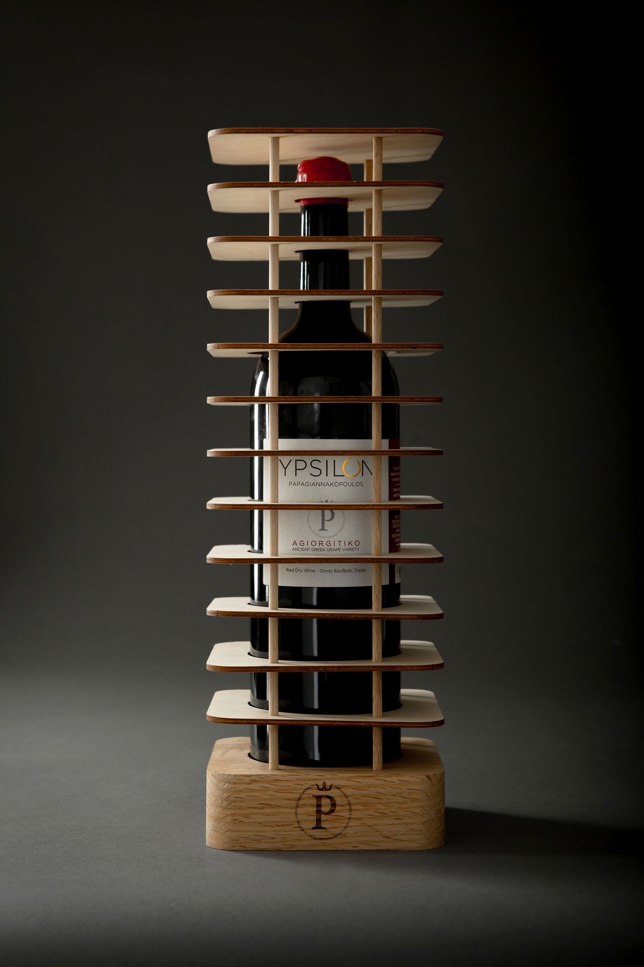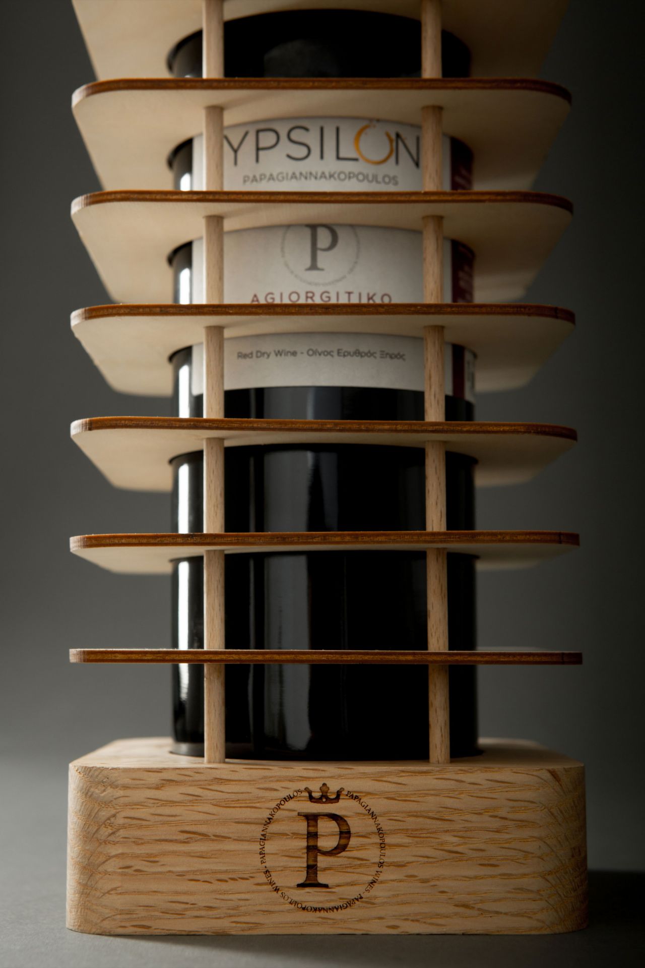 Our main concern in the construction of this item, was the design of a packaging that would highlight the product and at the same time guarantee its safe transport abroad. We used solid oak for the base, a kind of wood that is directly linked to the winery and the manufacture of aging barrels, and birch plywood for the rest of the packaging. The upper part of the packaging is composed with layers, with its outer shape of a square with rounded corners, while the inside follows the shape of the bottle. These layers are joined together by means of dowels which are fitted in at certain distances. The peculiarity of this design is that the identity of the wine is immediately visible but at the same time there is a playful mood on the shadows created by its layers. Agiorgitiko, for which the packaging was designed, is a dry red wine produced in Nemea, characterised for its aromas of strawberry, cherry and forest fruits.