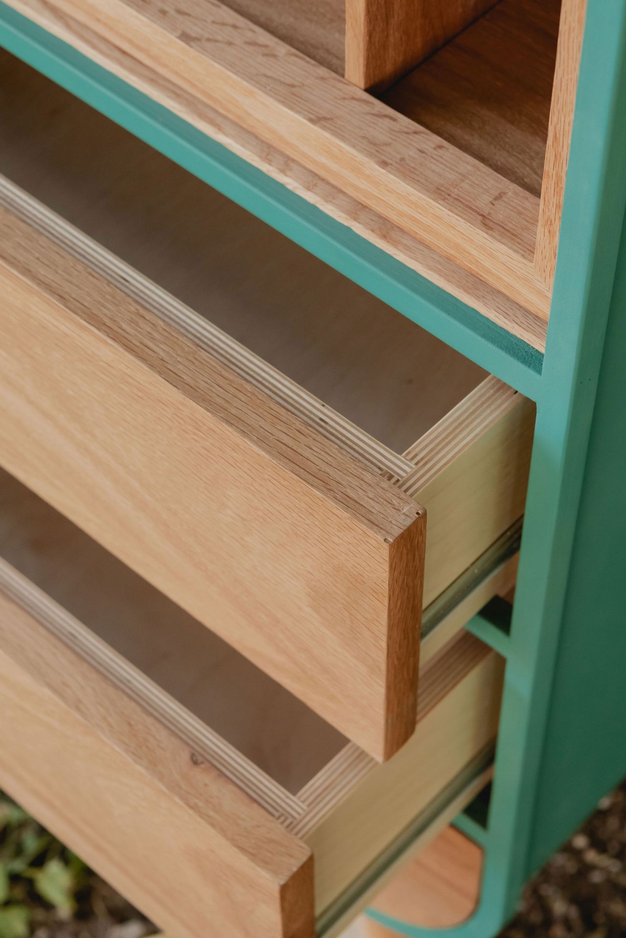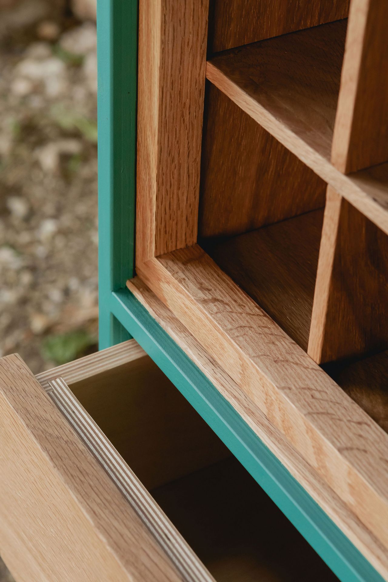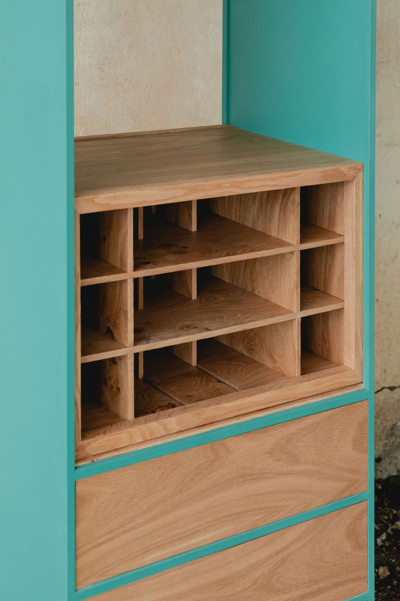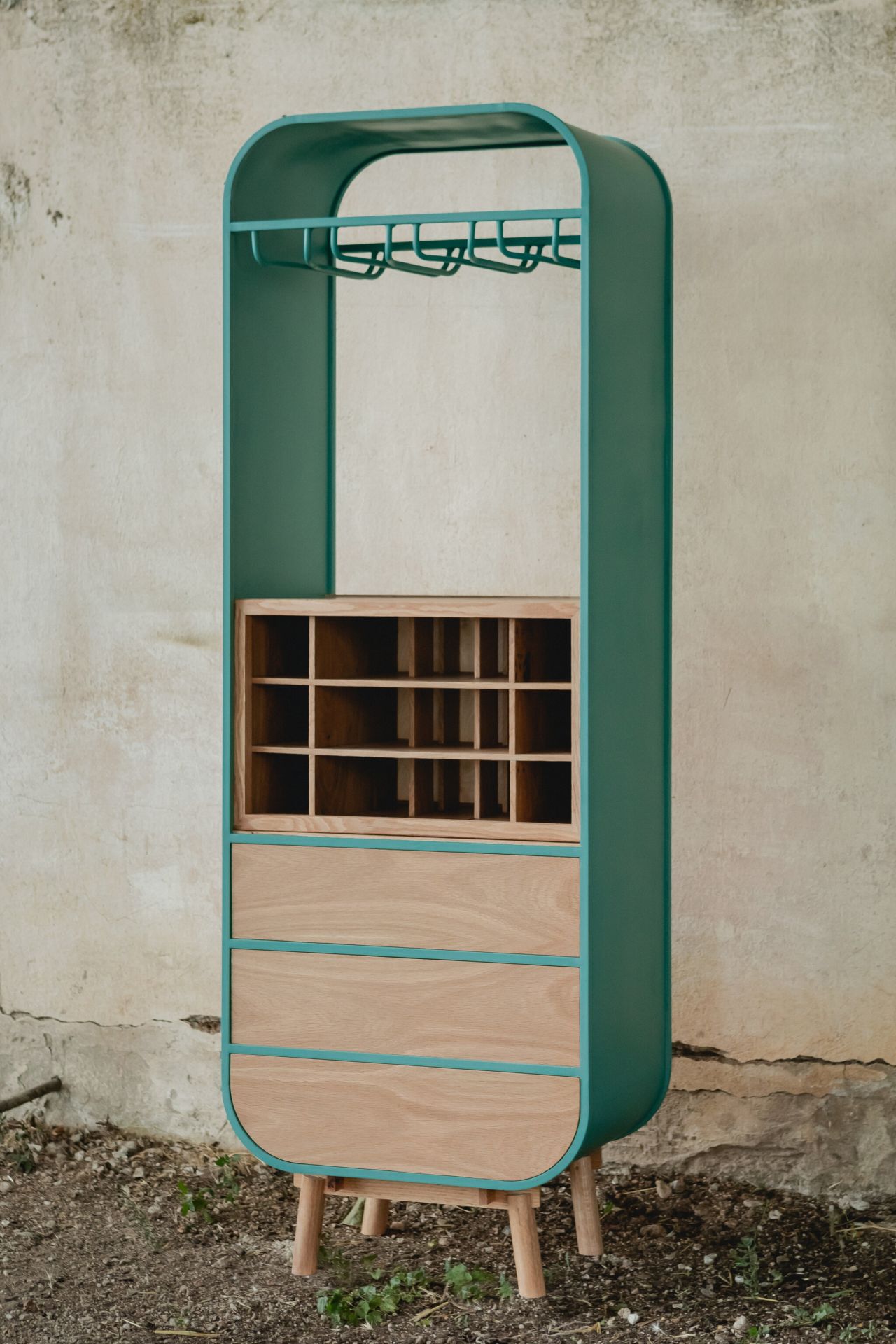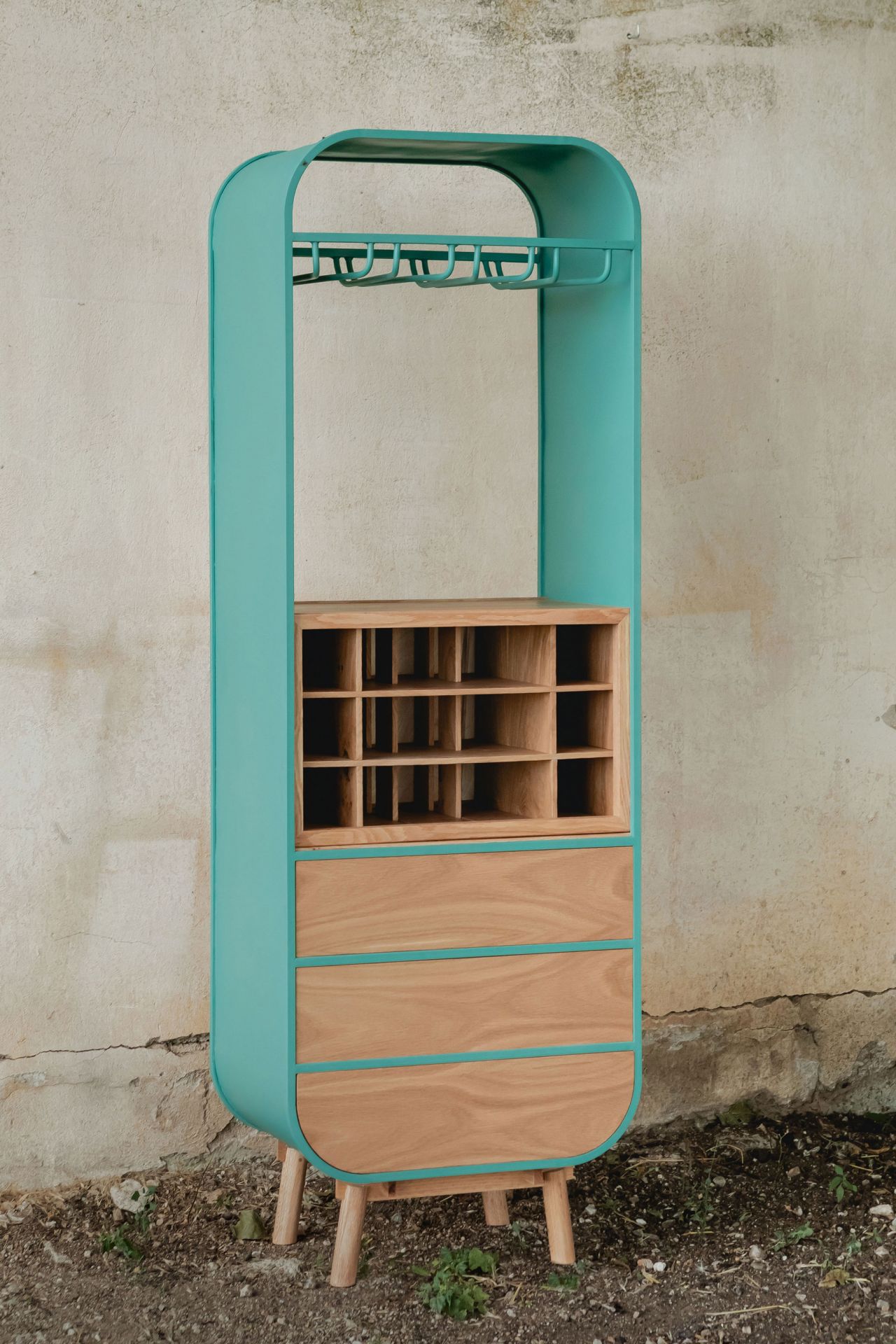 This project was created according to the design suggested by the client. The station is based on the combination of two heterogeneous materials, metal and American red oak. The frame of the cabin was entirely handmade of sheet metal painted in turquoise. Around the perimeter of the sheet metal arches, strained iron has been welded to give the sheet of the metal this almost semi-circular shape. On the top of this piece of furniture a strained iron "rack" has been mounted in order to hang wine glasses.In fact, it holds 12 glasses. Just below it, a drinks cellar made of lined veneer in MDF and solid oak timber follows, which could hold up almost 15 bottles. In addition, three drawers made of plywood have been added, while their fronts are made of MDF lined with the same veneer. The mechanisms used for the drawers are push open ones avoiding the use of knobs. The wooden parts of the construction have been finished with acrylic matte glaze ( non yellowing).